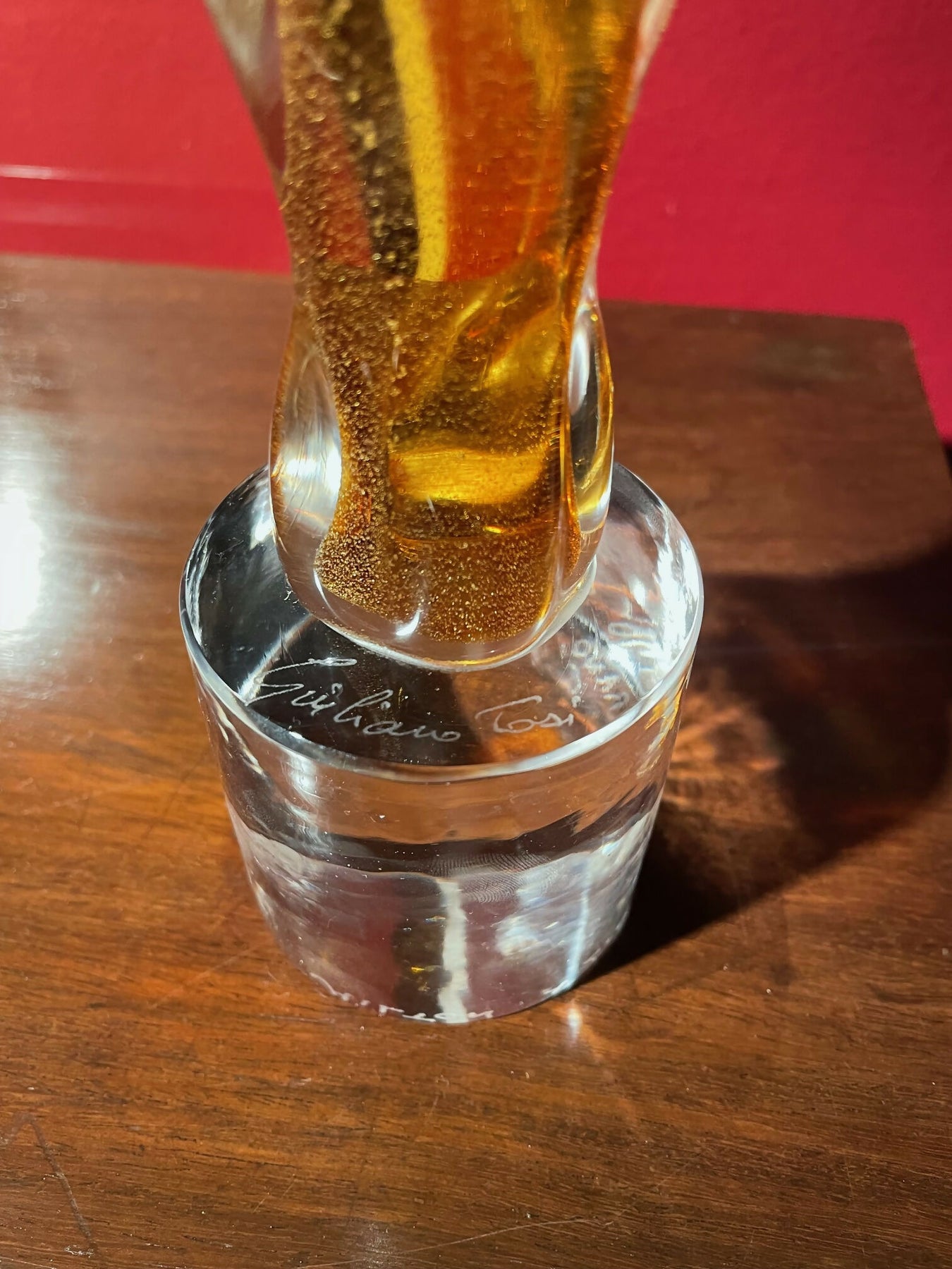 Deslumbrante escultura de vidro murano italiana assinada por Giuliano Tosi > “Os amantes”. Retrata um abraço entre dois amantes dourados, habilmente trabalhada com uma técnica que remonta à tradição vidreira de murano do século XV. (vidro + ouro), escultura rara com 35cm de altura. Em excelente estado de conservação sem lascas ou rachaduras.