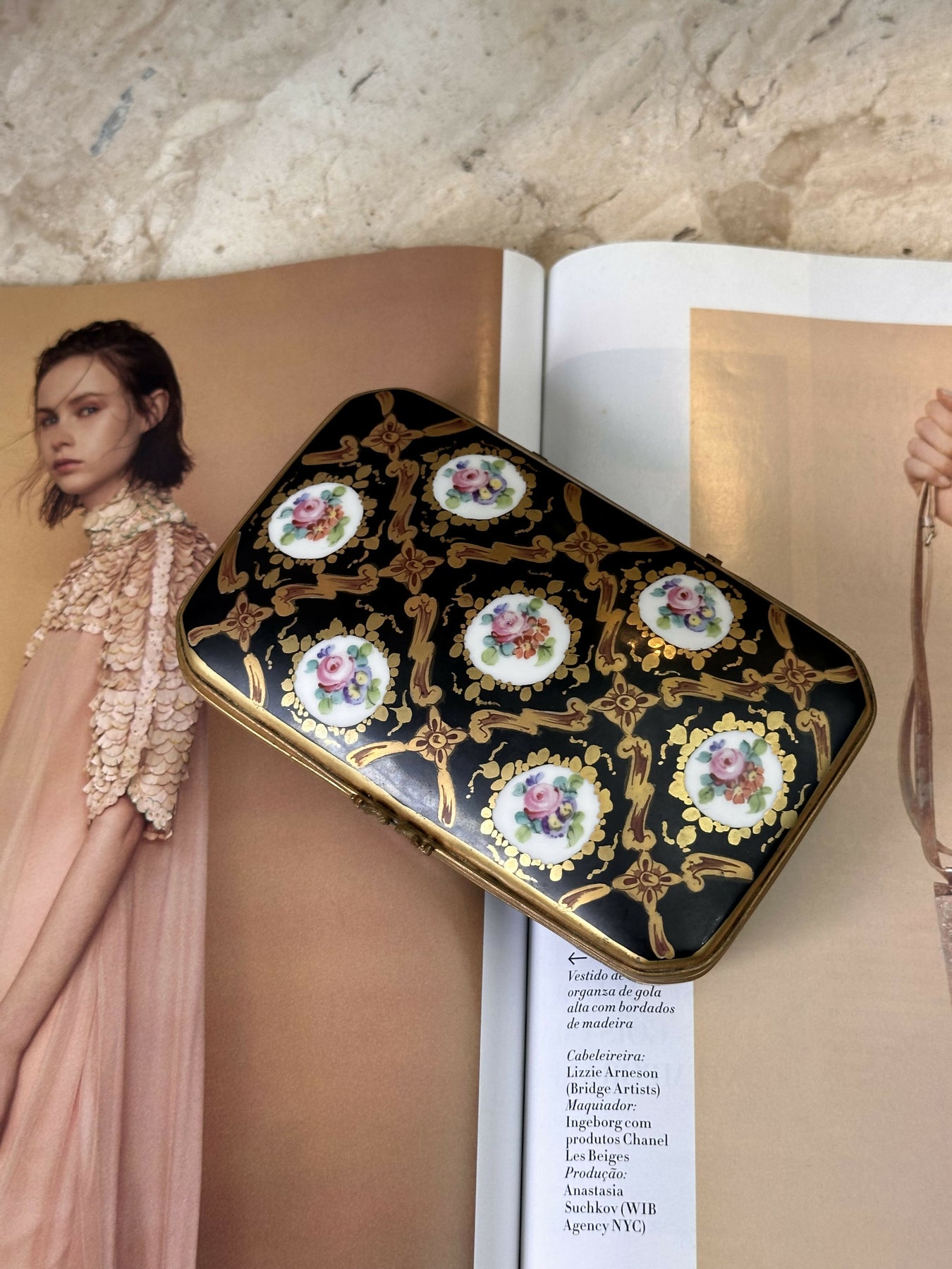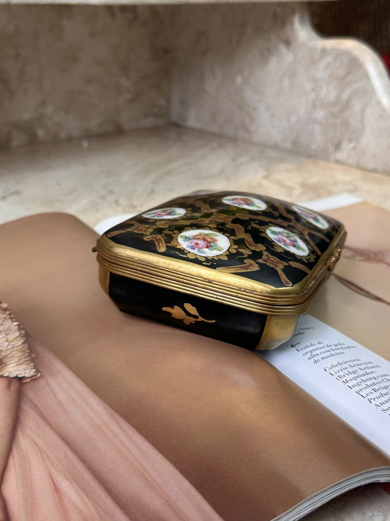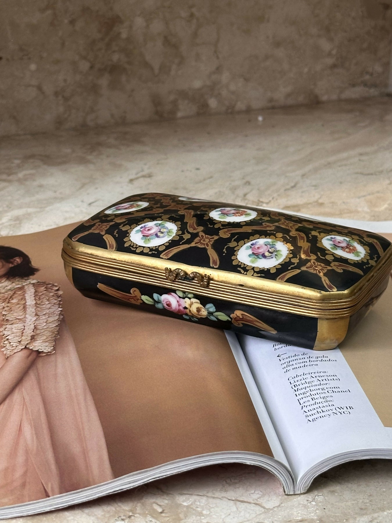 Espetáculo e maravilhosa antiga caixa porta-joias de porcelana francesa toda pintada à mão com flores delicadas