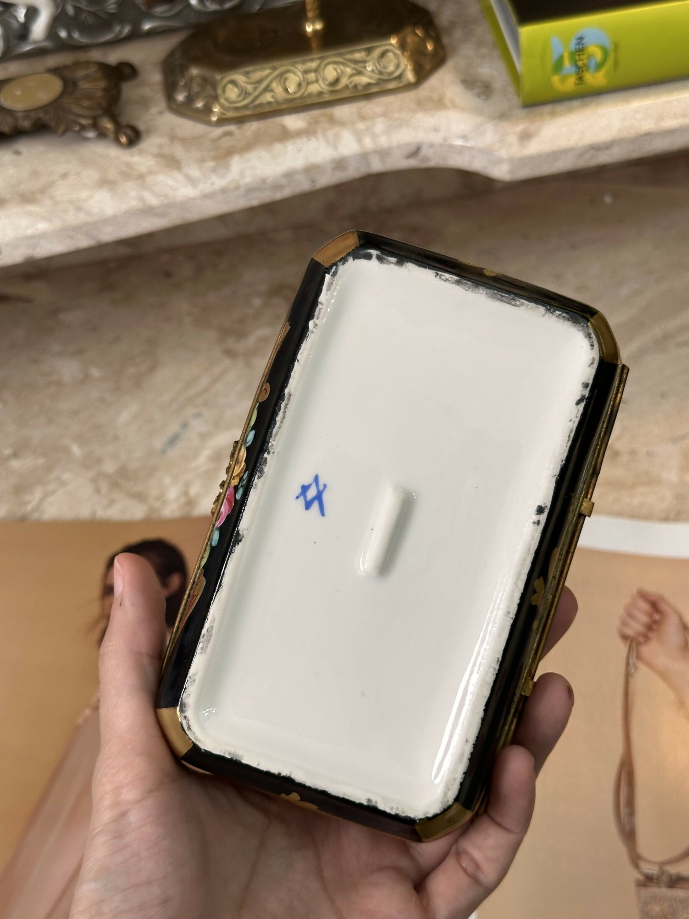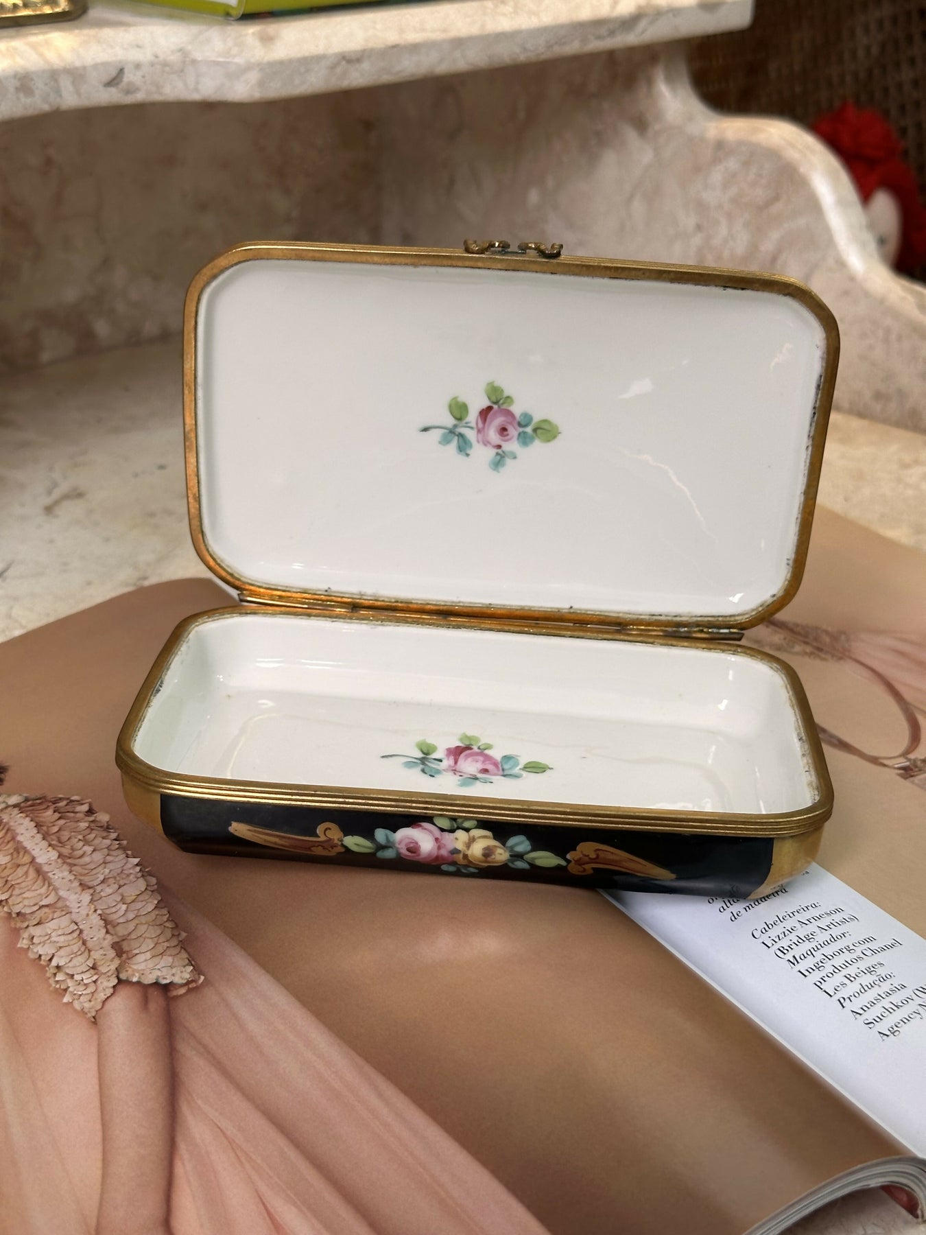 Espetáculo e maravilhosa antiga caixa porta-joias de porcelana francesa toda pintada à mão com flores delicadas ! Peça toda original .
