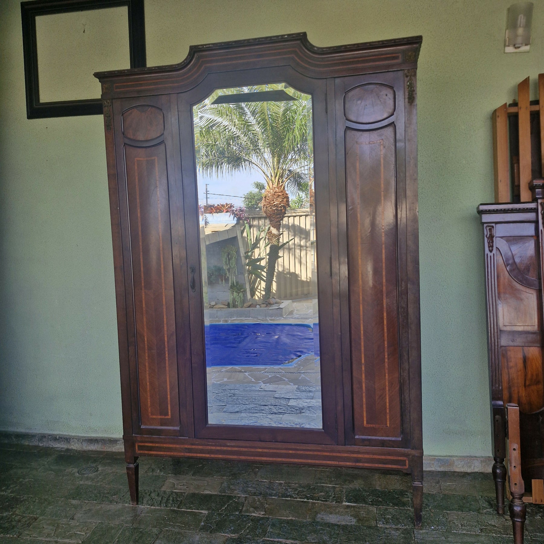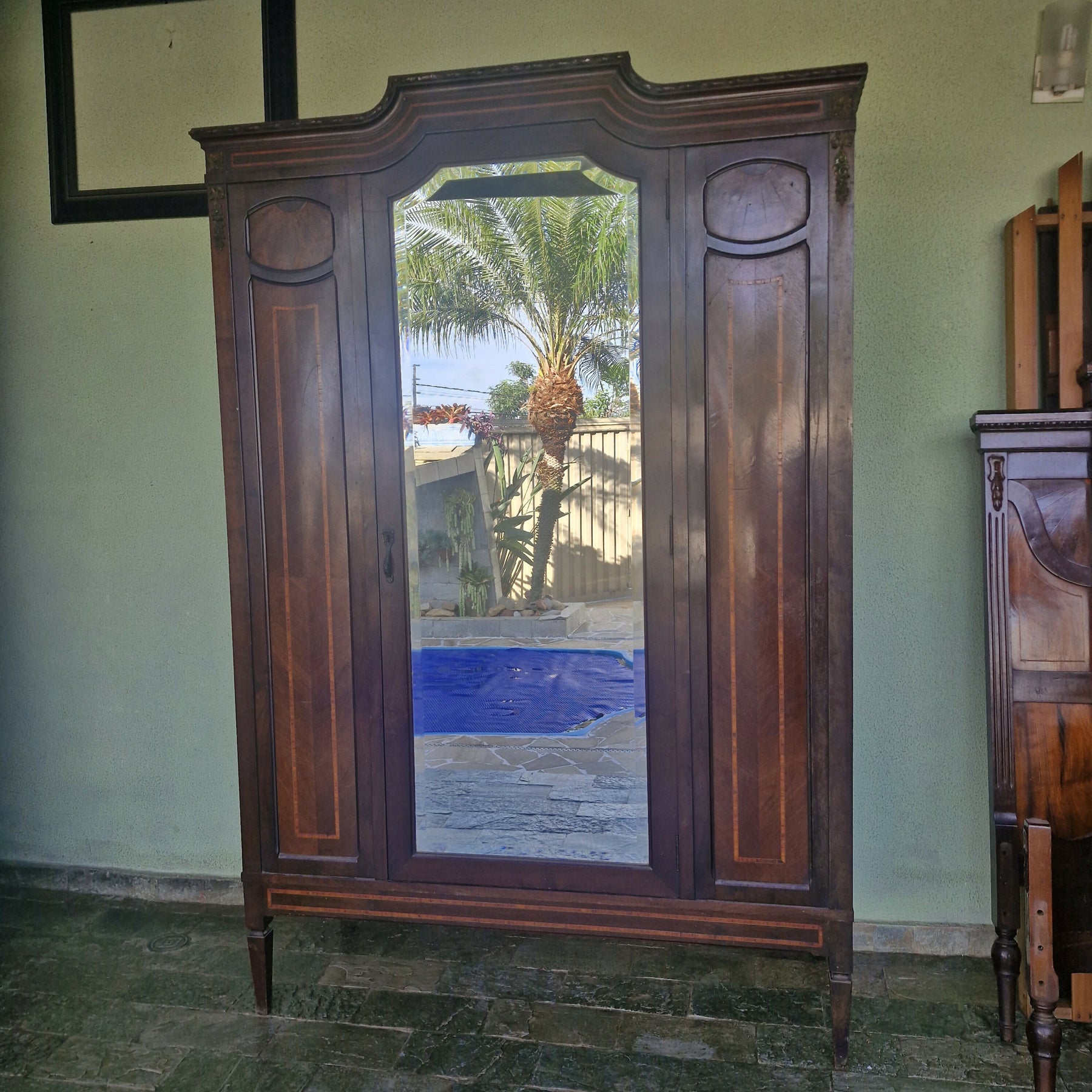 Belíssimo guarda roupa Art Nouveau com um porta central e espelho bisotado de corpo inteiro,  peça ricavem detalhes marchatados e aplique de Bronze com chave, peça para pronta entrega.