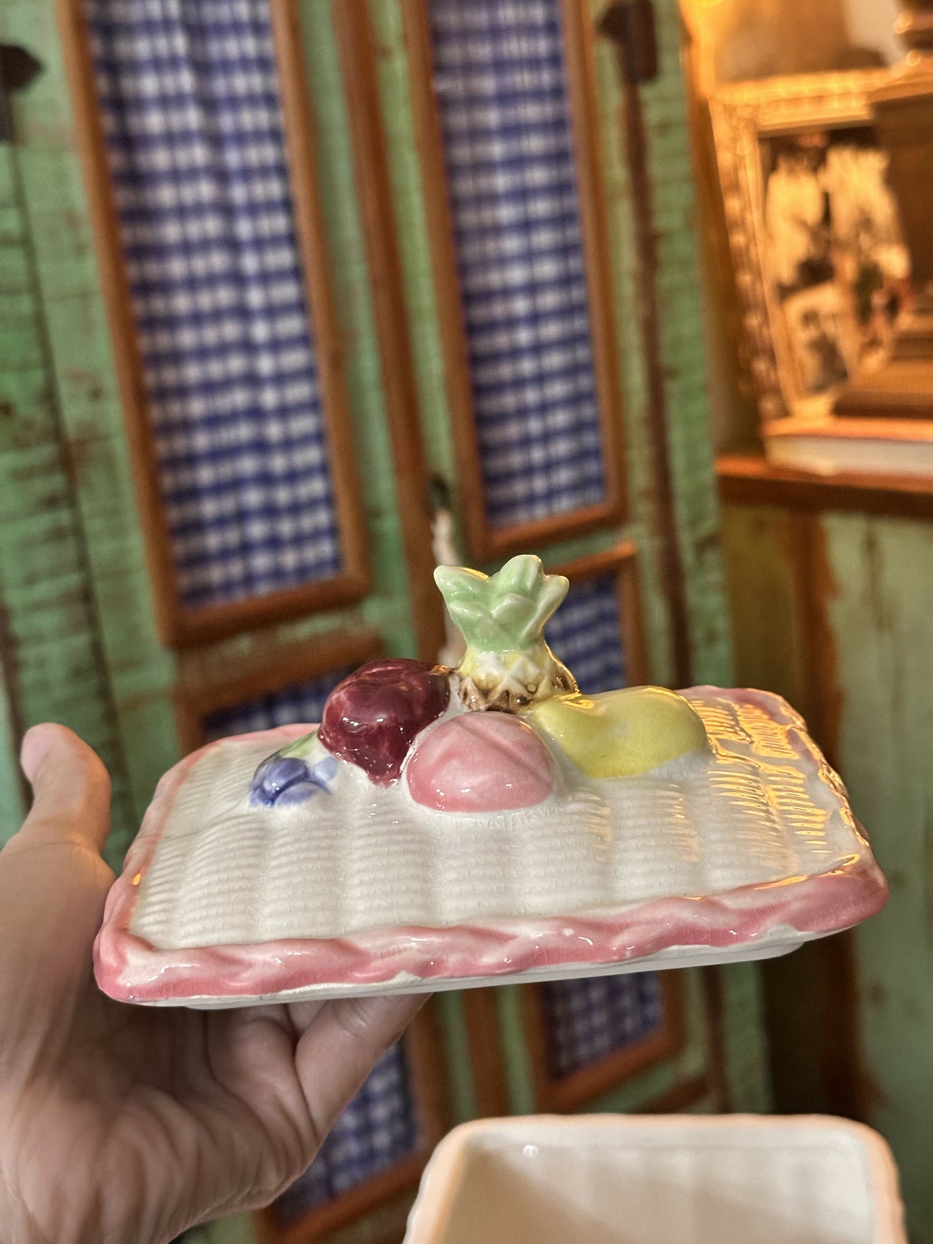 Lindeza de biscoiteira / potiche vintage japonês - com delicadas frutinhas na tampa . Toda vitrificada e encantadora para deixar uma cozinha cheia de nostalgia .