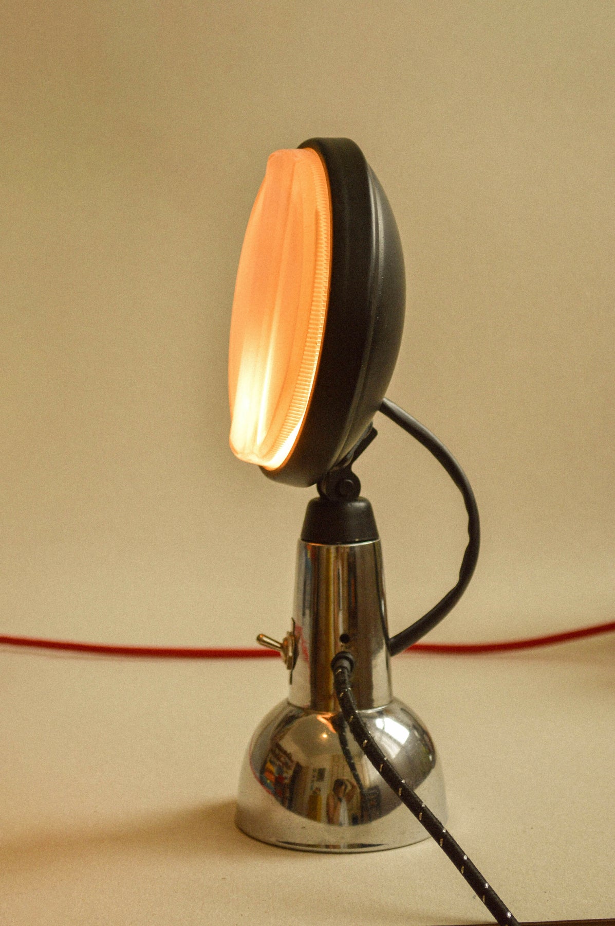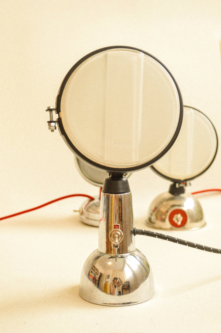 luminárias criadas a partir de faróis automobilísticos antigos, revividos com peças de outras luminárias.