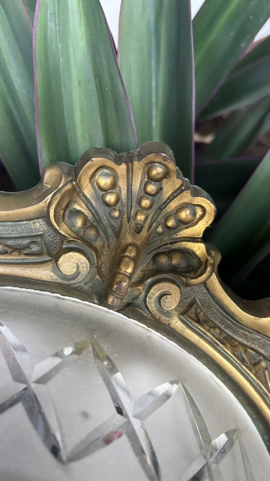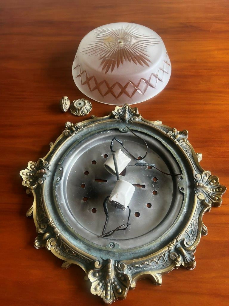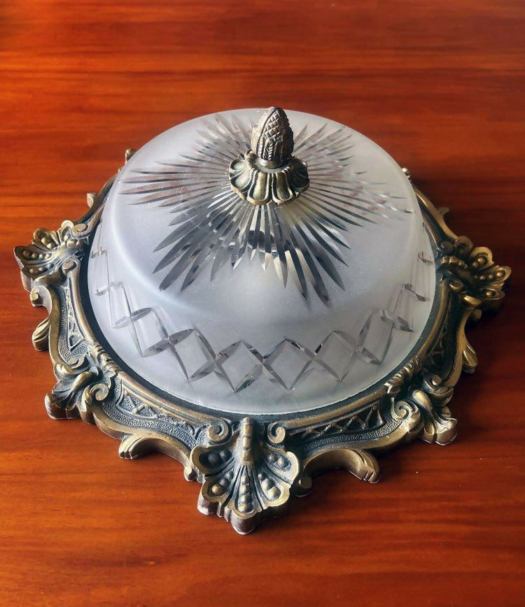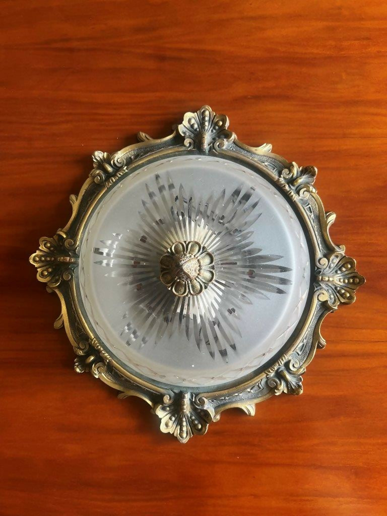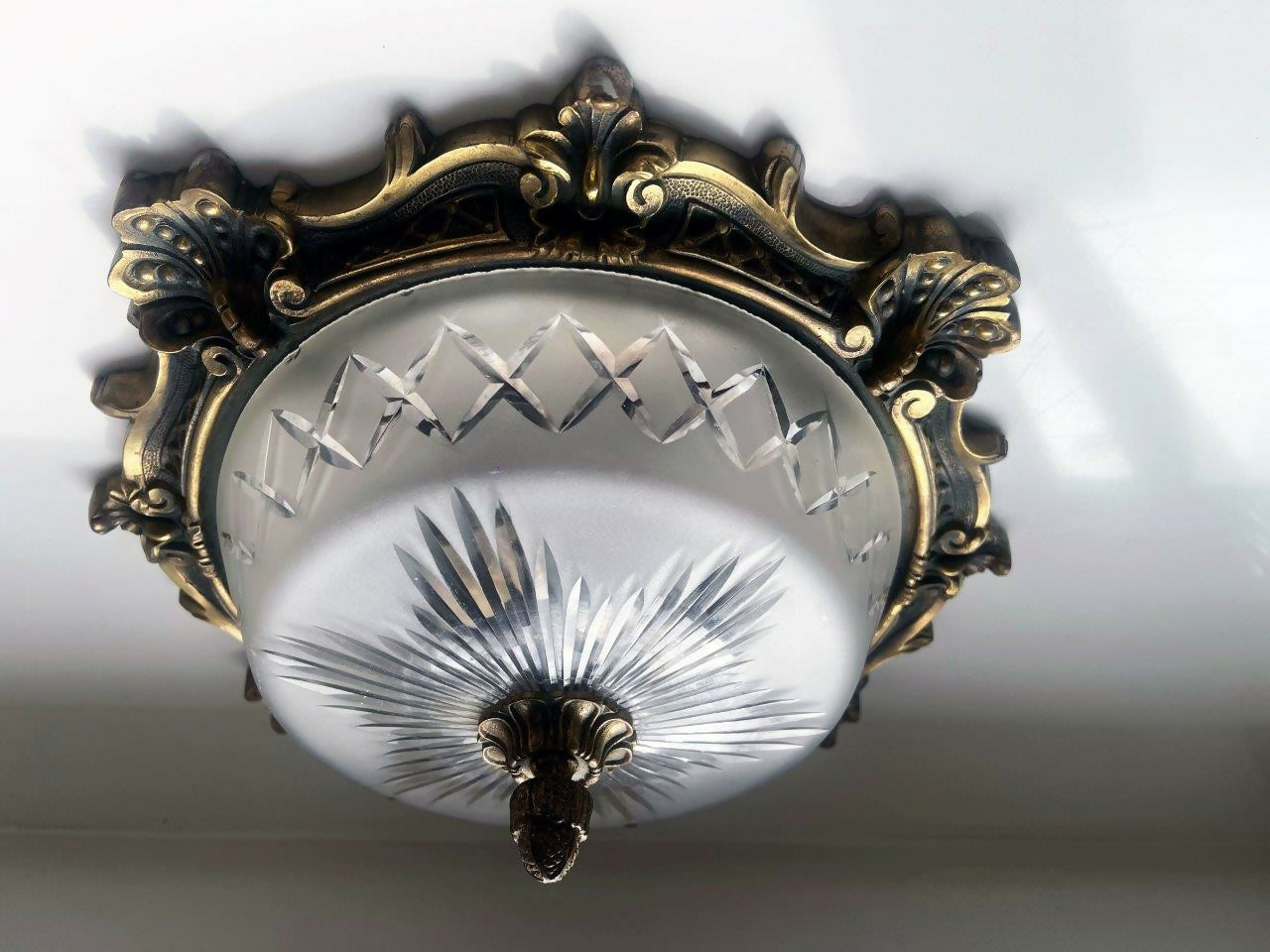 Antigo lustre de teto estilo antigo, redondo, estrutura em bronze ornamentado e cúpula em vidro decorado.
