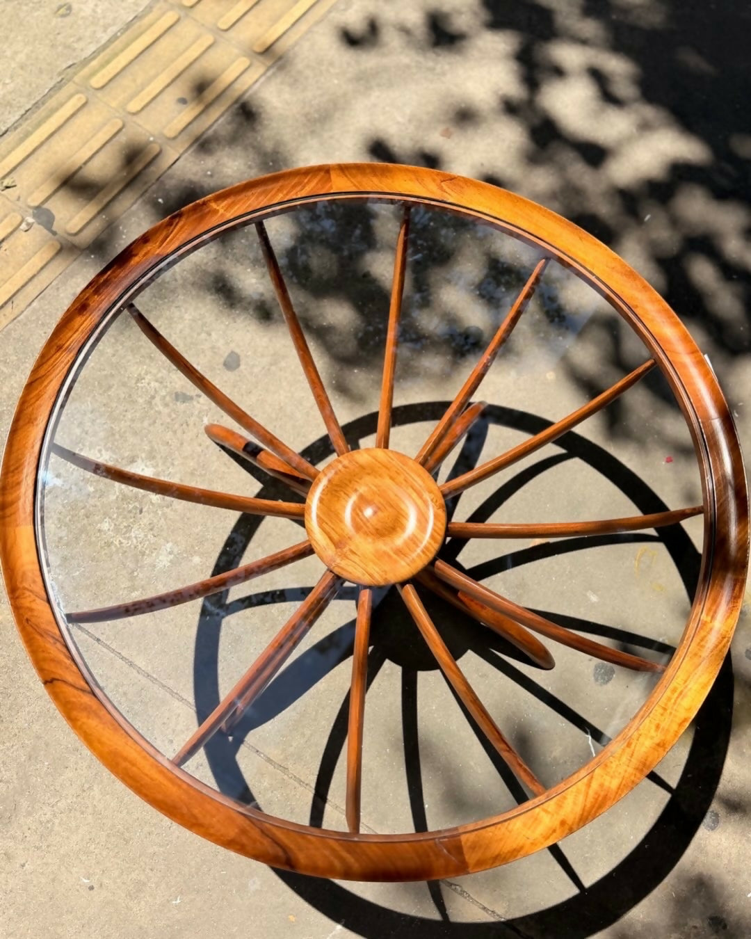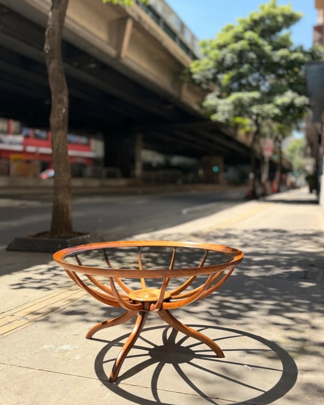 Mesa de centro “Aranha”, em madeira maciça de caviúna com tampo de vidro incolor. Design de Giuseppe Scapinelli.