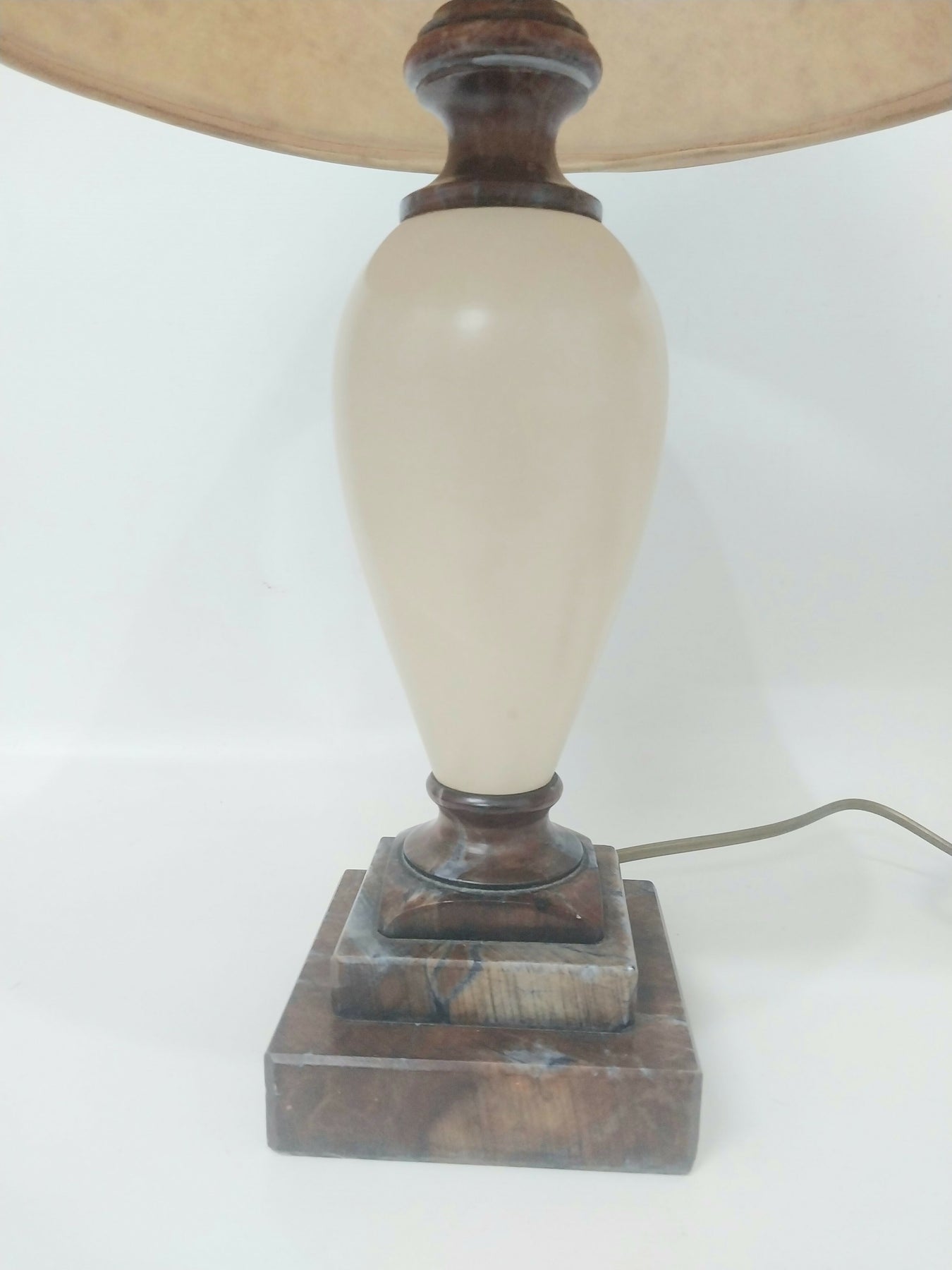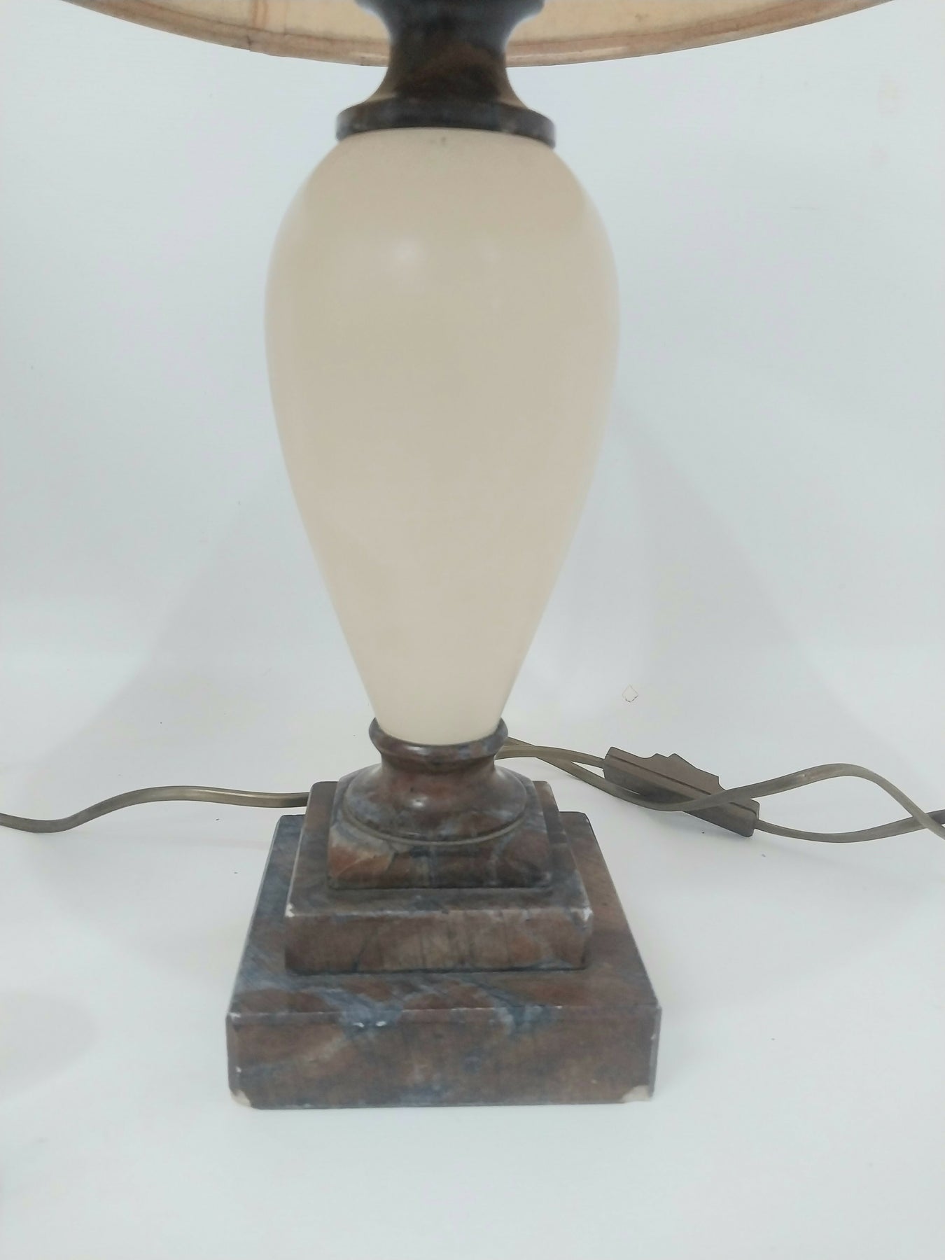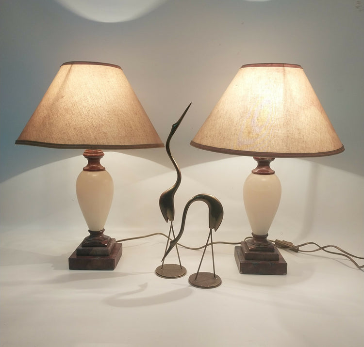 Requintado par de abajur espanhol em Alabastro e Mármore (manufatura Alabastro Aveiro), bases robustas em muito bom estado com algumas marcas do tempo. Cúpulas em tecido com marcas presentes.