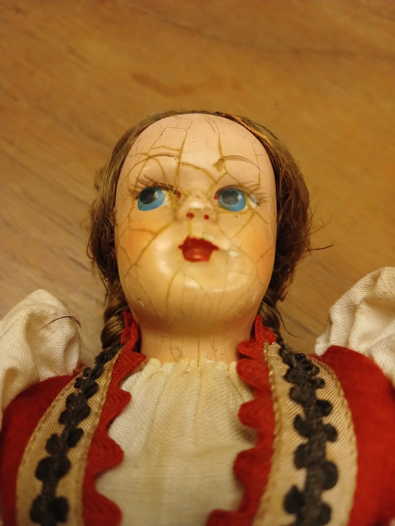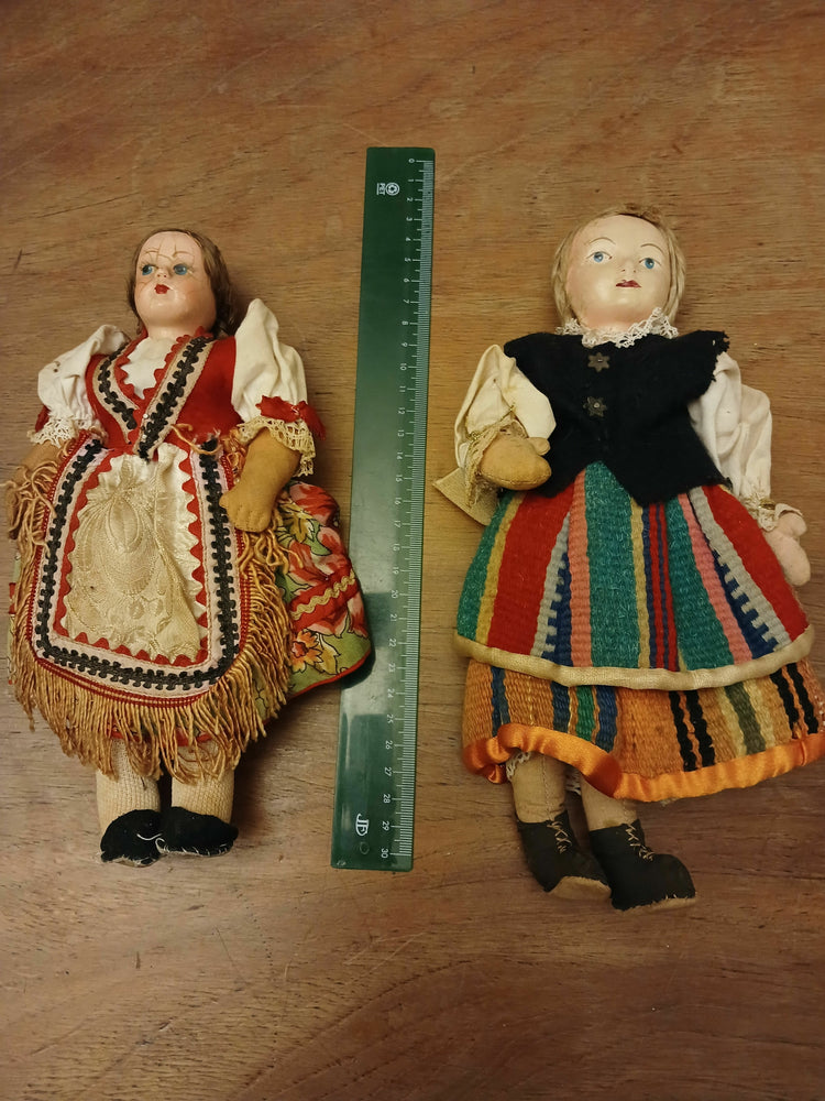 Par de bonecas antigas europeias em trajes típicos - massa de composição, possivelmente anos 1940. Apresentam marquinhas do tempo. Estou no Itaim Bibi, em SP; também posso entregar as peças na catraca de alguma estação de trem/metrô. Pagamento via pix.