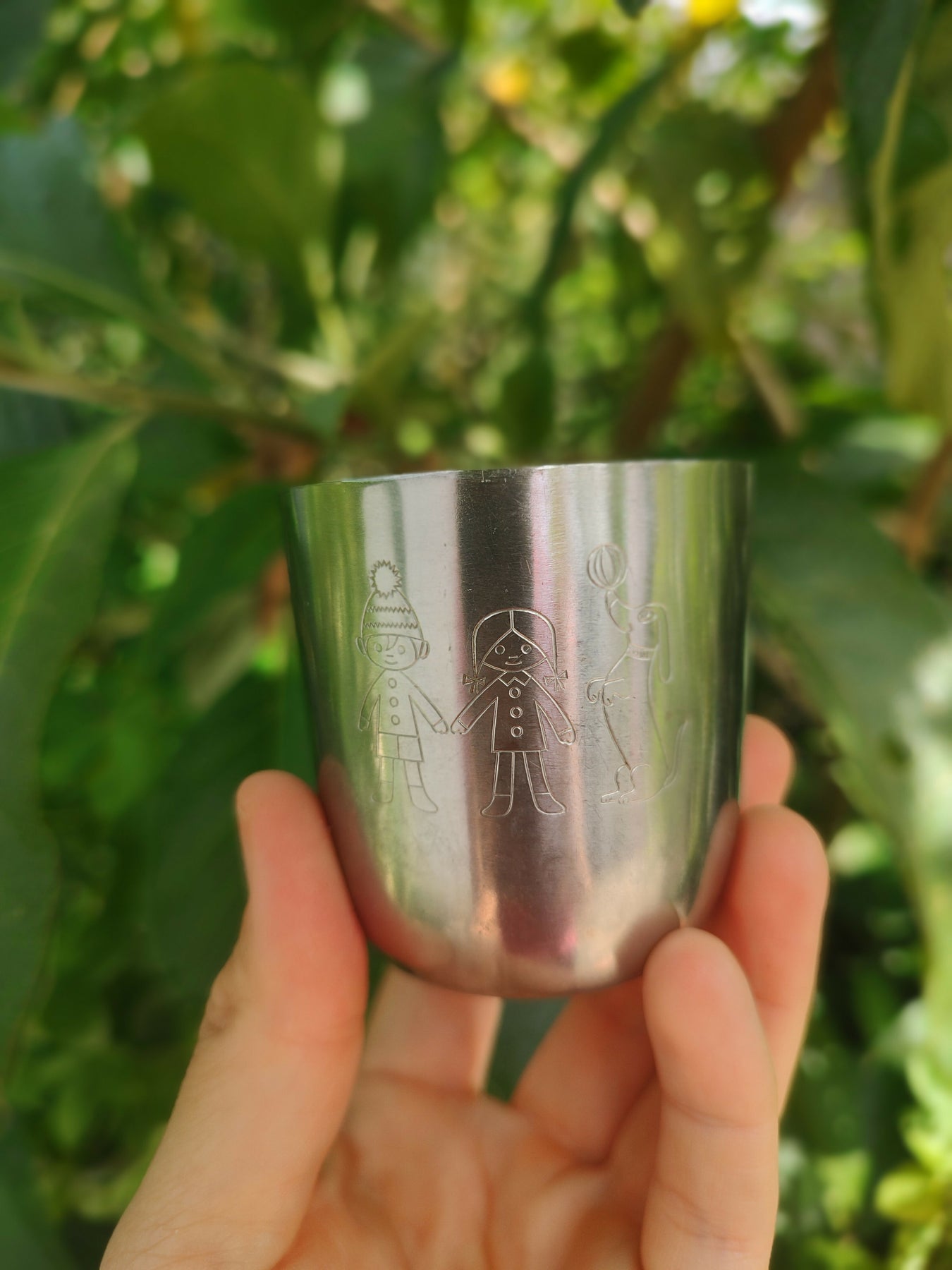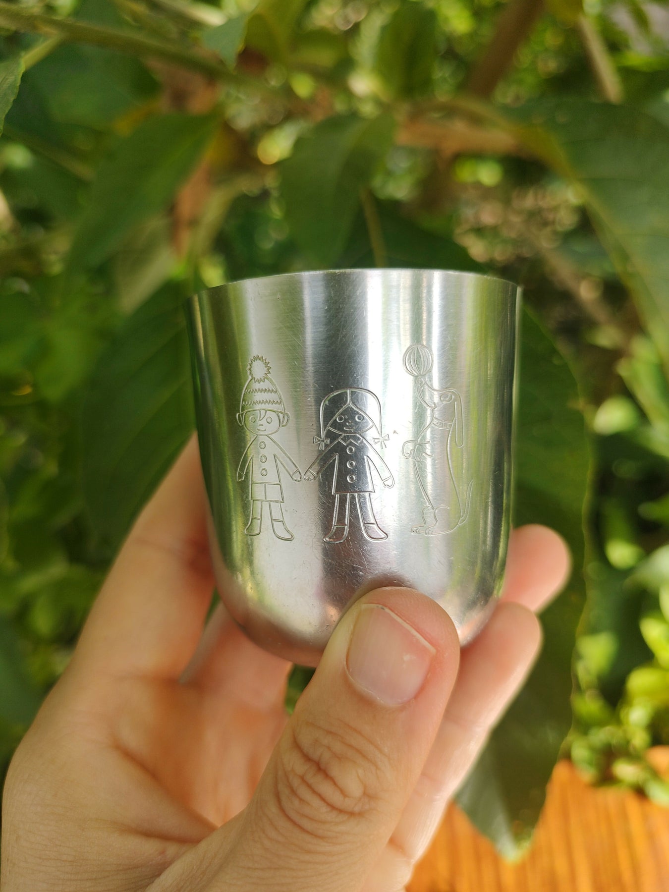 garimpo nostálgico cheio de memórias afetivas! 🤎 ✨ esse parzinho de copos em aço inox da Hércules, tem o desenho de duas crianças (um menino e uma menina) com seu cachorrinho salsicha levando um bola no nariz! ótimo para crianças mas também pra adultos que querem ressignificar o uso pra tomar uma pequena dose de licor, vodka.... e o que mais quiser!