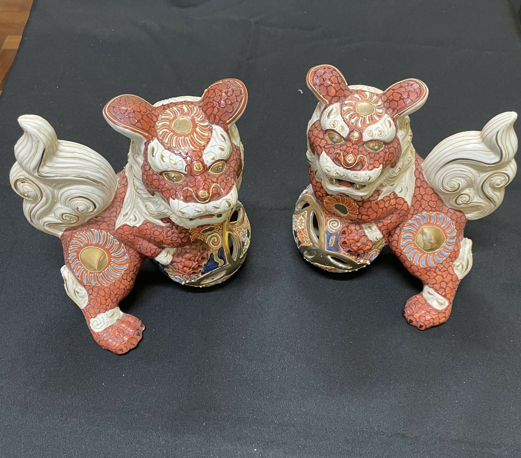Fu) em cerâmica Satsuma japonesa com detalhes em dourado. Tradicionalmente usados para proteger templos e casas, acreditando-se que afastam maus espíritos e trazem boa sorte. As estatuetas apresentam cores vermelha e bege, com detalhes em alto relevo e douramento. Este tipo de cerâmica com detalhes dourados é comum em peças vintage de estilo Satsuma.