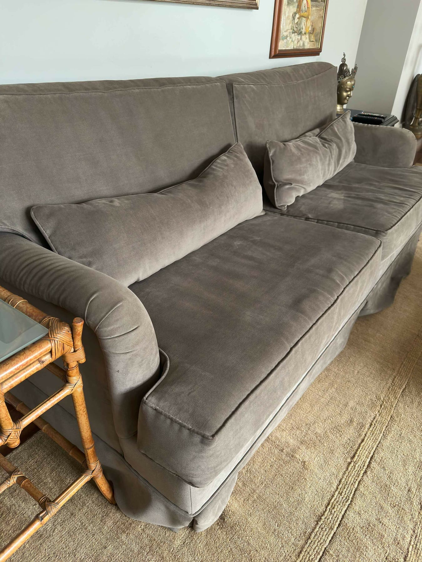 Sofá de 3 lugares medindo 2.10 x 0,90 de profundidade em veludo na cor Cinza com pouco uso.