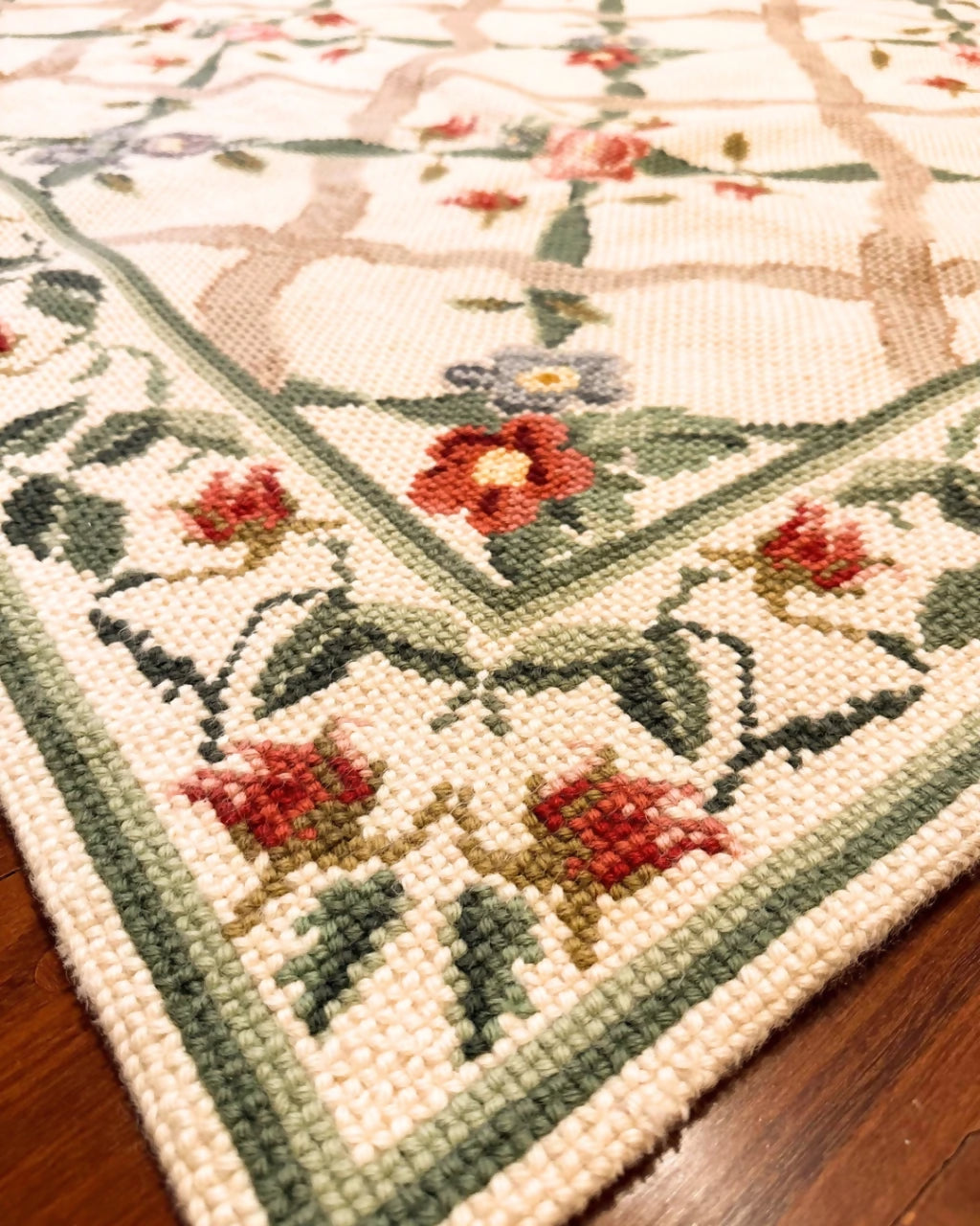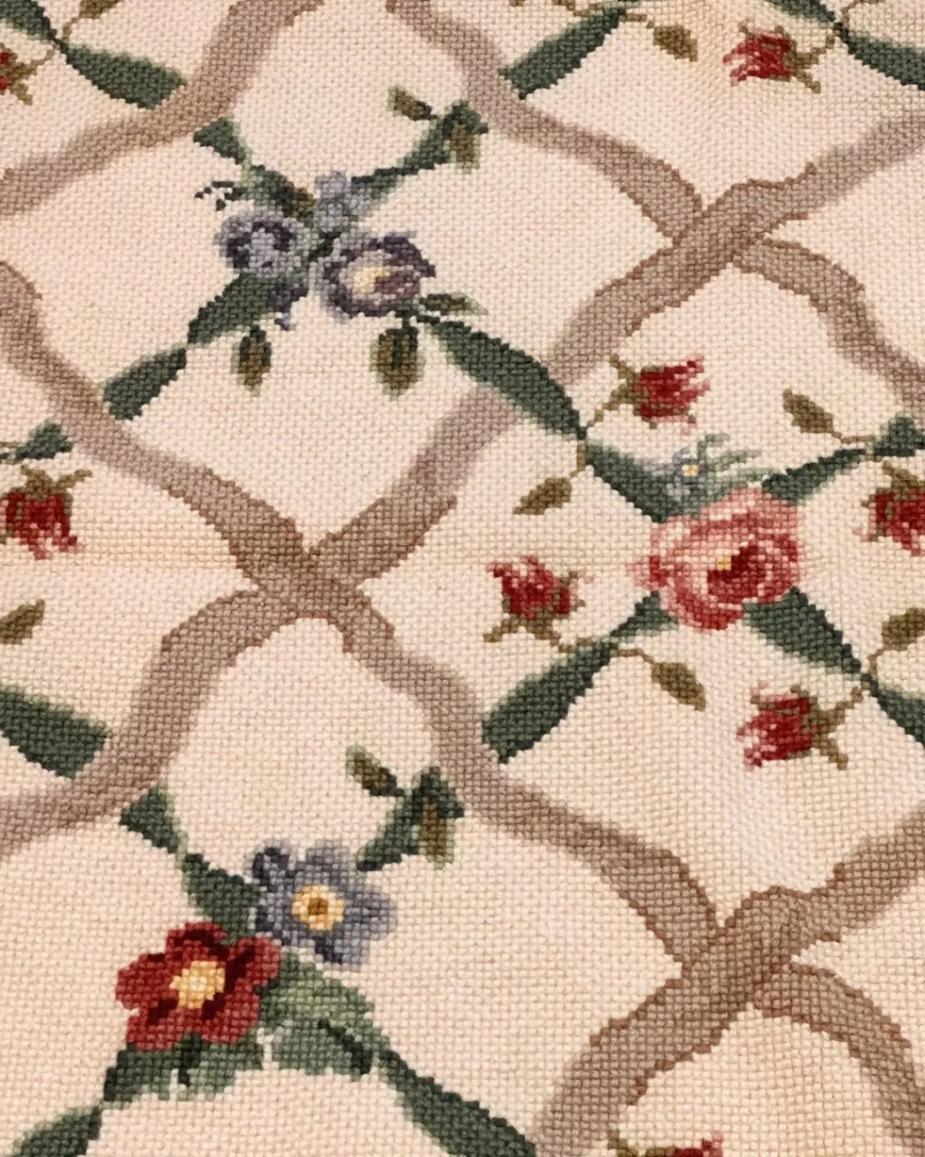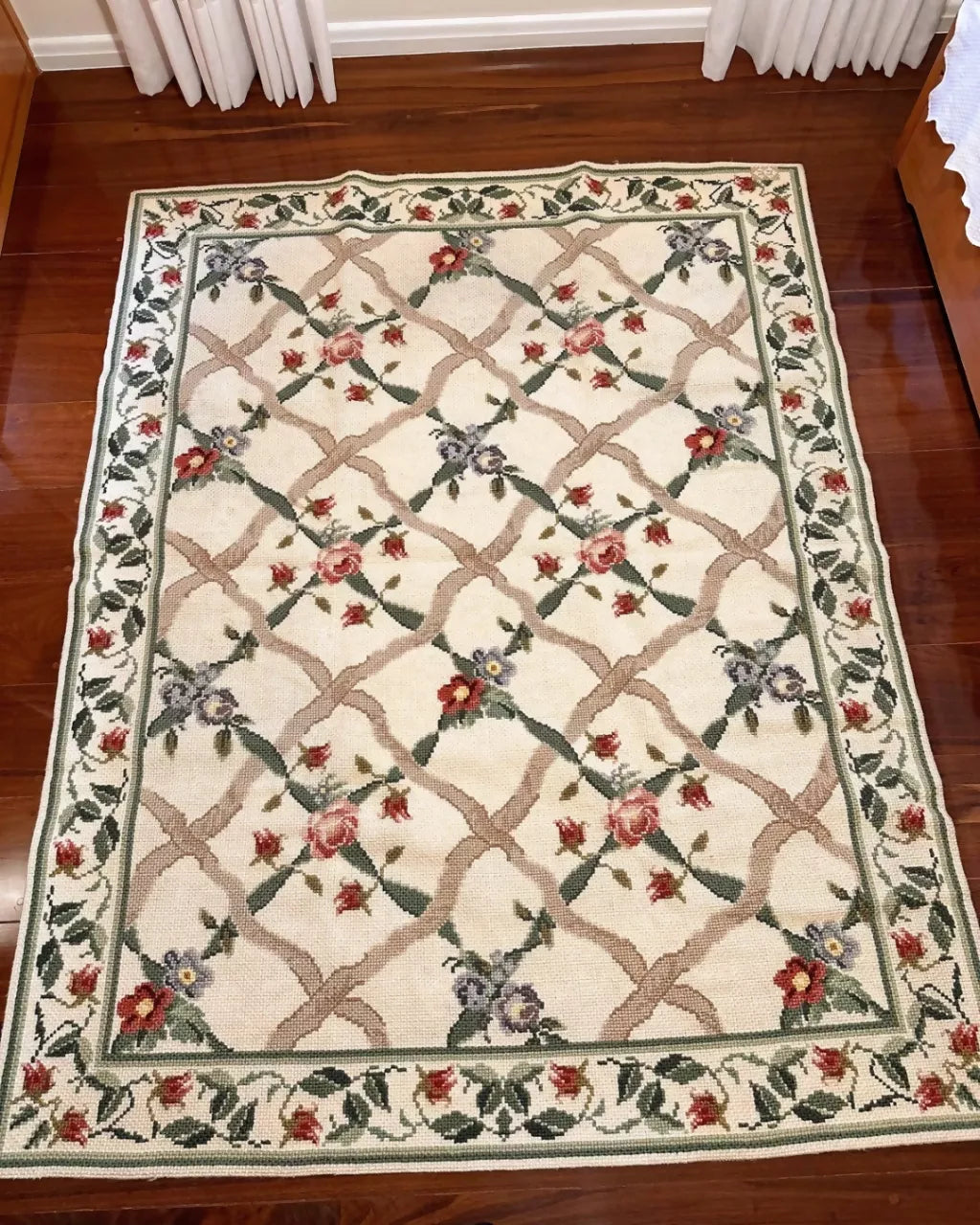 Tapete bordado à mão em lã, ponto Casa Caiada original de Recife - PE, com flores espalhadas e desenho de treliça em todo o campo, fundo creme. Em EXCELENTE estado, higienizado e forro limpo. Uma mega oportunidade.