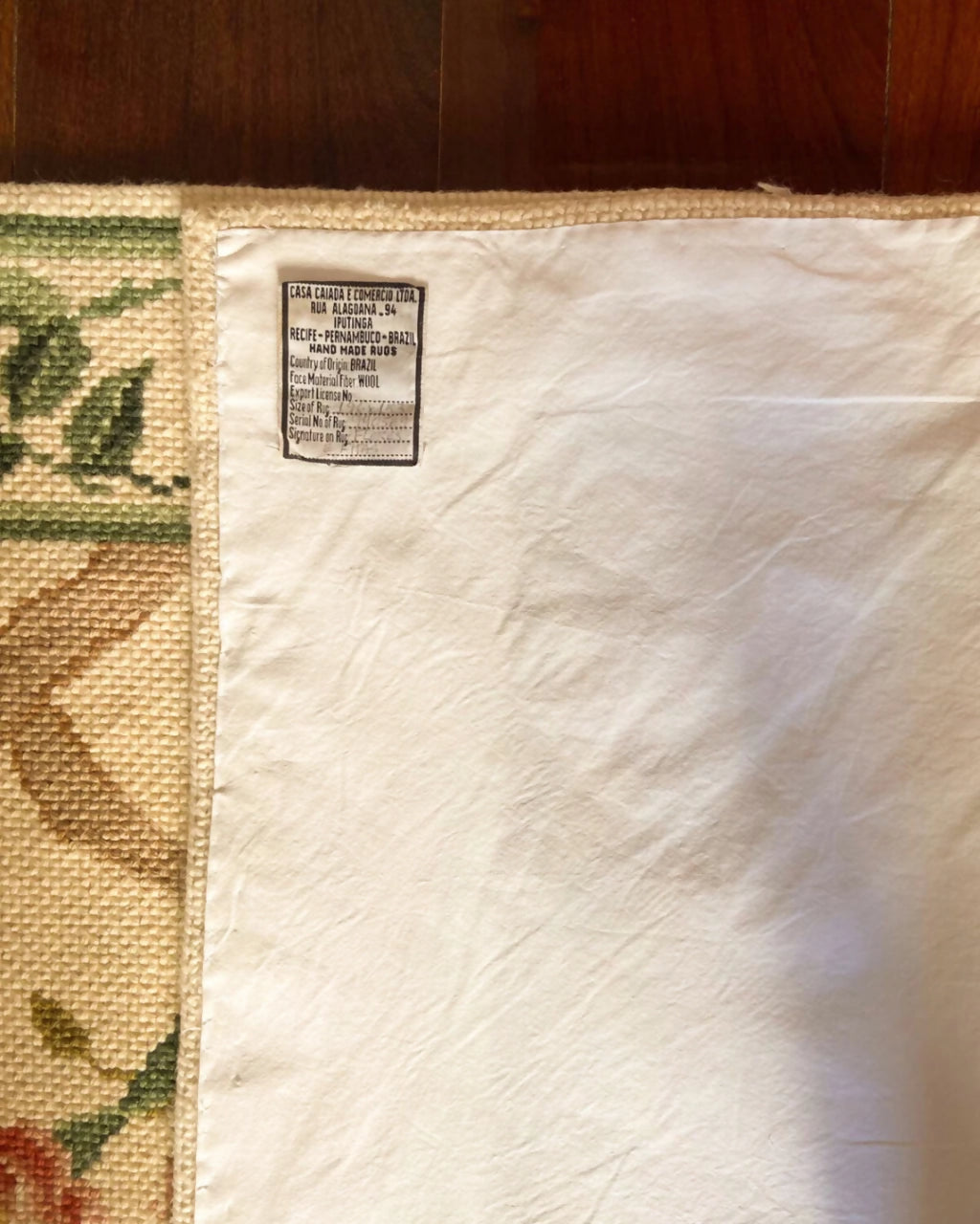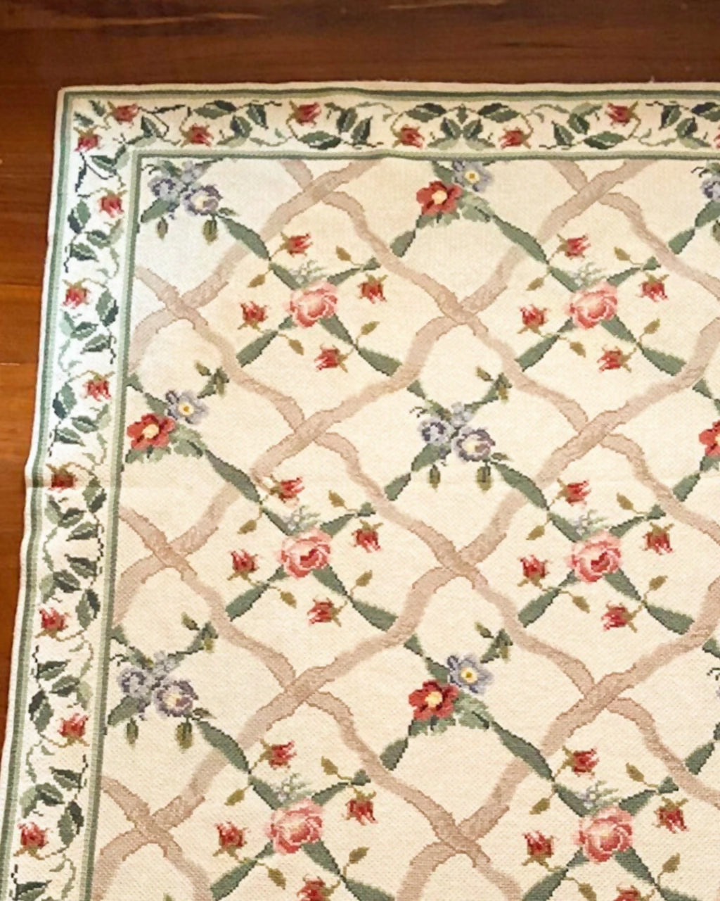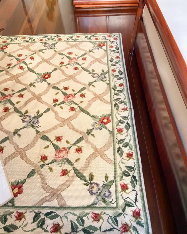 Tapete bordado à mão em lã, ponto Casa Caiada original de Recife - PE, com flores espalhadas e desenho de treliça em todo o campo, fundo creme. Em EXCELENTE estado, higienizado e forro limpo. Uma mega oportunidade.