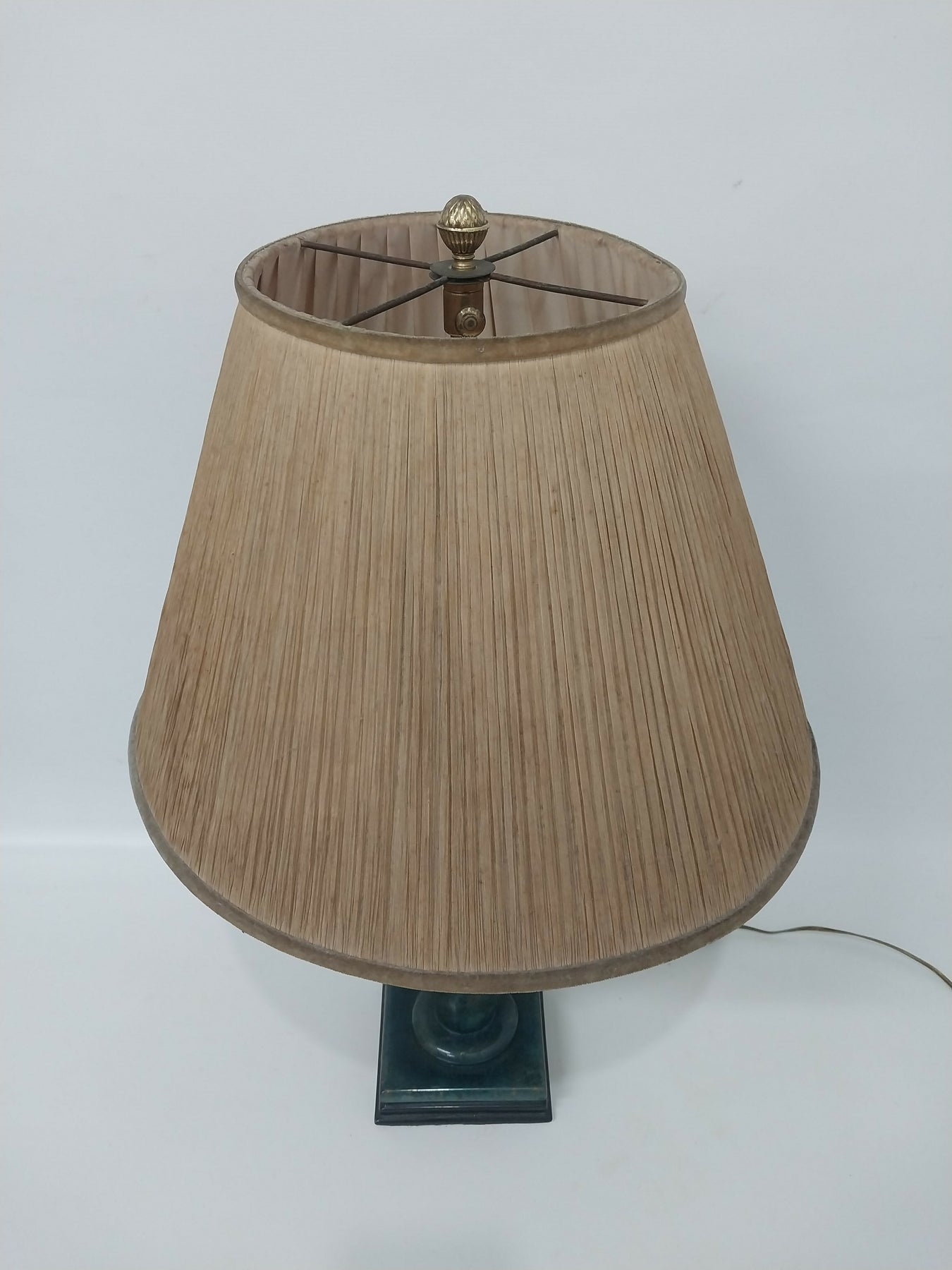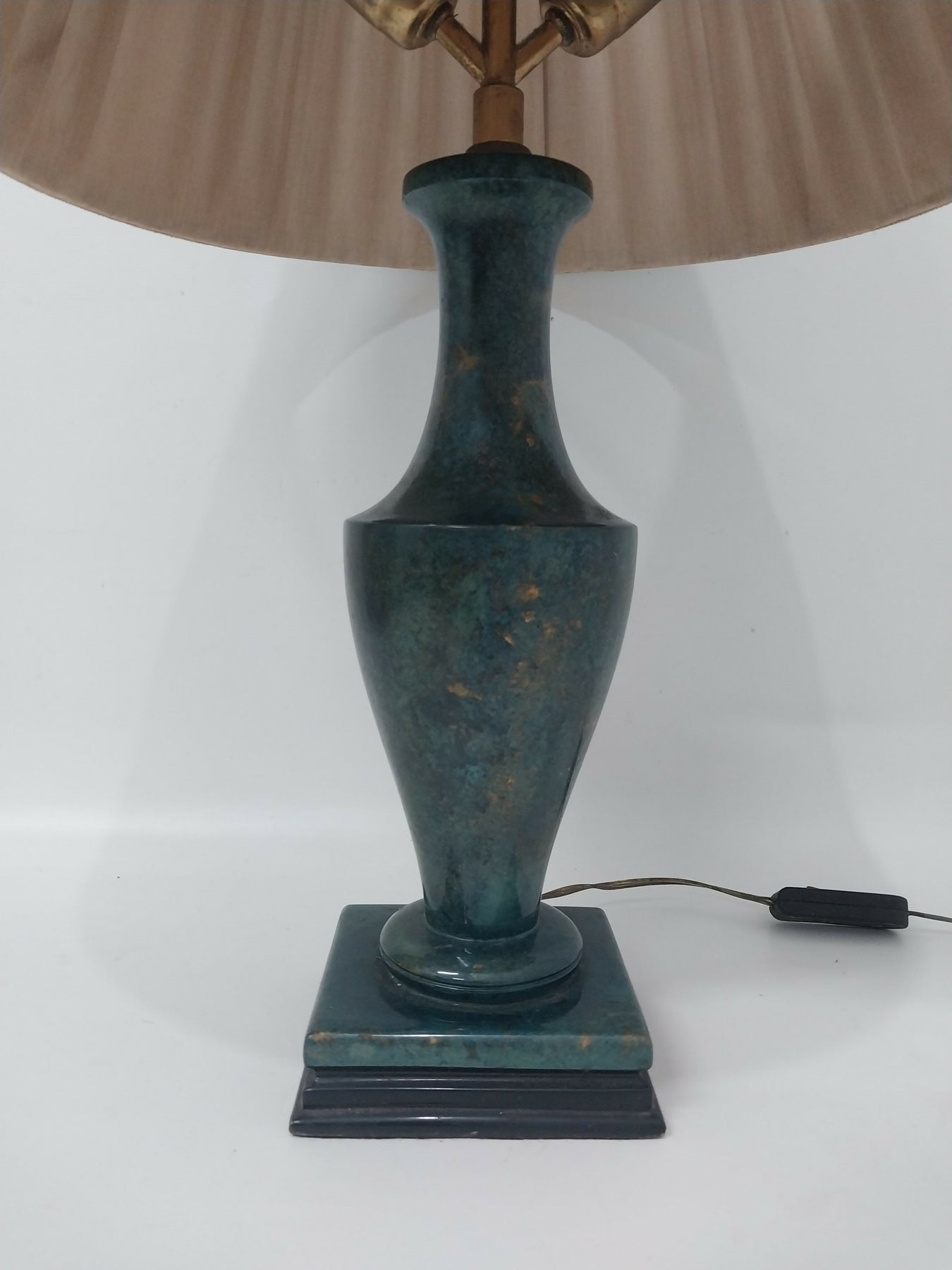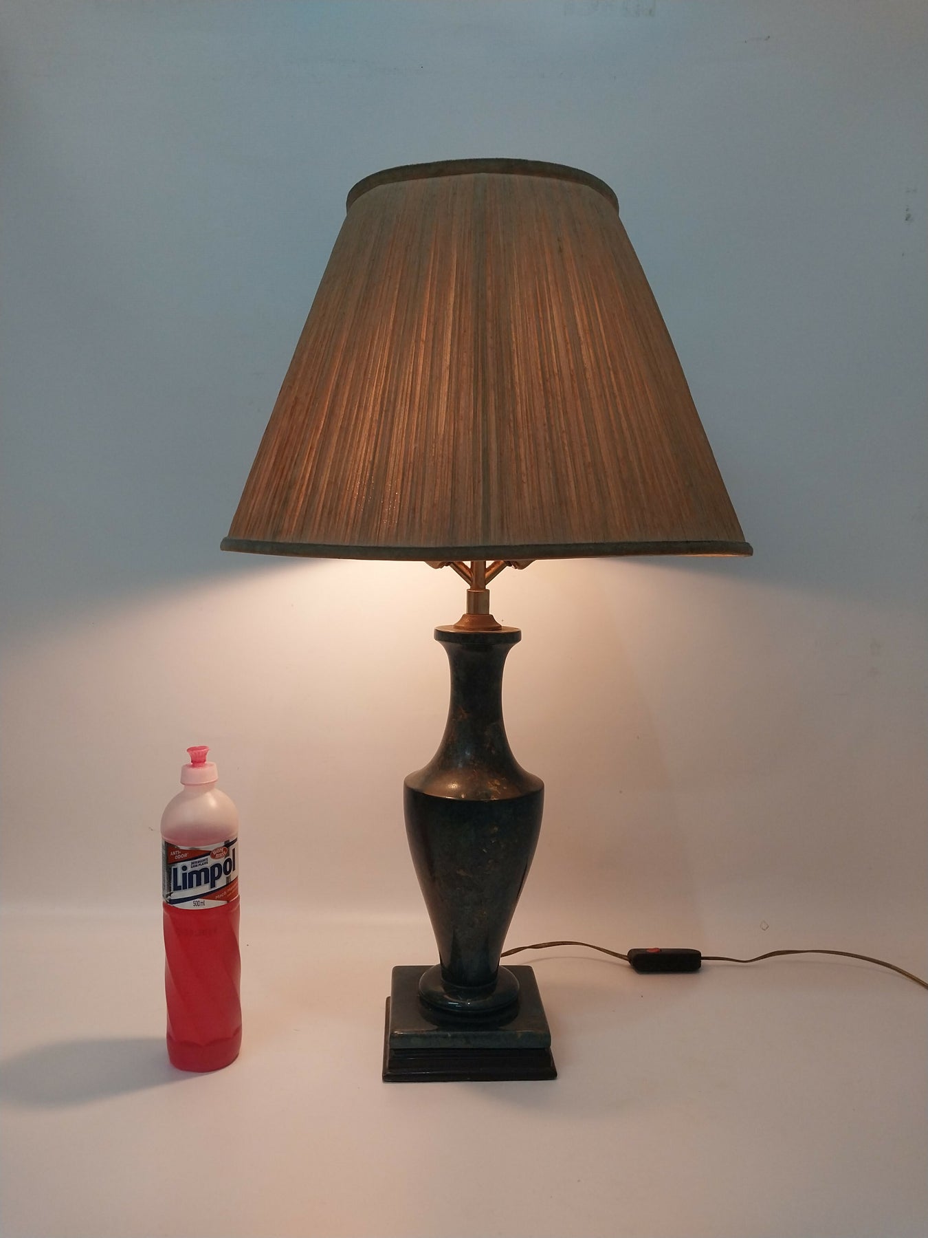 Abajir anos 50 estilo clássico americano, base em madeira com interação texturizada e cúpula em tecido plissado. No geral em muito bom estado, cúpula com marcas do tempo. Possui duas lâmpadas.