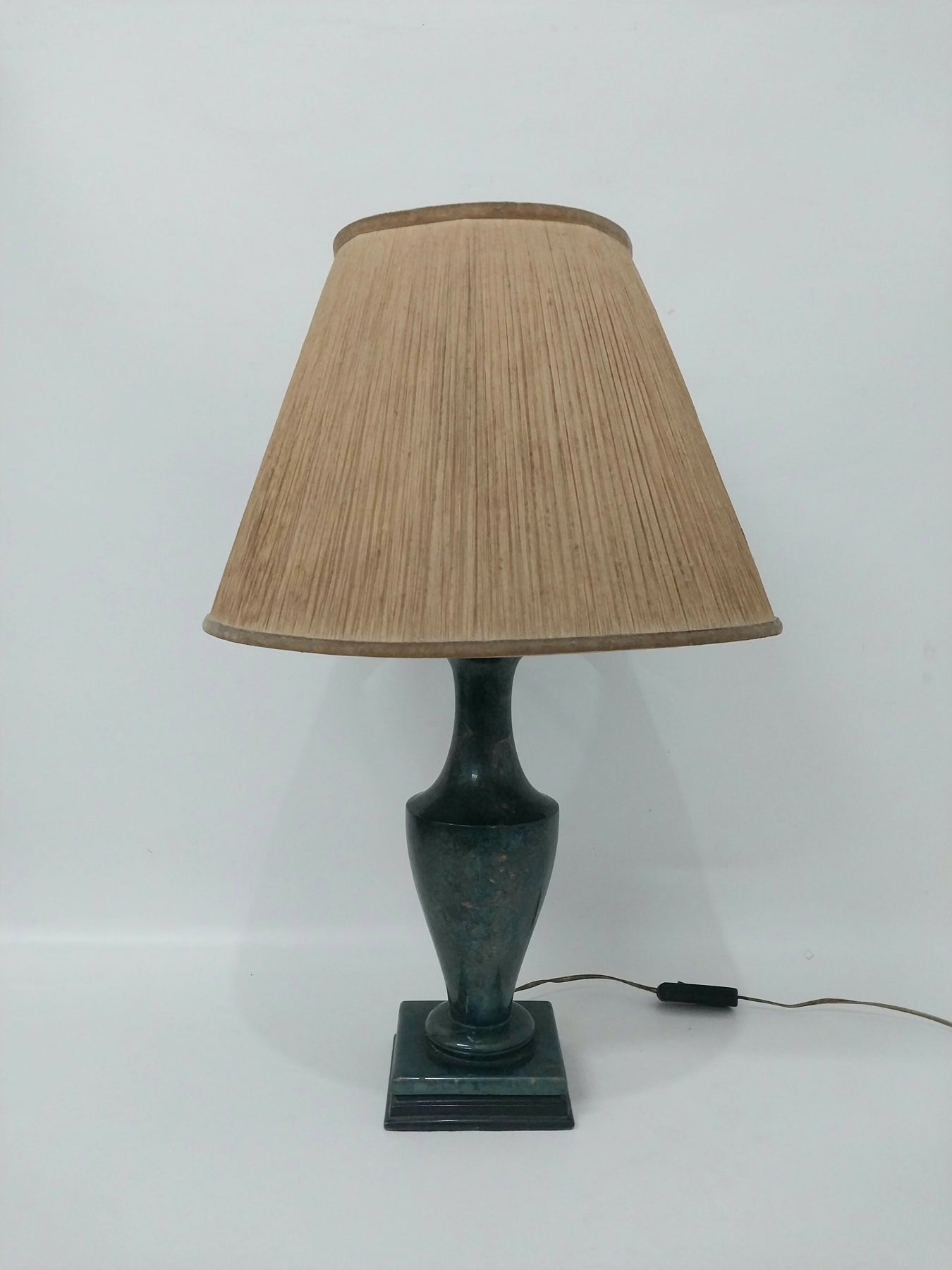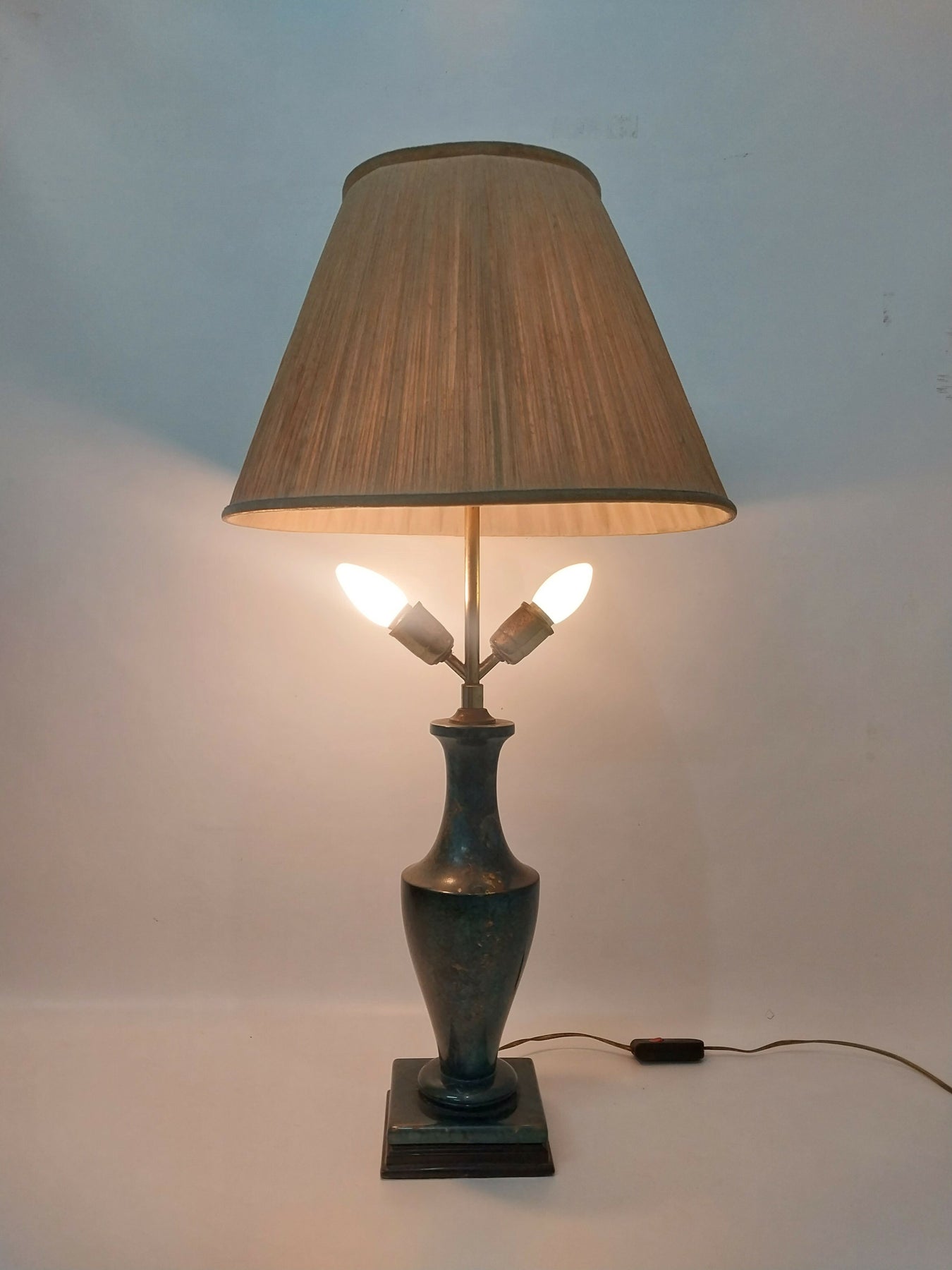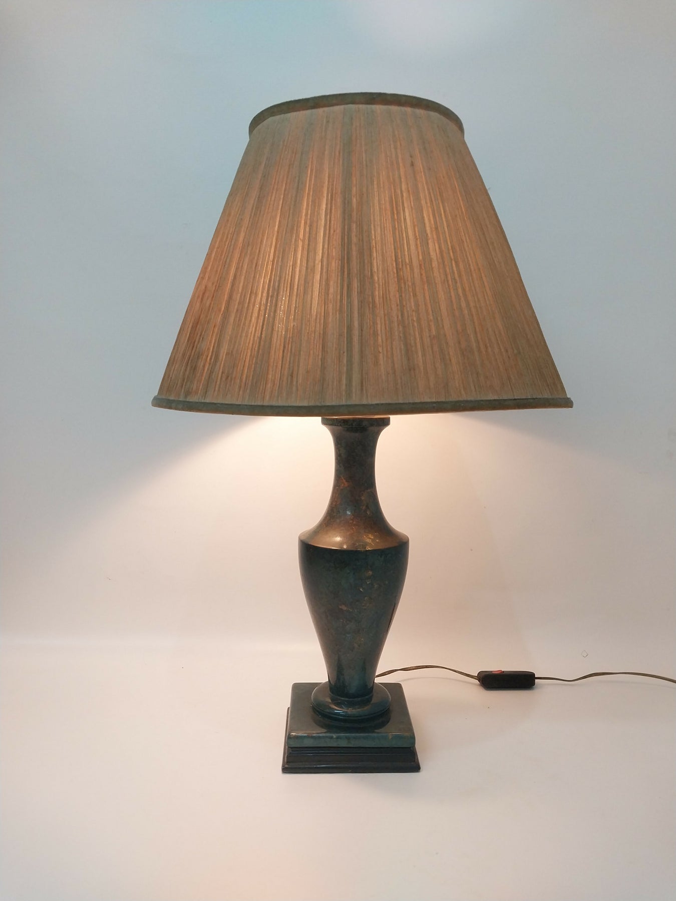 Abajir anos 50 estilo clássico americano, base em madeira com interação texturizada e cúpula em tecido plissado. No geral em muito bom estado, cúpula com marcas do tempo. Possui duas lâmpadas.