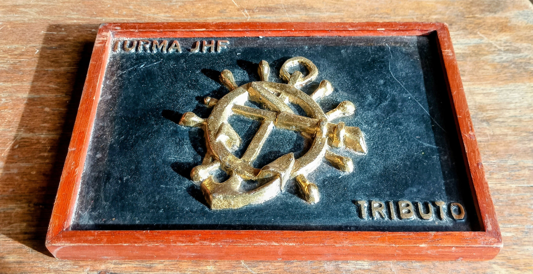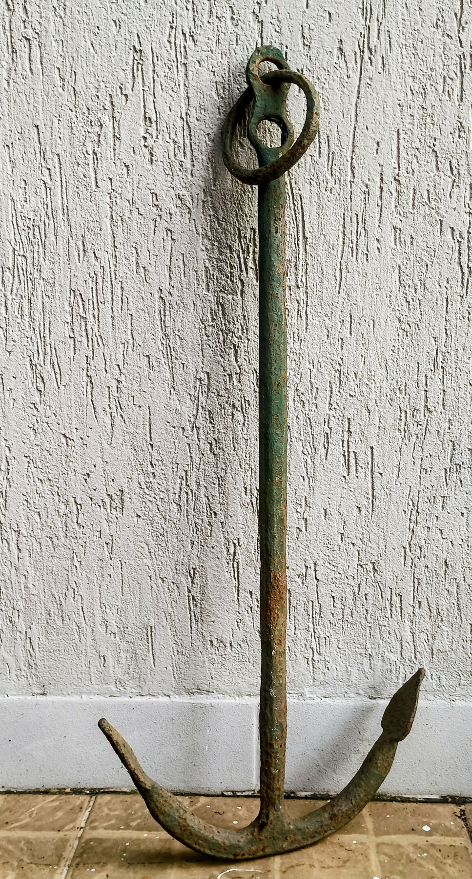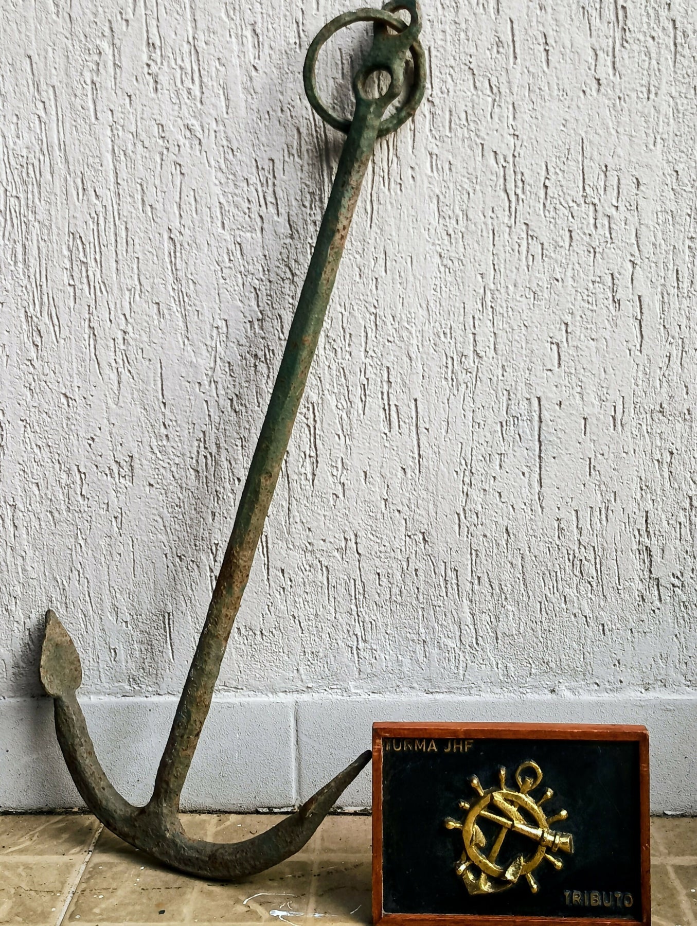 Antiga âncora naval, em ferro fundido, acompanha placa de  tributo a Marinha em bronze, belíssimas peças decorativas e também colecionáveis, em perfeito estado de conservação, medindo a âncora, 86 cm altura  x 36 cm largura, peso aproximado, entre  15 e 20 Kg, e o tributo 23 cm x 17 cm peso aproximado 3 Kg