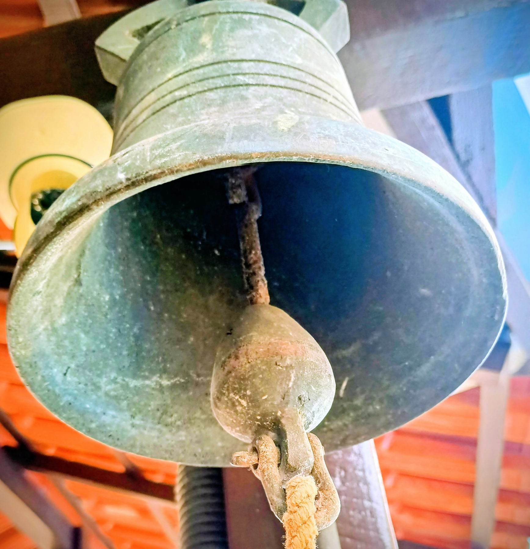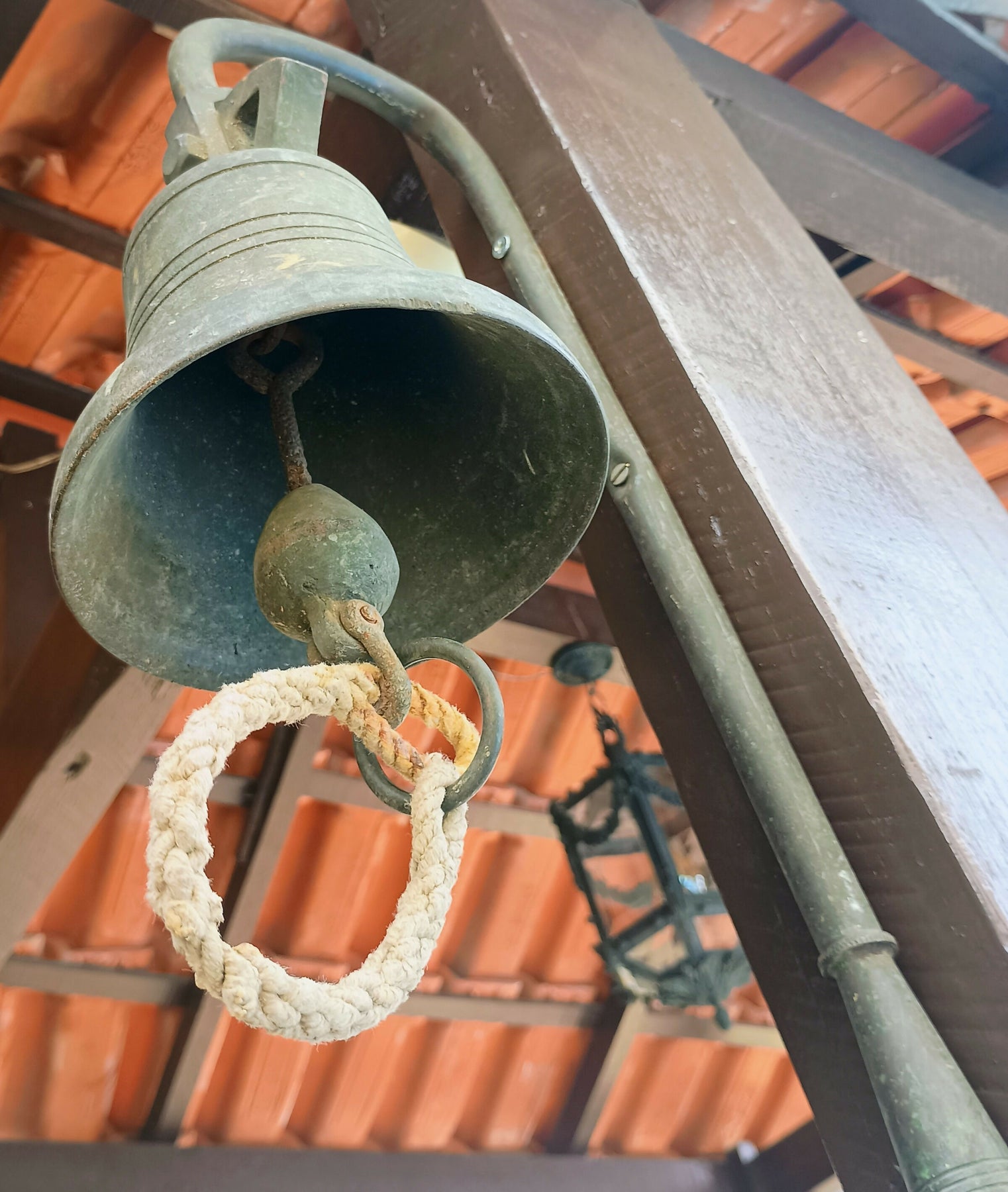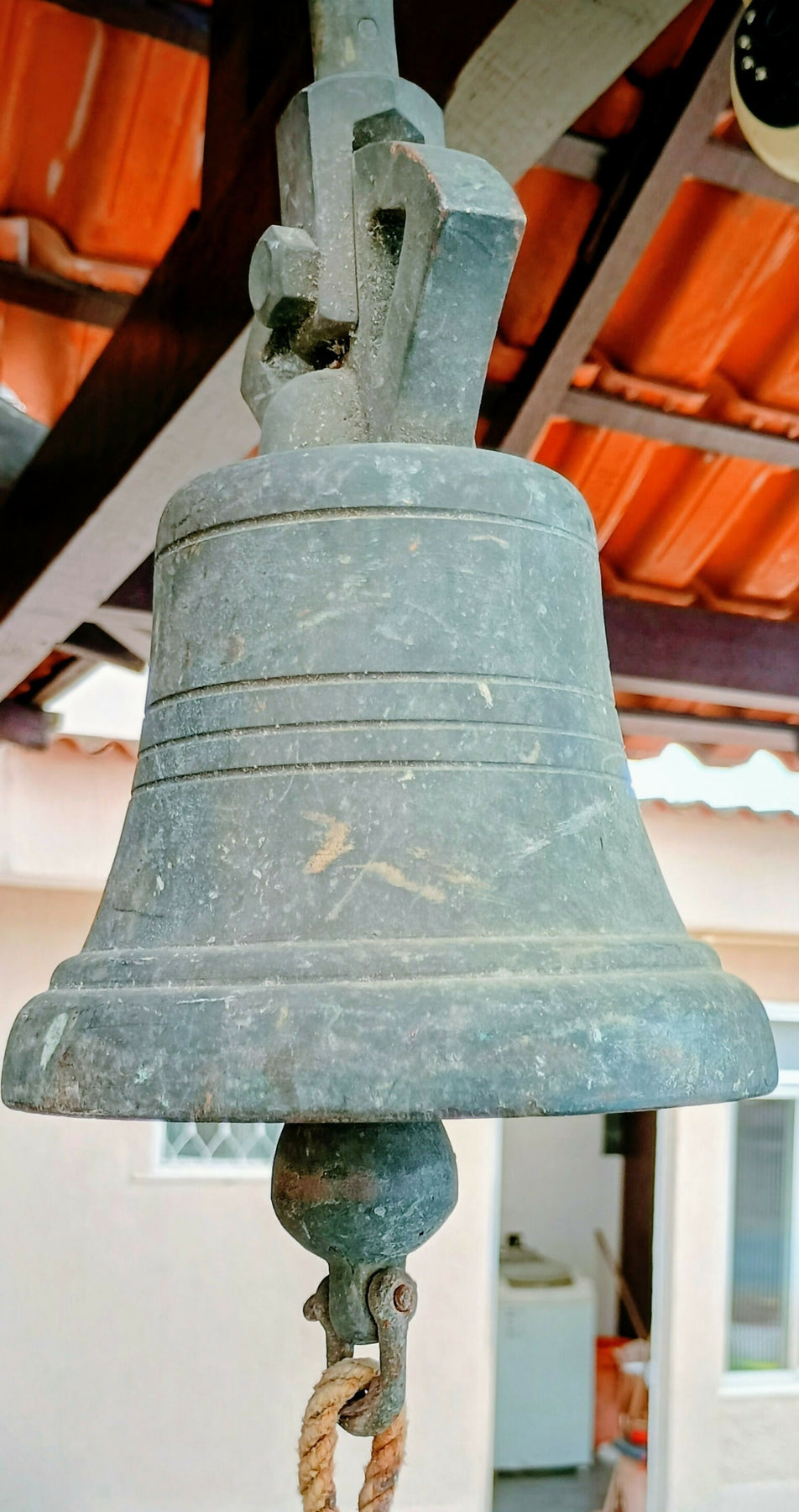 Maravilhoso e antigo sino naval (provavelmente de rancho), totalmente construído em bronze, contendo seu suporte e demais peças, inclusive a corda, ainda original, peça medindo 49 cm altura,  15 de largura (peça total), medidas somente do sino,  19 cm altura, 15 cm largura, um excelente e alto som!!!!