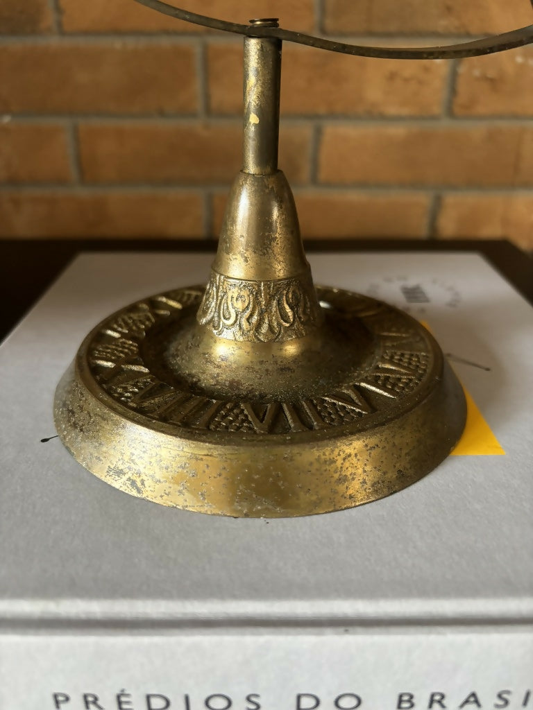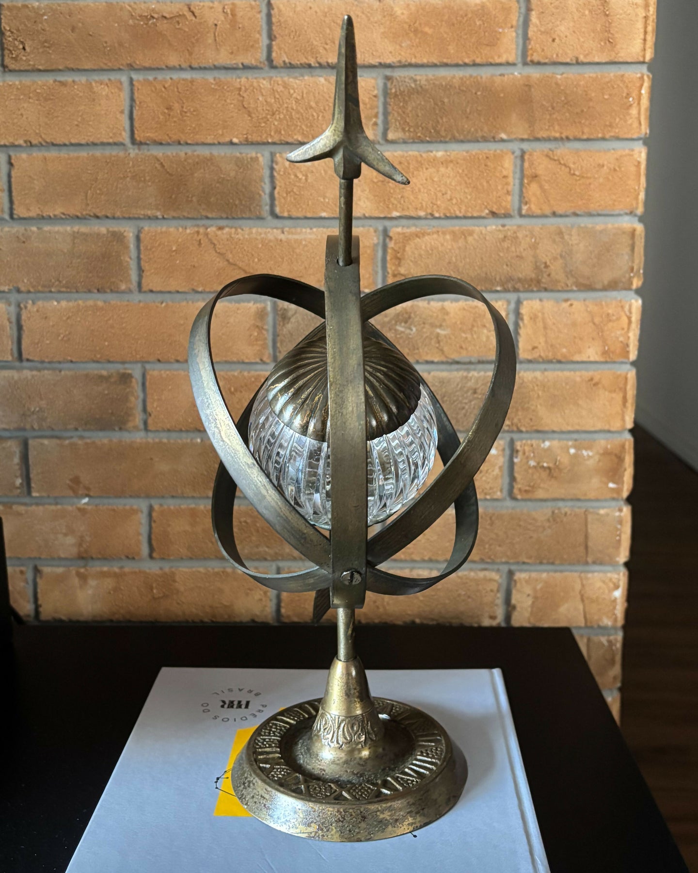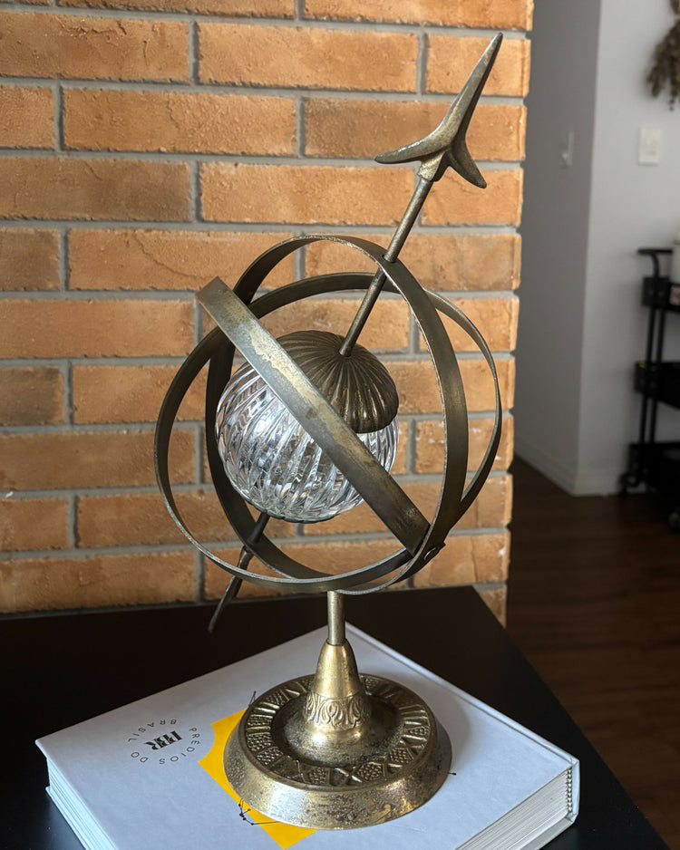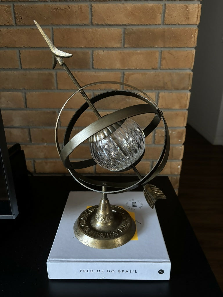 quando o céu se dobra em ferro fundido e cristal. um astrolábio que já não mede mais estrelas, apenas repousa, pesado, sobre base em relevo um pouco corroída. a esfera de cristal parece guardar uma luz esquecida. há um amassado discreto no encontro das peças, não falha, mas cicatriz. a idade se inscreve nele como quem escreve à mão no tempo.