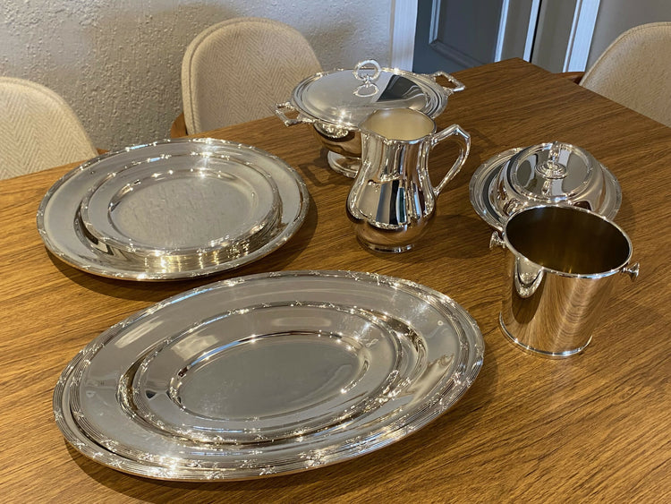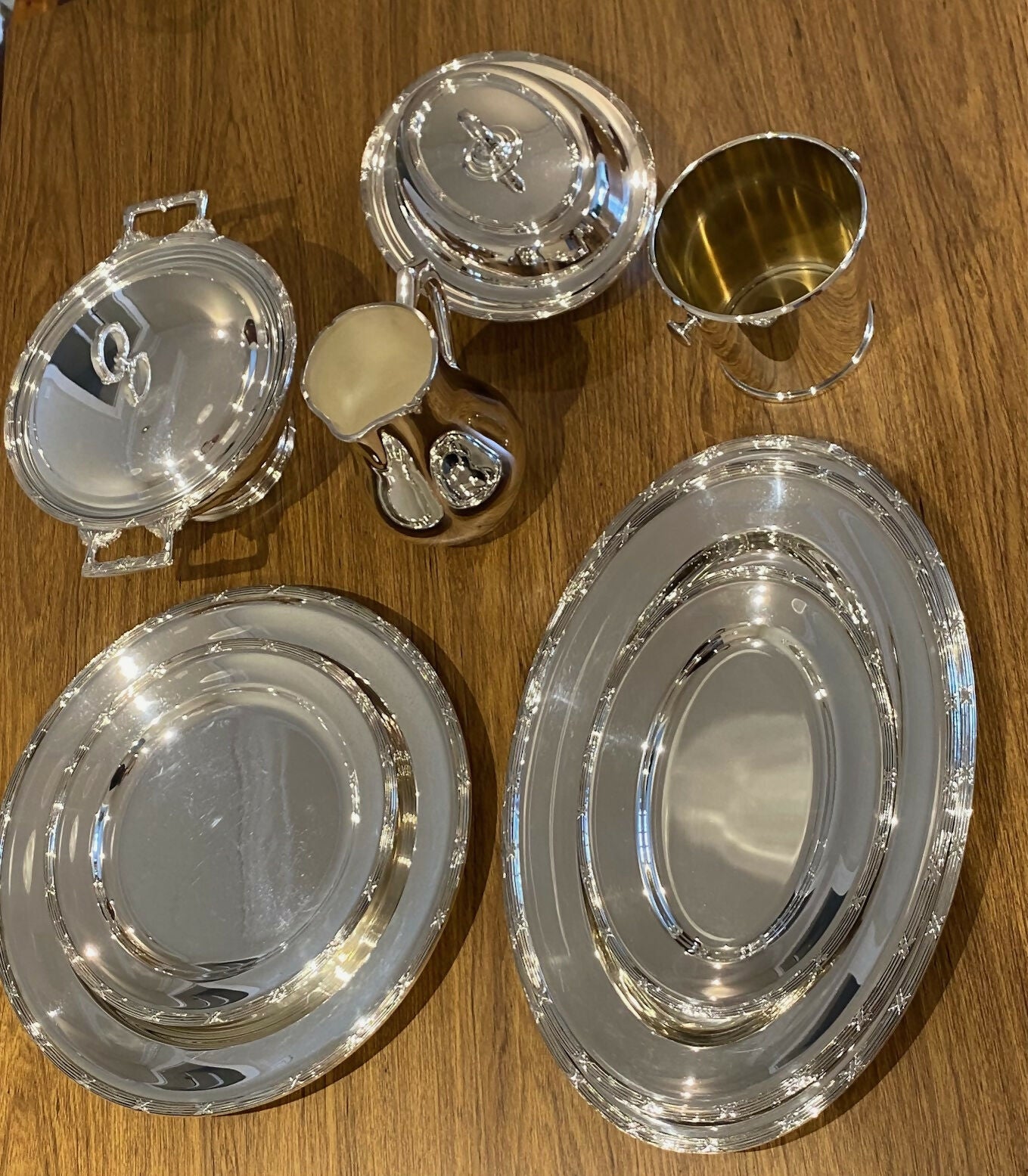 Jogo baixela de prata fracalanza croise contendo: 3 baixelas ovais ( p,m,g); 2 baixelas redondas (p,m); 1 legumeira; 1 sopeira; 1 jarra; 1 balde de gelo