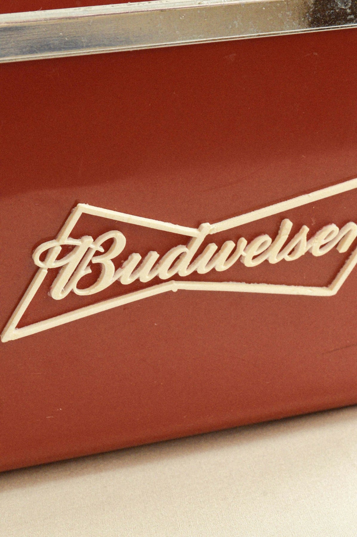 balde de gelo Budweiser, todo em plástico vermelho.