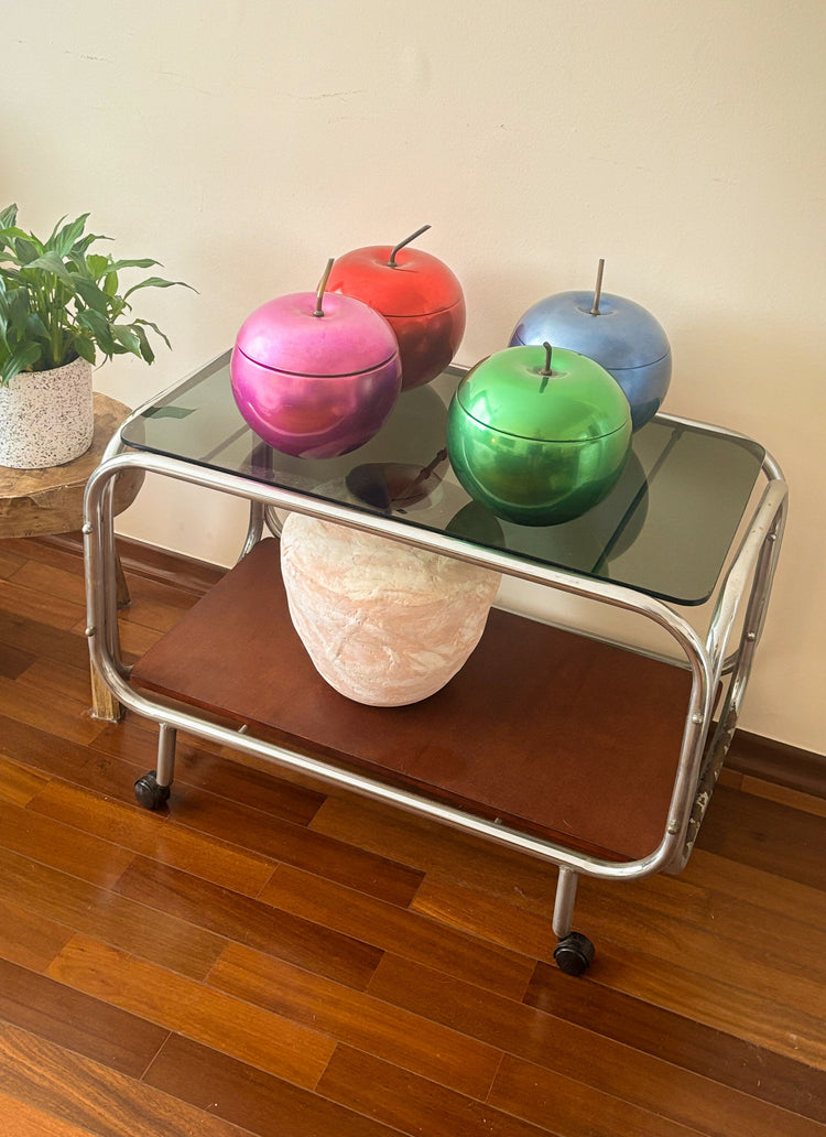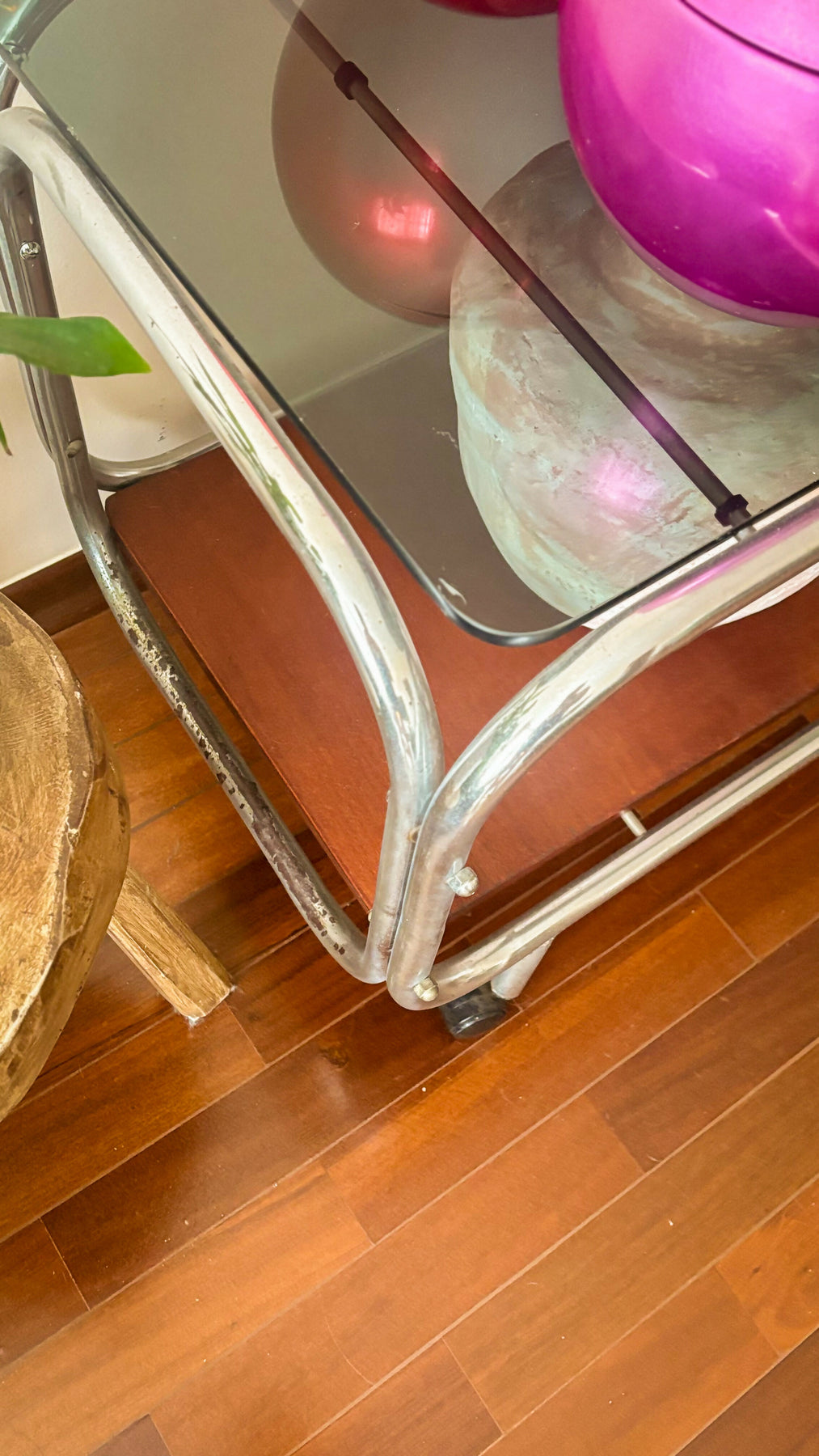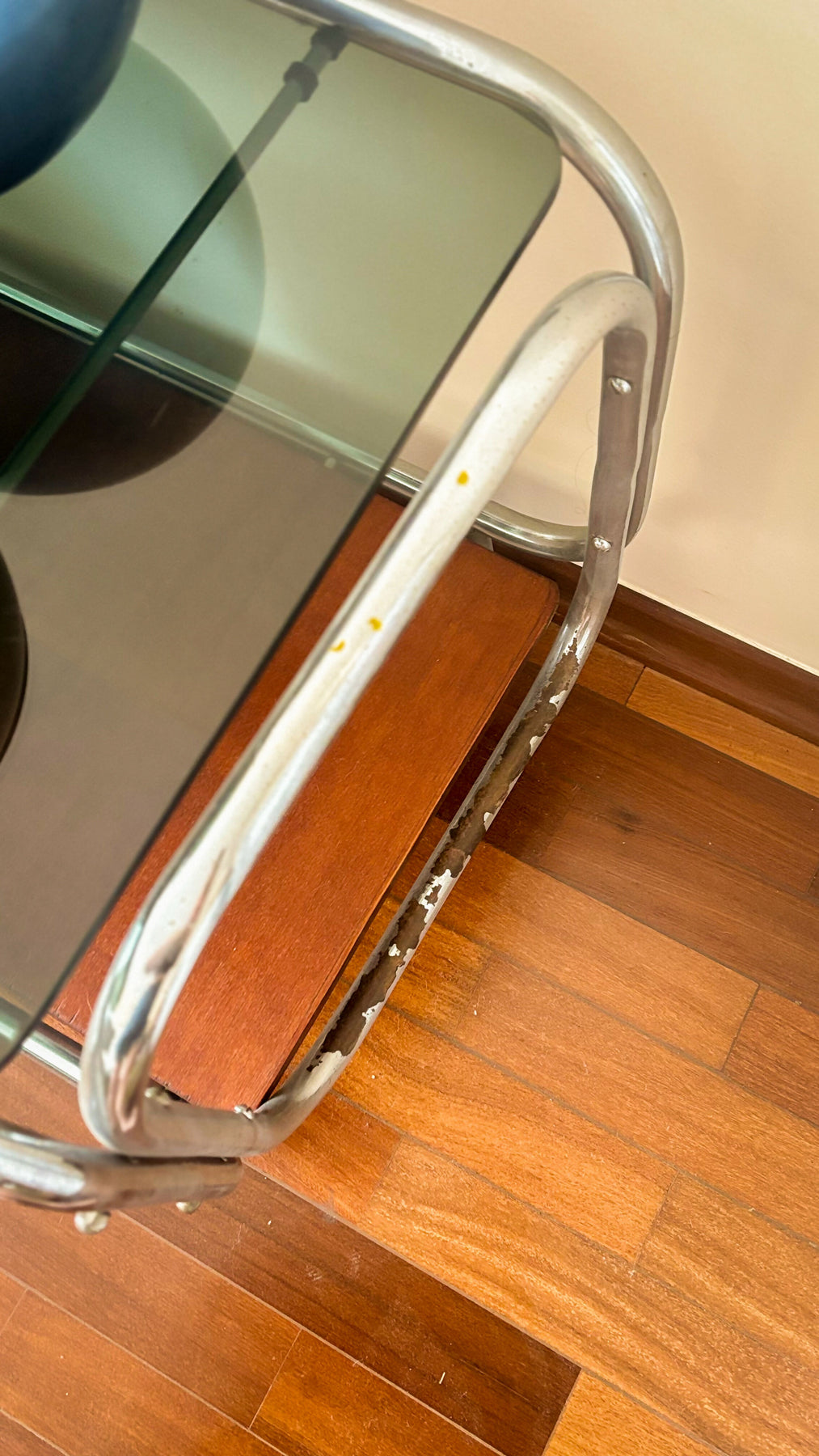Barzinho com rodinhas, bem anos 80, com aço tubular cromado e tampo em vidro fumê.