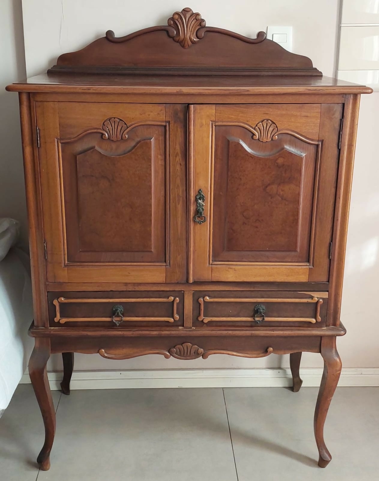 Móvel de madeira, estilo Luis XV com 2 portas e 2 gavetas, medindo 0,92 x 0,44 x 1,15.