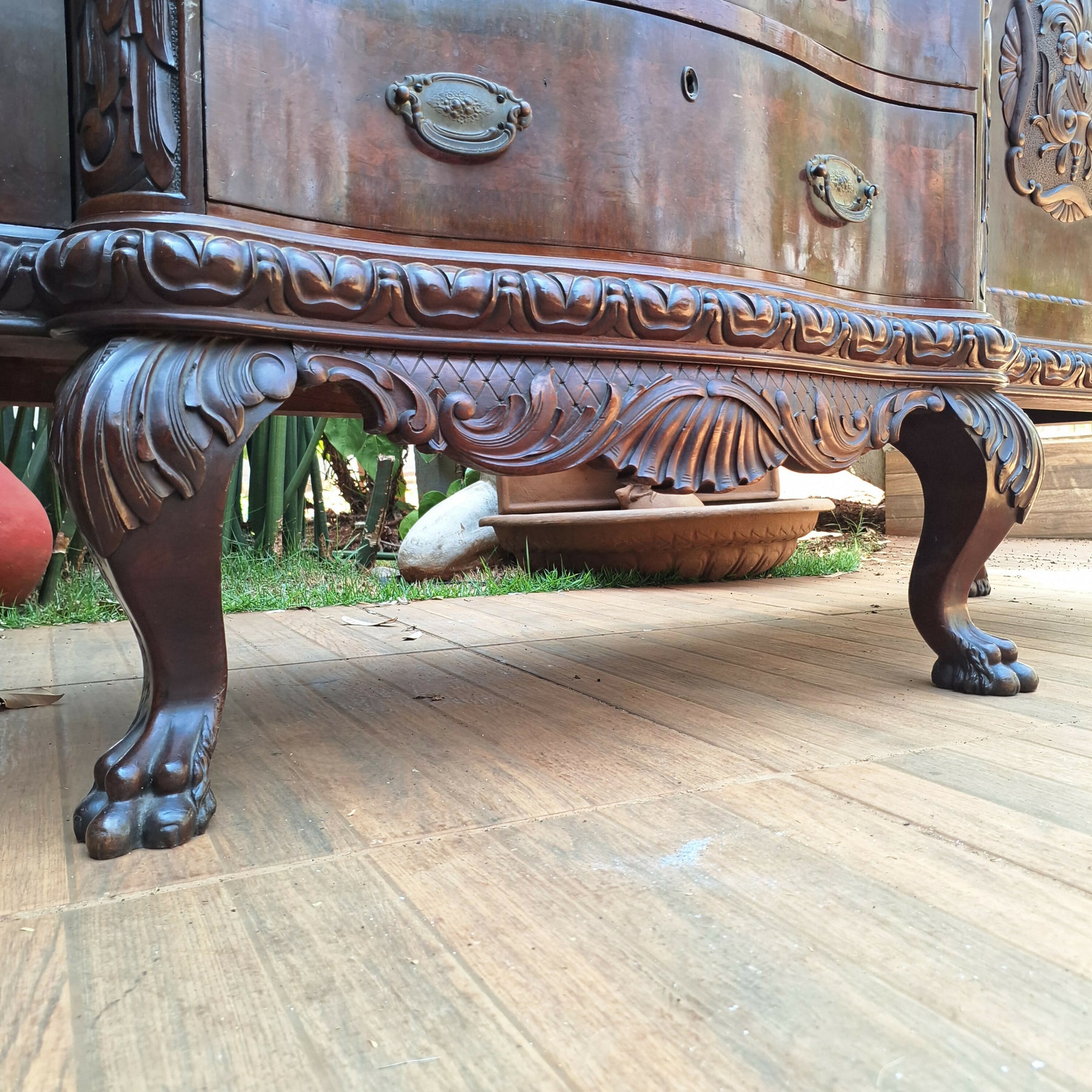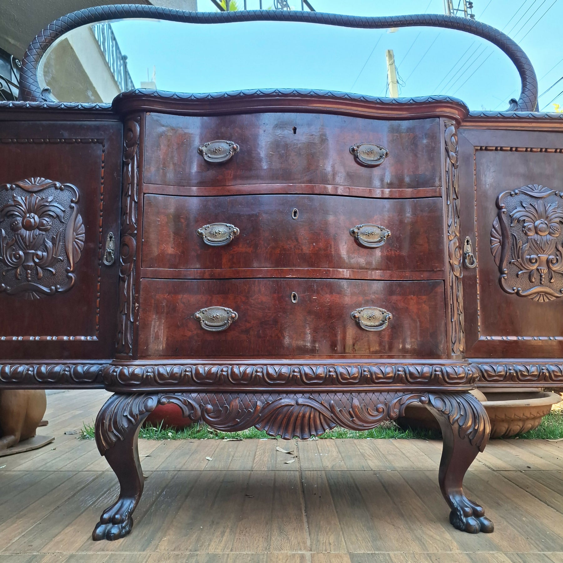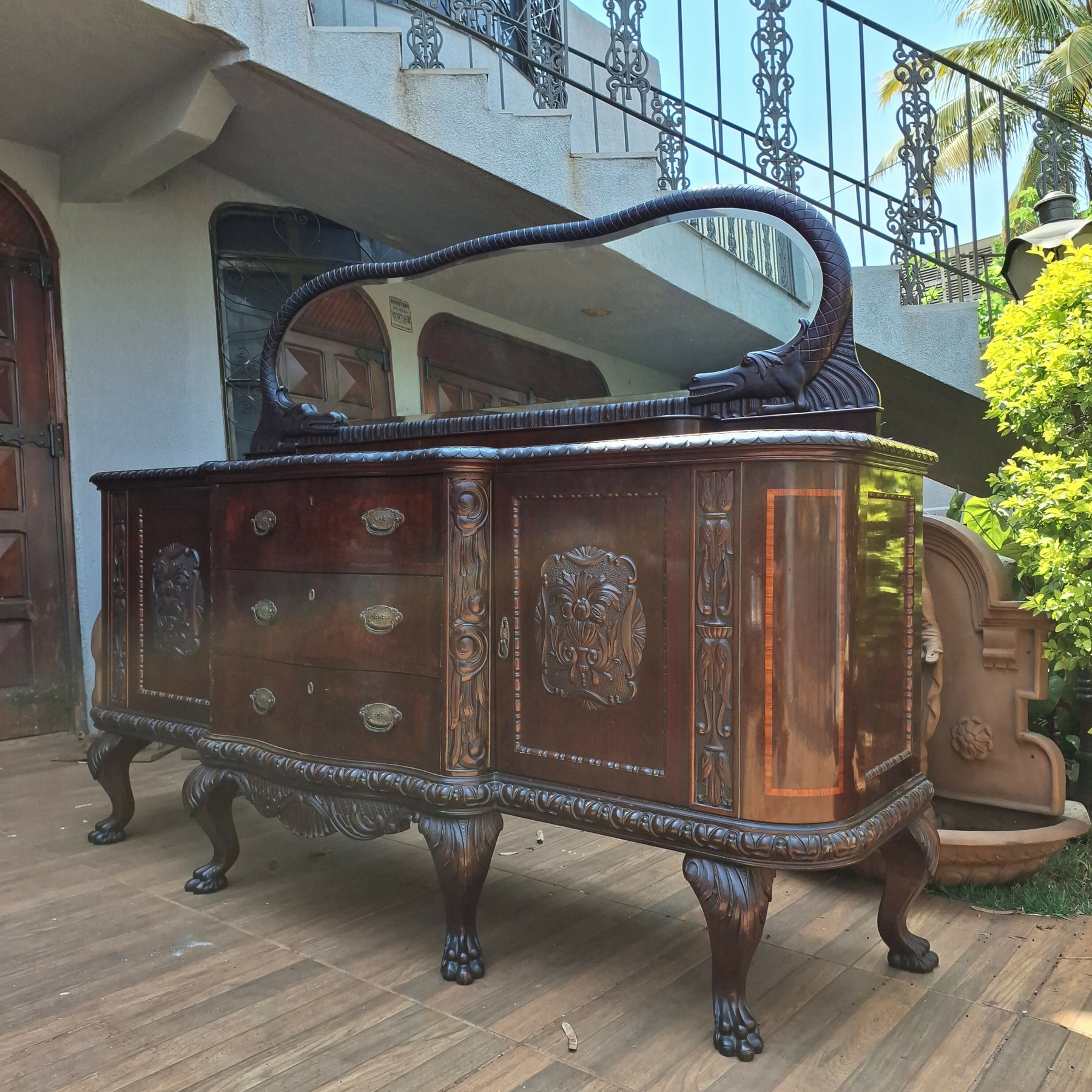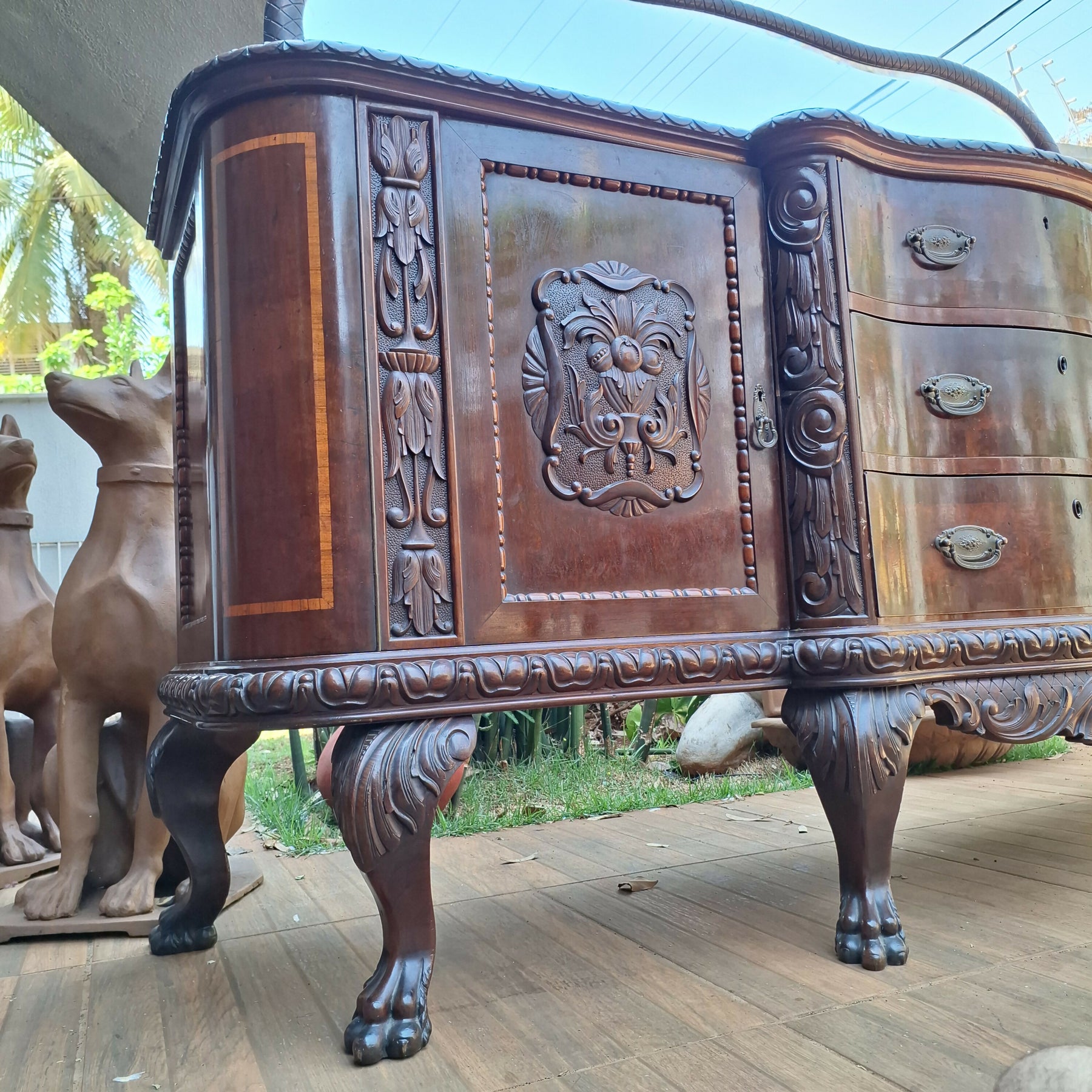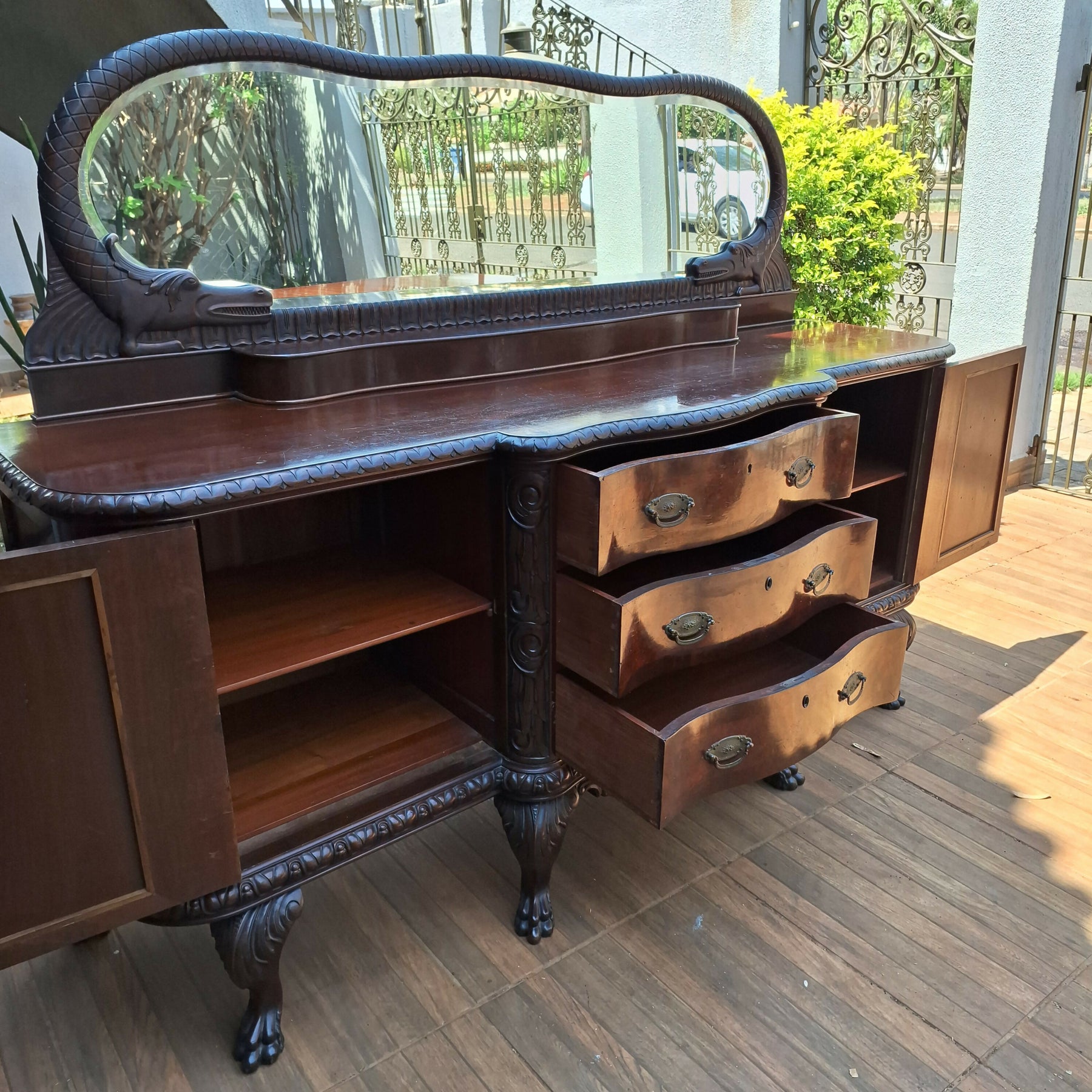 Belíssimo Buffet Centenário, estrutura em madeira de lei, gavetas estilo Bombê, peça ricamente trabalhada , rica em detalhes esculpidos e marchetaria, espelho todo bisotado com figuras de dragão em ambos os lados , mede 2,19 x 0,54 e 1,61 altura, R$15.000,00