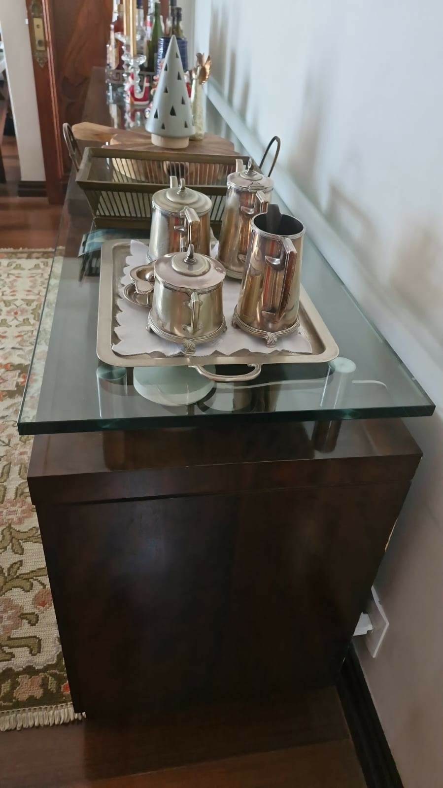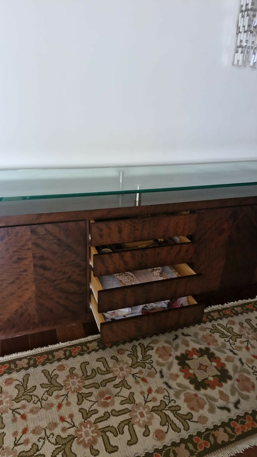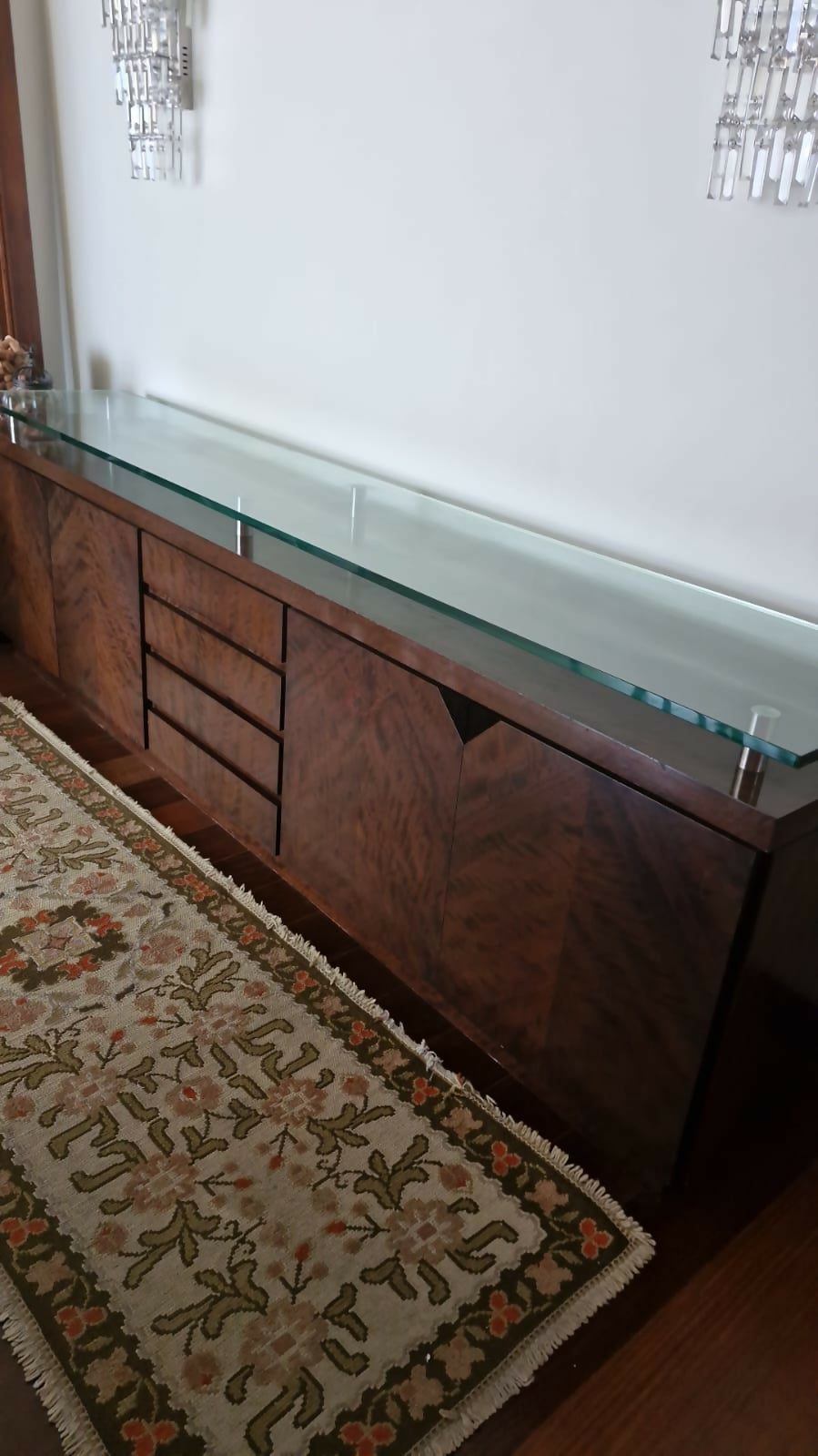 Buffet de madeira comtampo de vidro que combina elegância e sofisticação para o seu ambiente. Seu design moderno e clean se adapta perfeitamente a diversos estilos de decoração, adicionando um toque de requinte. Uma peça que valoriza e transforma qualquer espaço. Dimensões 2,80m comprimento X 0,50 metros de largura, 0,84 m de altura espessura do vidro 20 mm (2,80 x 0,50 m). Super resistente, em madeira maciça! Quatro gavetas e 4 portas, com uma seção para porta bandejas e demais com prateleira no meio, conforme fotos.