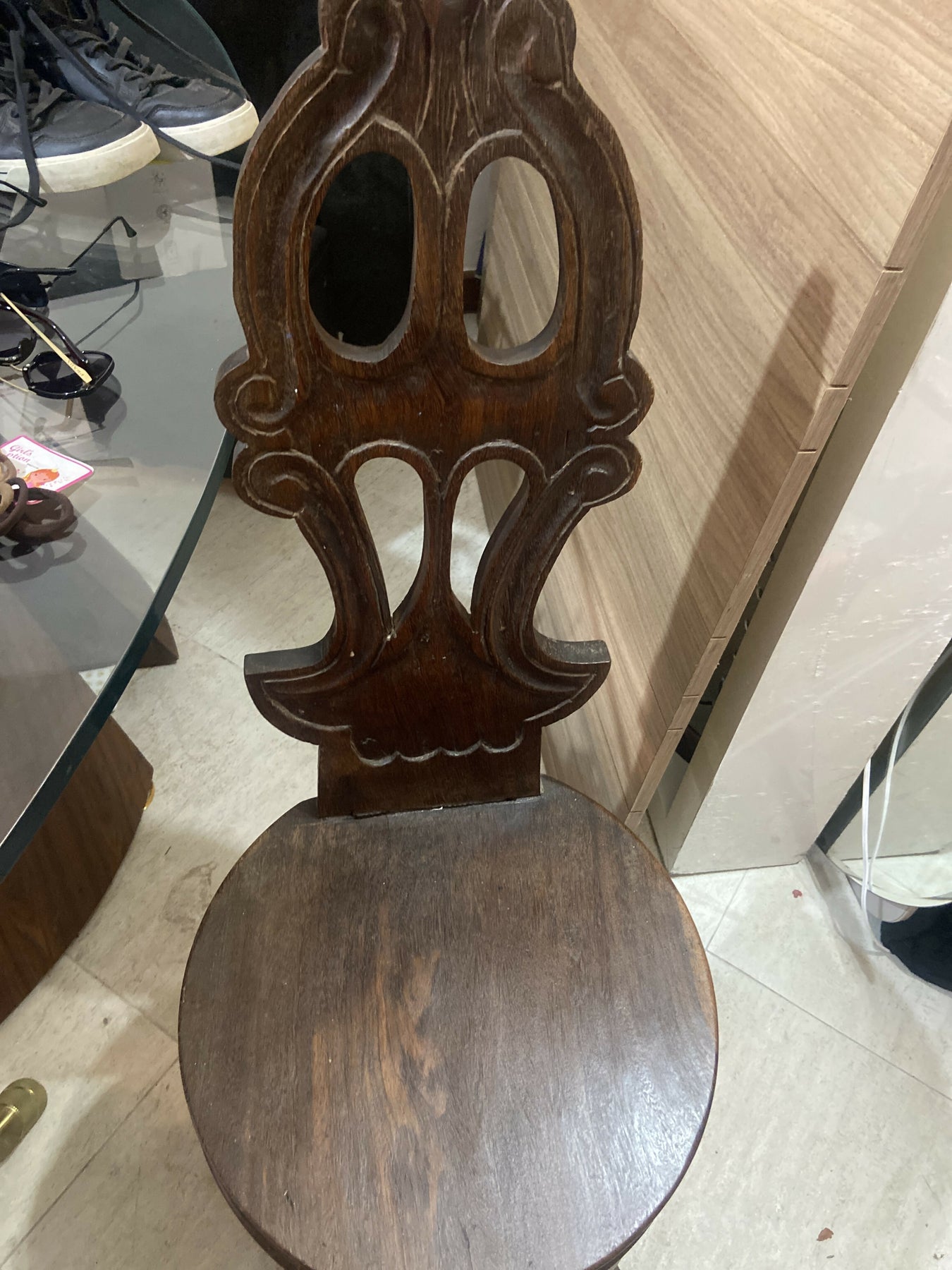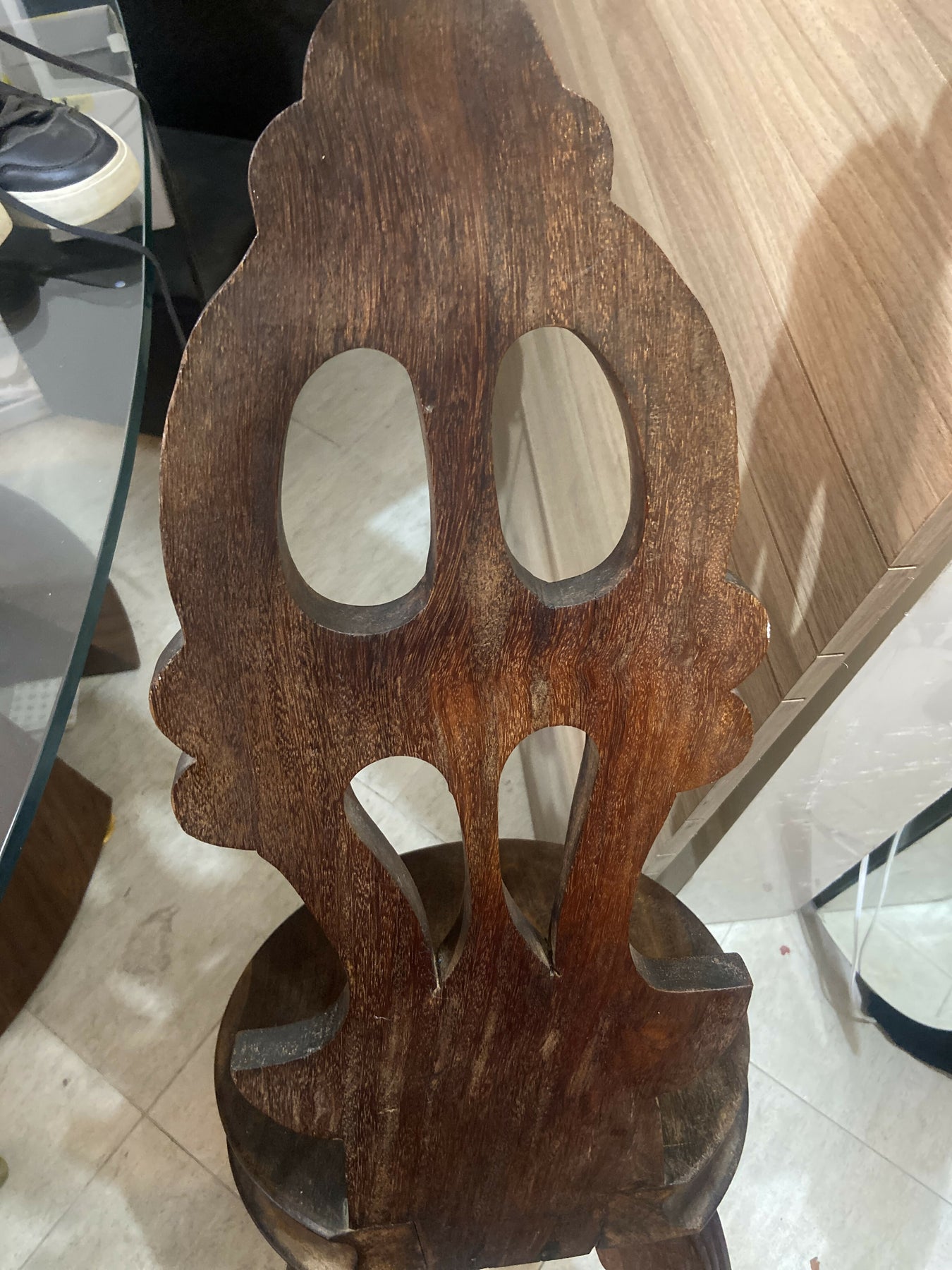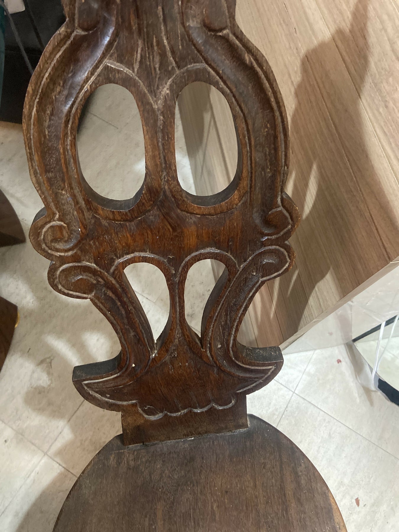 Espaldar alto é ricamente entalhado à mão, com detalhes que evidenciam o trabalho artesanal típico do período colonial. Estrutura firme, pernas robustas e excelente estabilidade — uma peça feita para atravessar gerações.