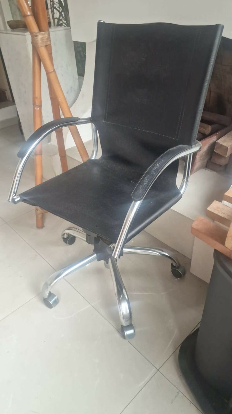 Cadeira de escritório com estrutura metálica cromada, base giratória com rodízios e assento/encosto em couro sintético preto.