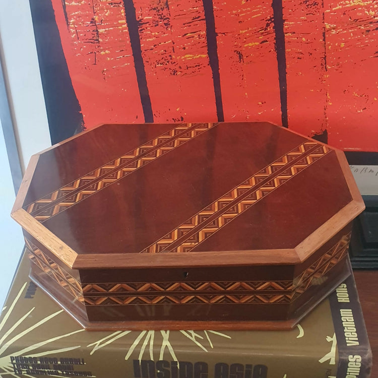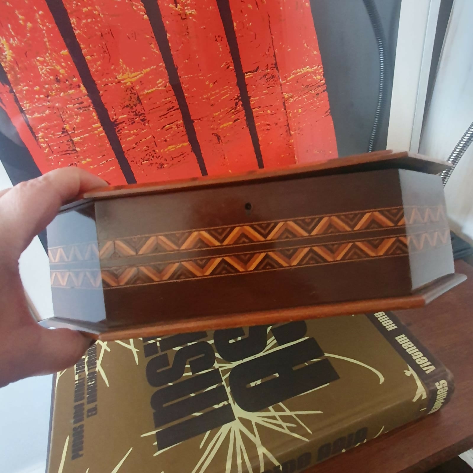 Caixa em madeira porta joias, trabalhada com detalhes em marchetaria.