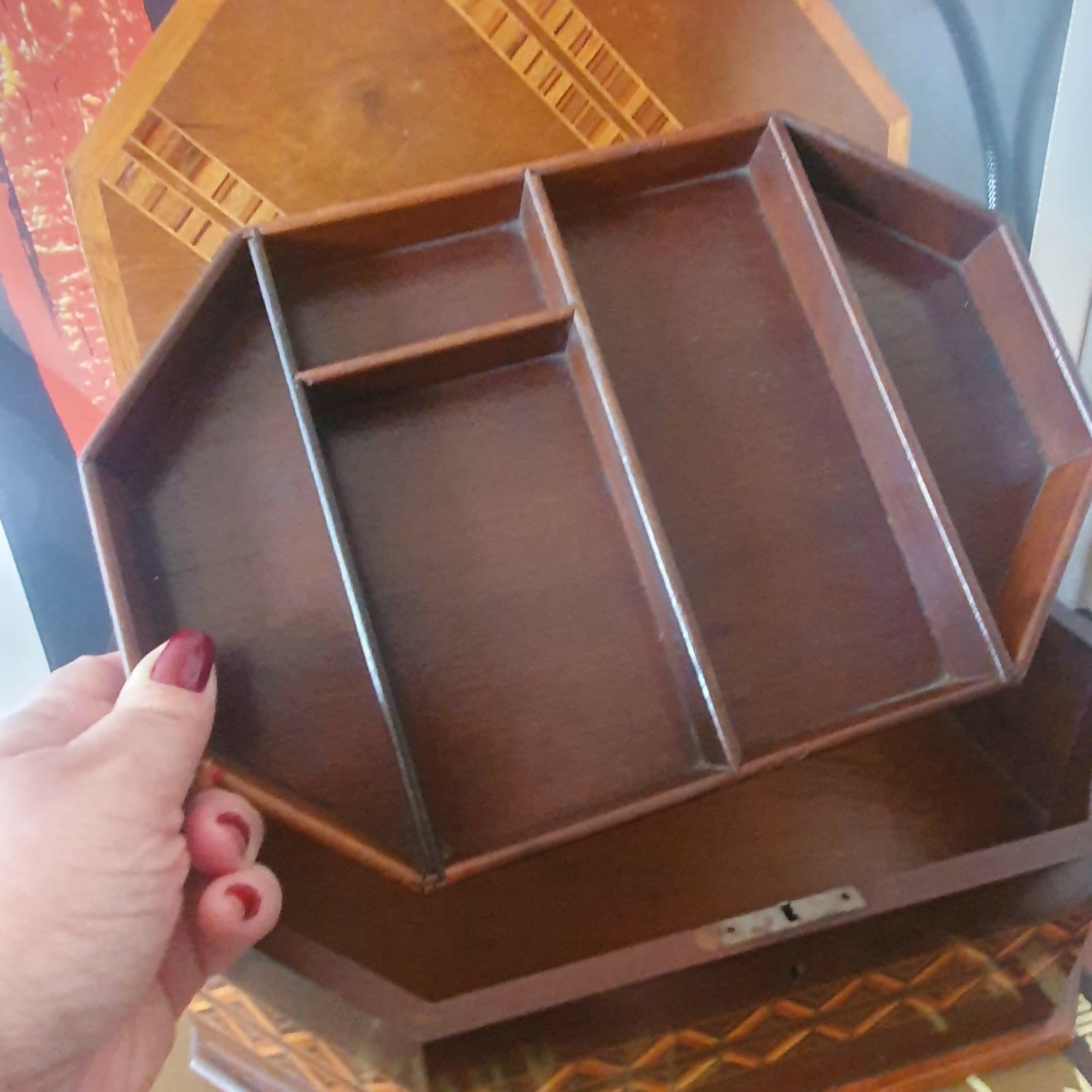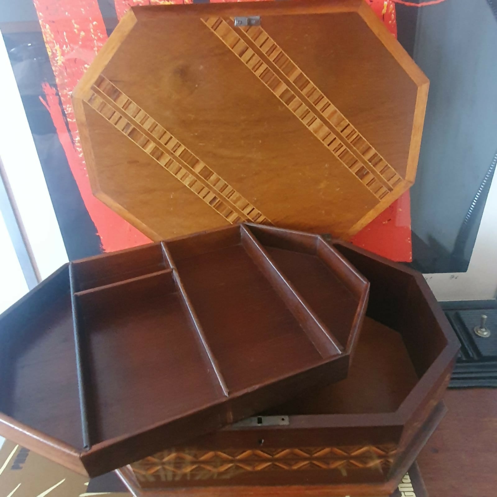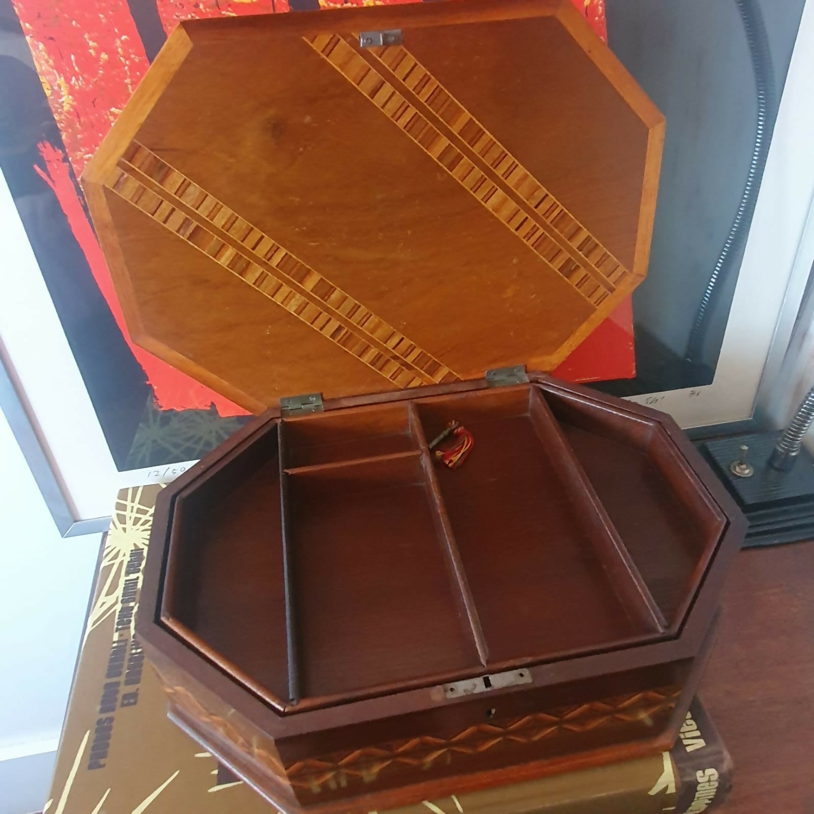 Caixa em madeira, porta joias, trabalhada em detalhes de marchetaria com 2 andares e chave.