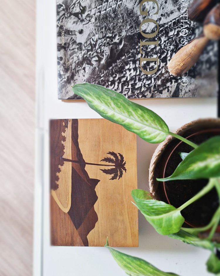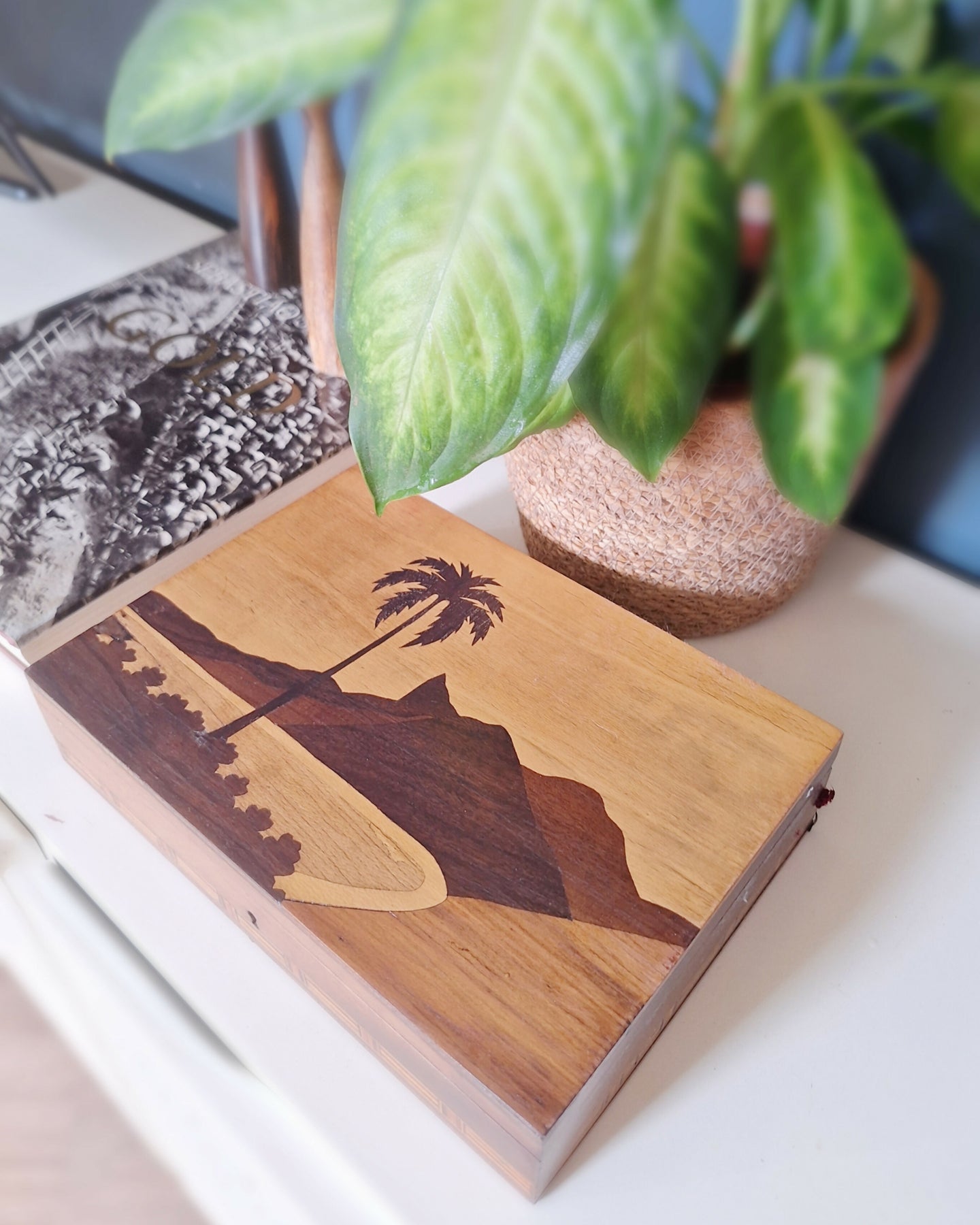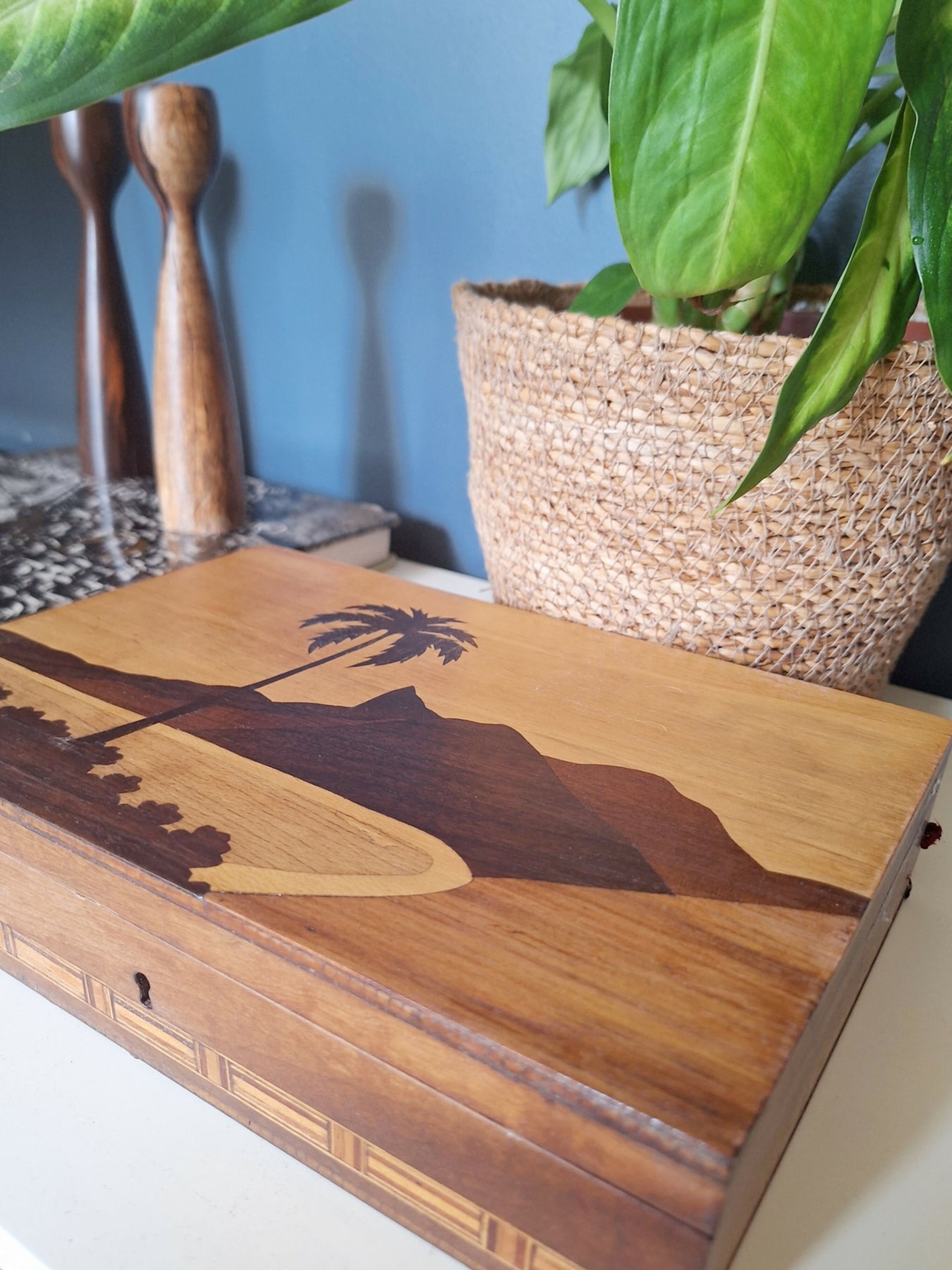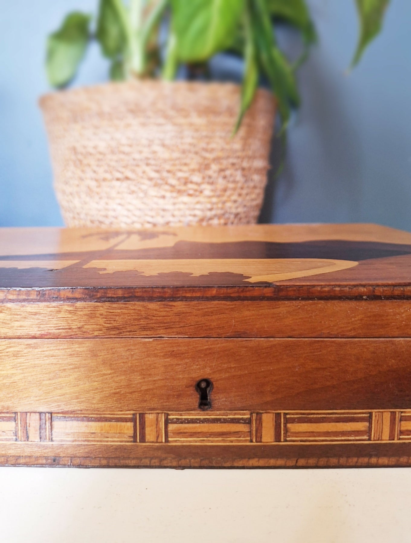 Caixa antiga de madeira com Marchetaria (Praia e Coqueiro)