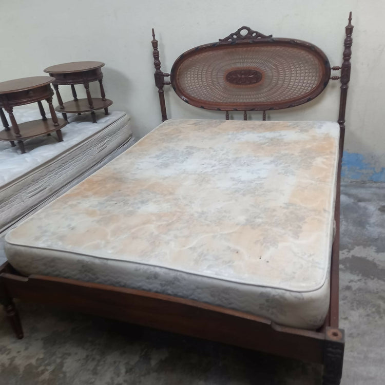 Cama de casal com cabeceira em palhinha, par de móveis de cabeceira.