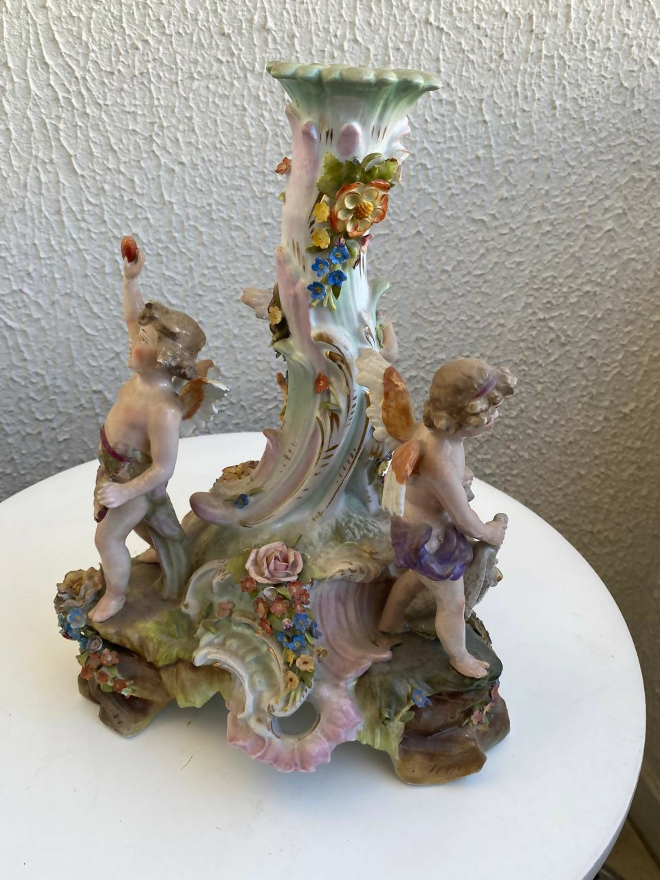 Delicada peça decorativa em porcelana alemã da tradicional manufatura Sitzendorf, inspirada no elegante estilo Dresden / Rococó Revival do final do século XIX. A composição traz querubins (putti) e flores em relevo, modelados e pintados à mão, criando um cenário leve e encantador.