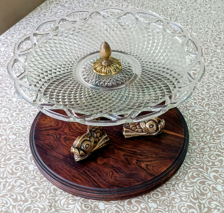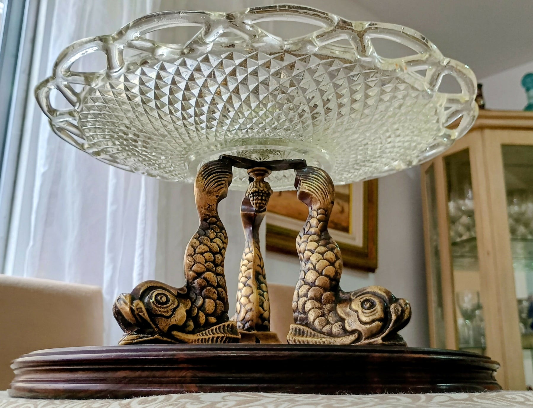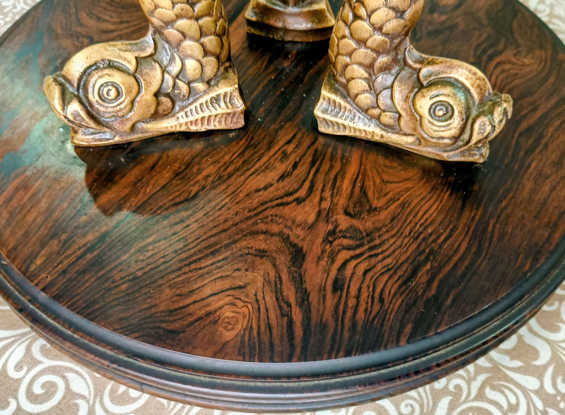 Composta por base redonda em jacarandá maciço, corpo formado por três peixes esculpidos em bronze fundido e prato superior em vidro lapidado.