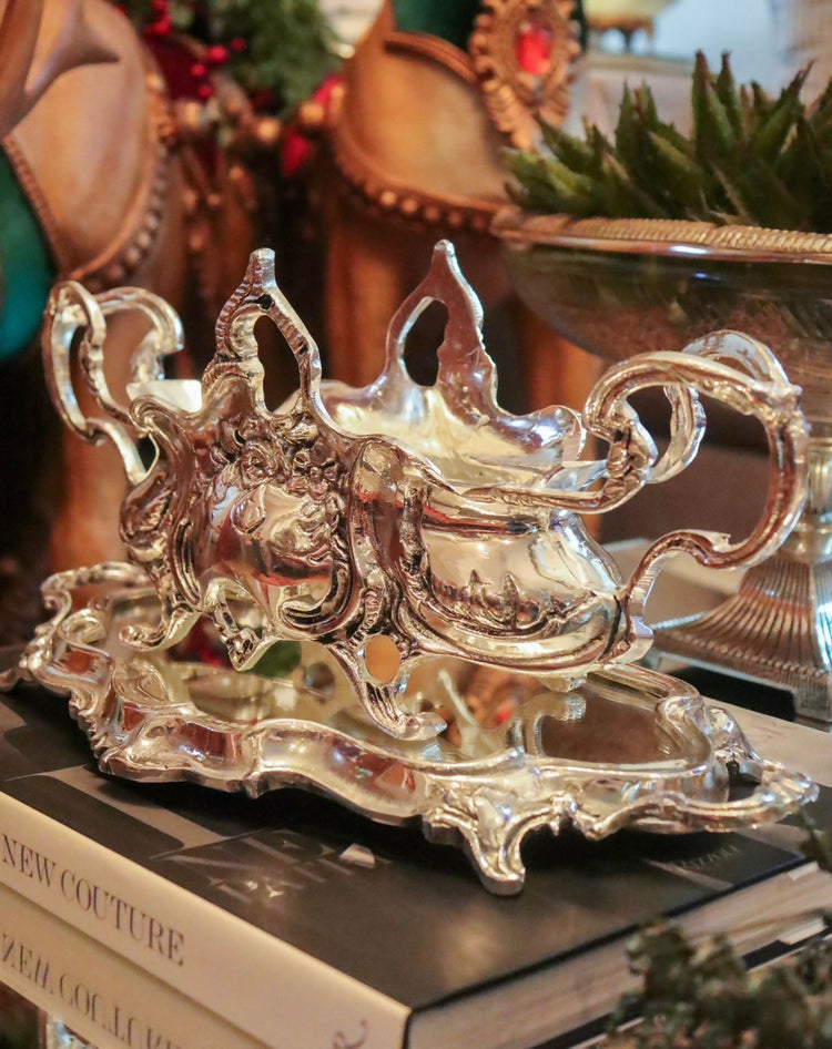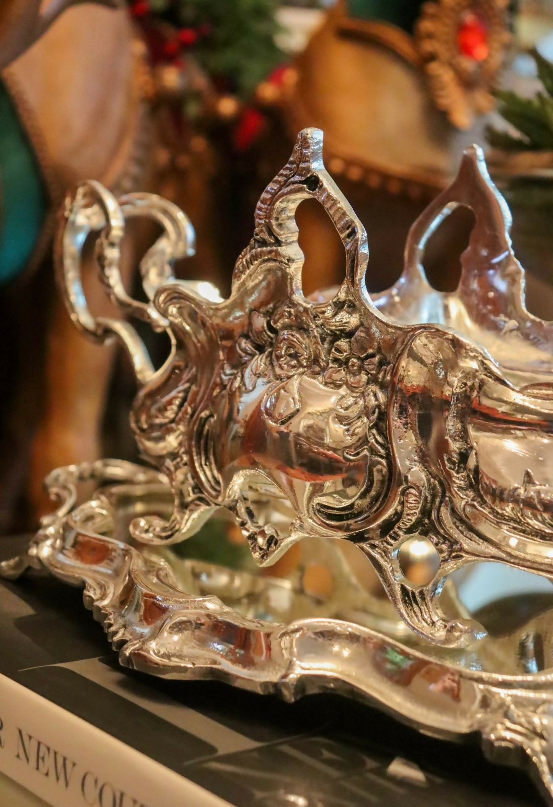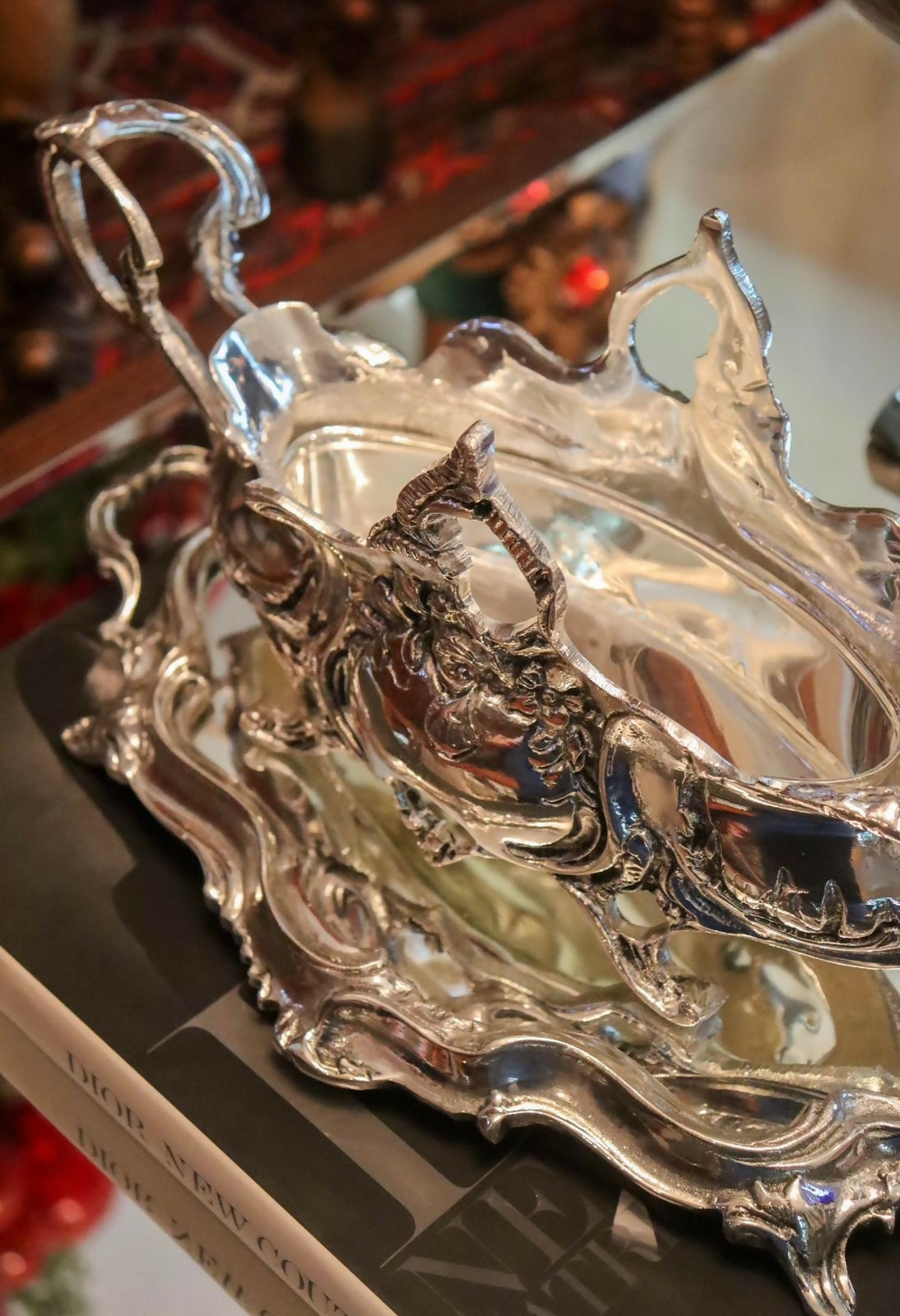 A peça apresenta refinada linguagem Art Nouveau com influência rocaille, marcada por linhas orgânicas, volutas e borda vazada ricamente trabalhada à mão. Criado para mesas e aparadores de época, o espelho amplia a luminosidade e valoriza os relevos da prata, elevando o conjunto em elegância e autenticidade Banho de prata novo, em perfeito estado, totalmente restaurada, bem pesada. Peça muito antiga. Mede 40cm de alça a alça e 24x11 Presentoir mede 39cm de alça a alça e 31x23.