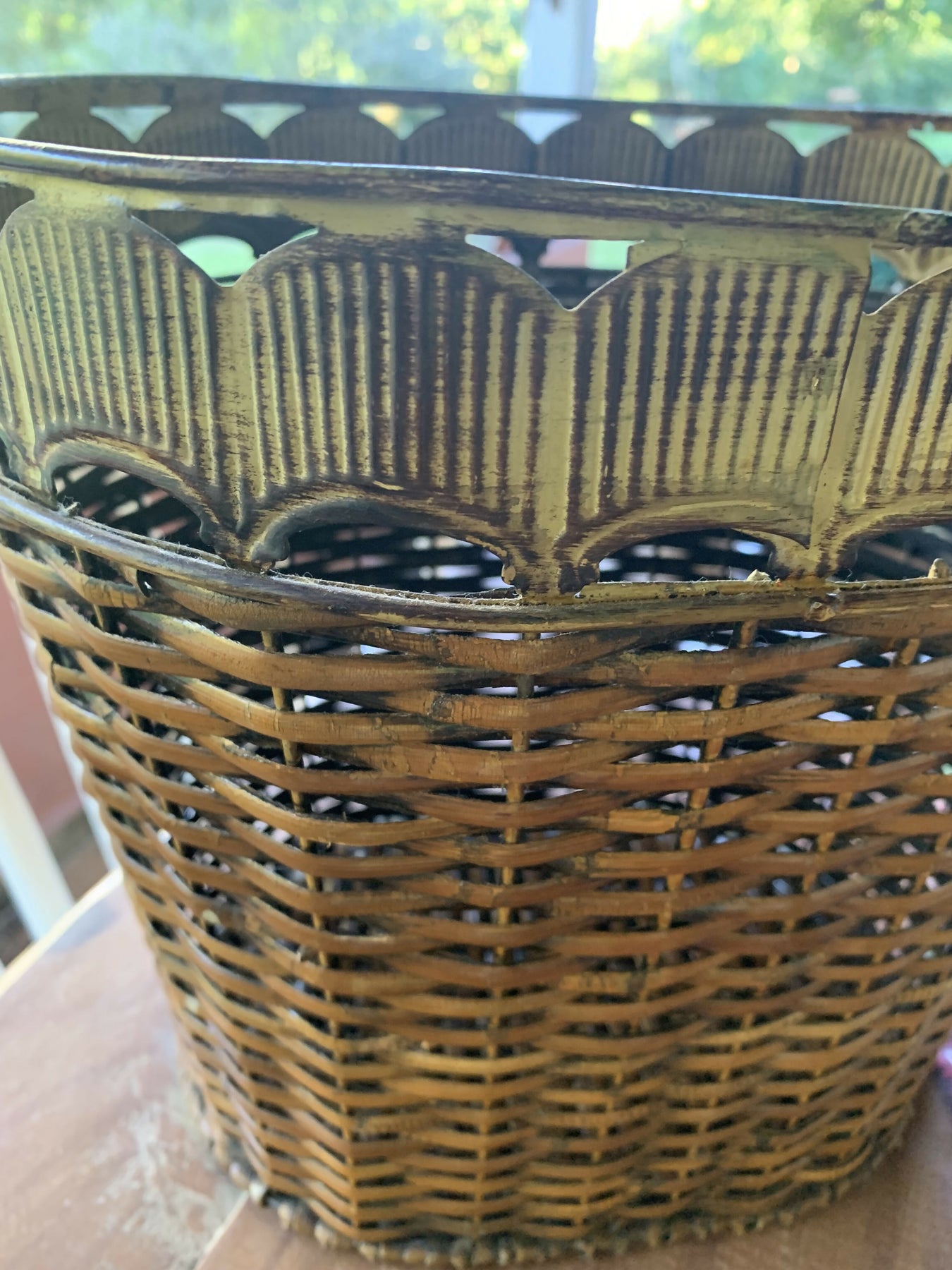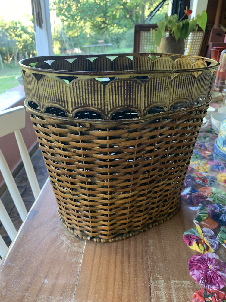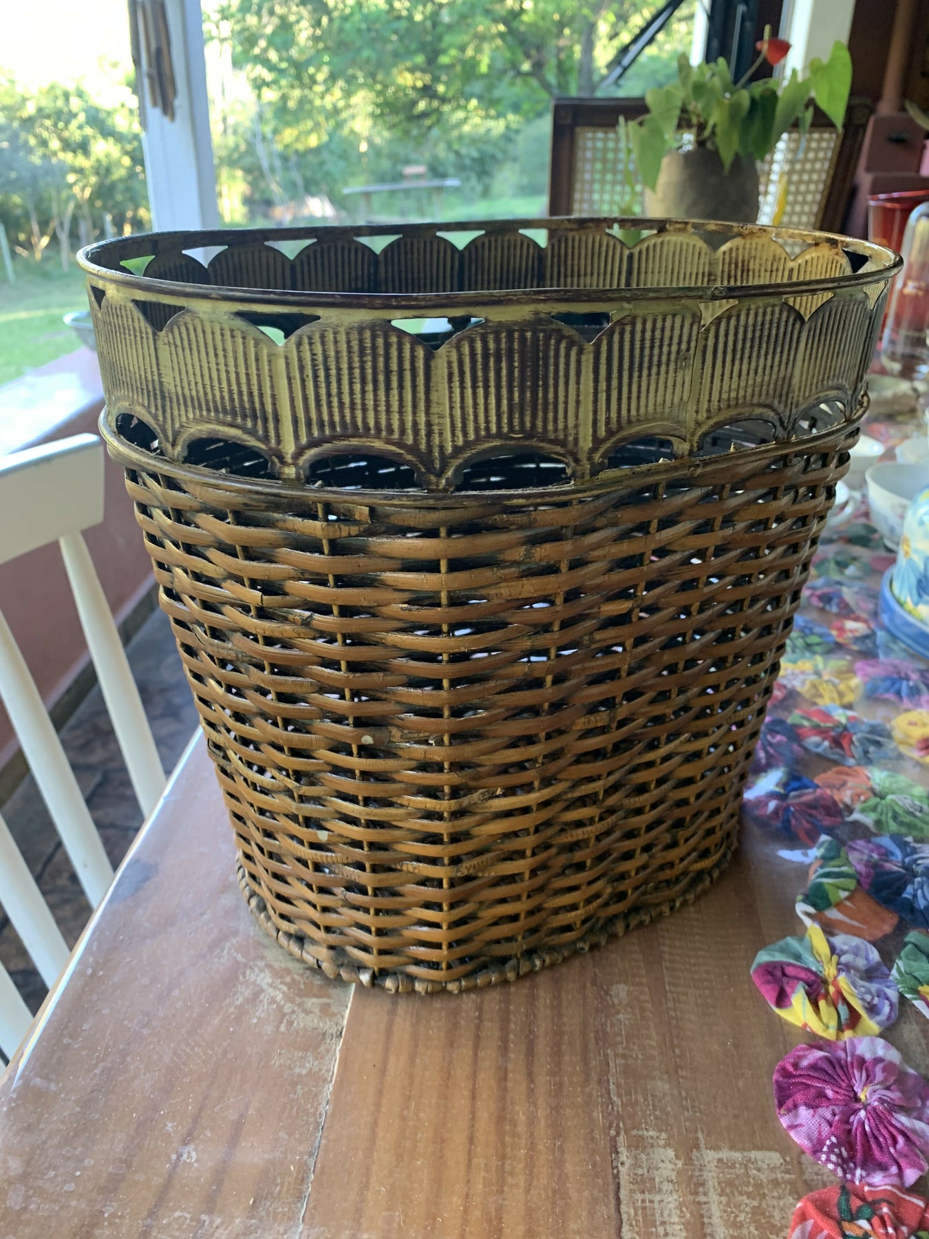 Impecável cesto em vime com detalhe em metal na borda. Pode servir como lixeira, porta guarda-chuva, cachepô, etc