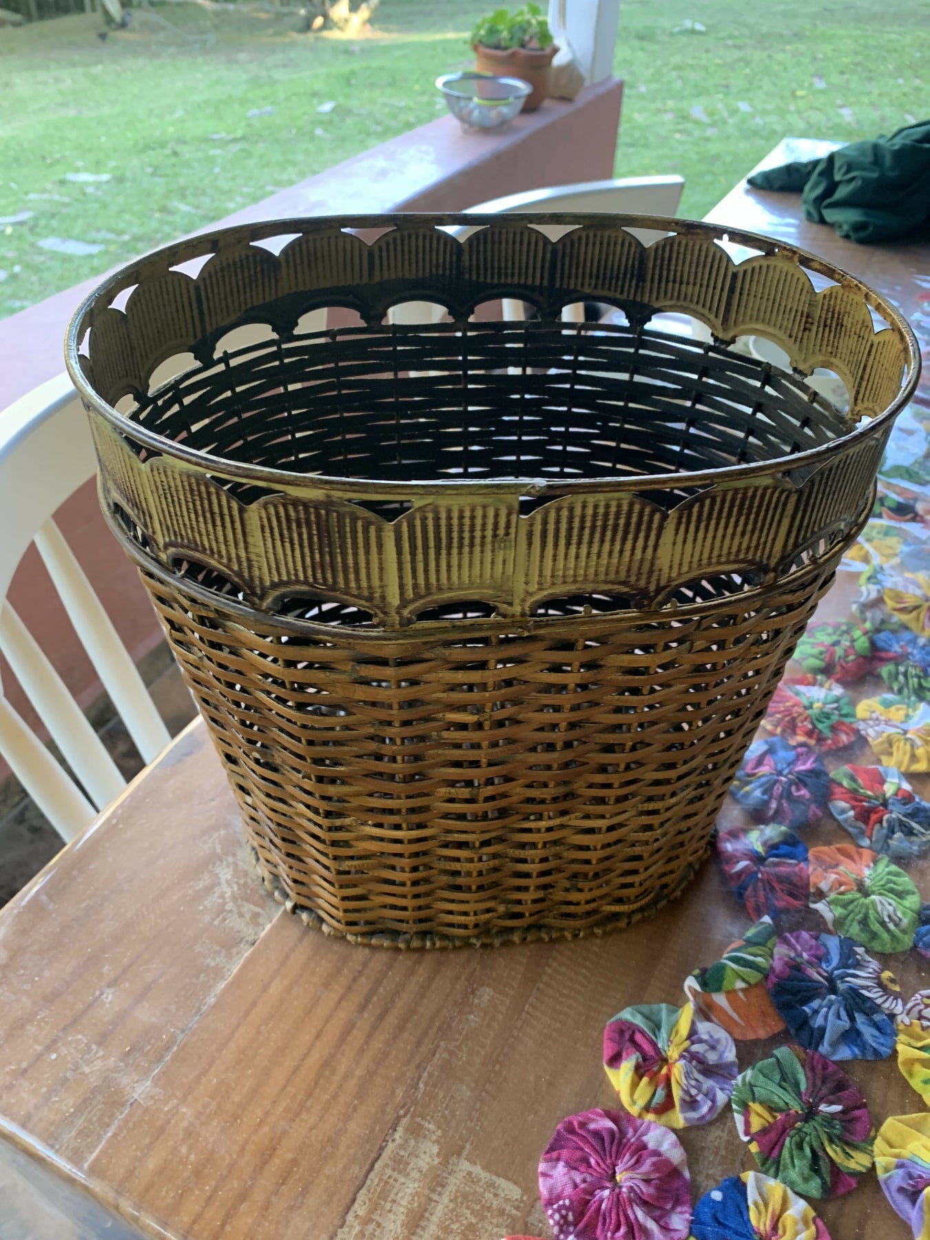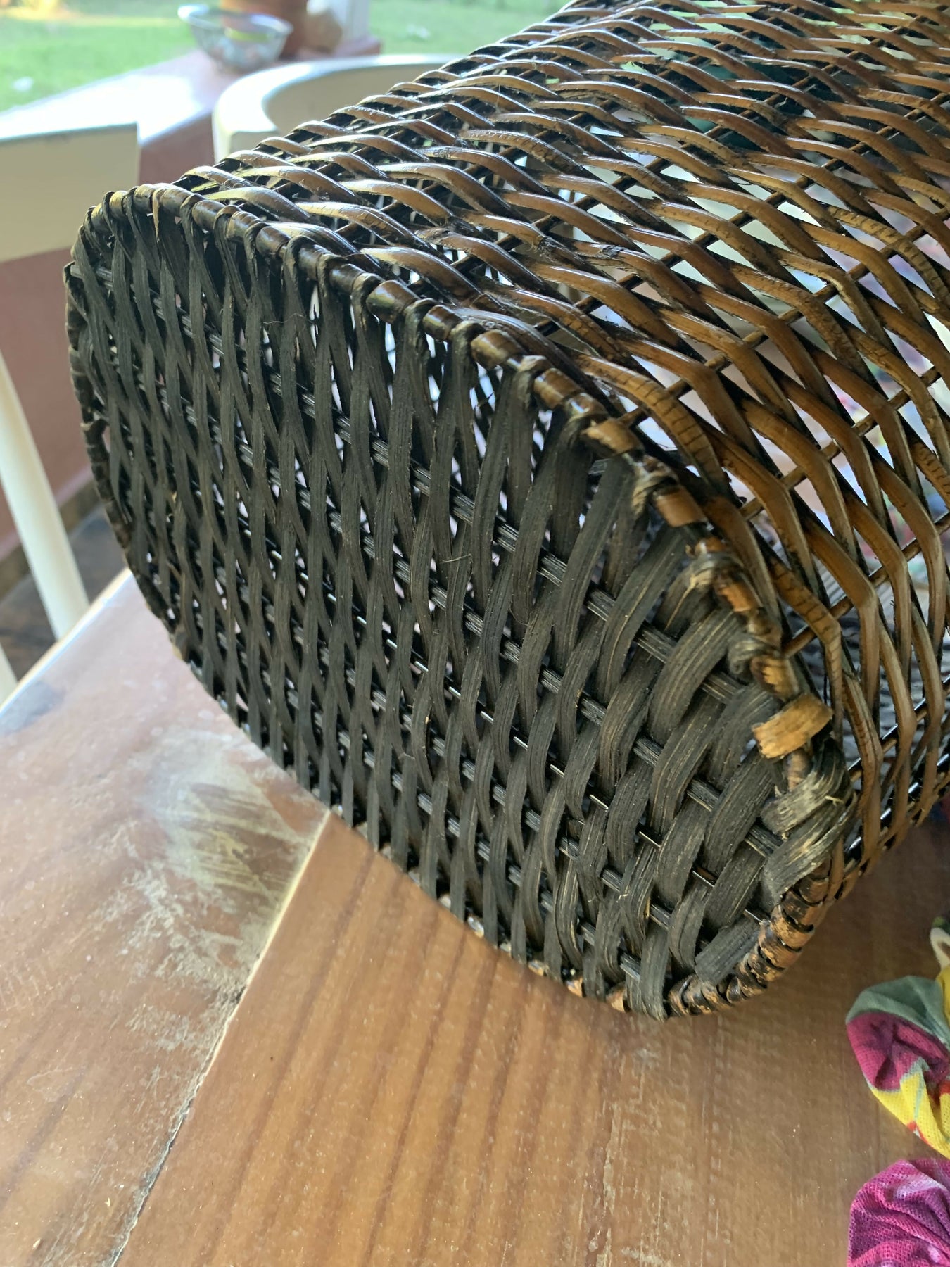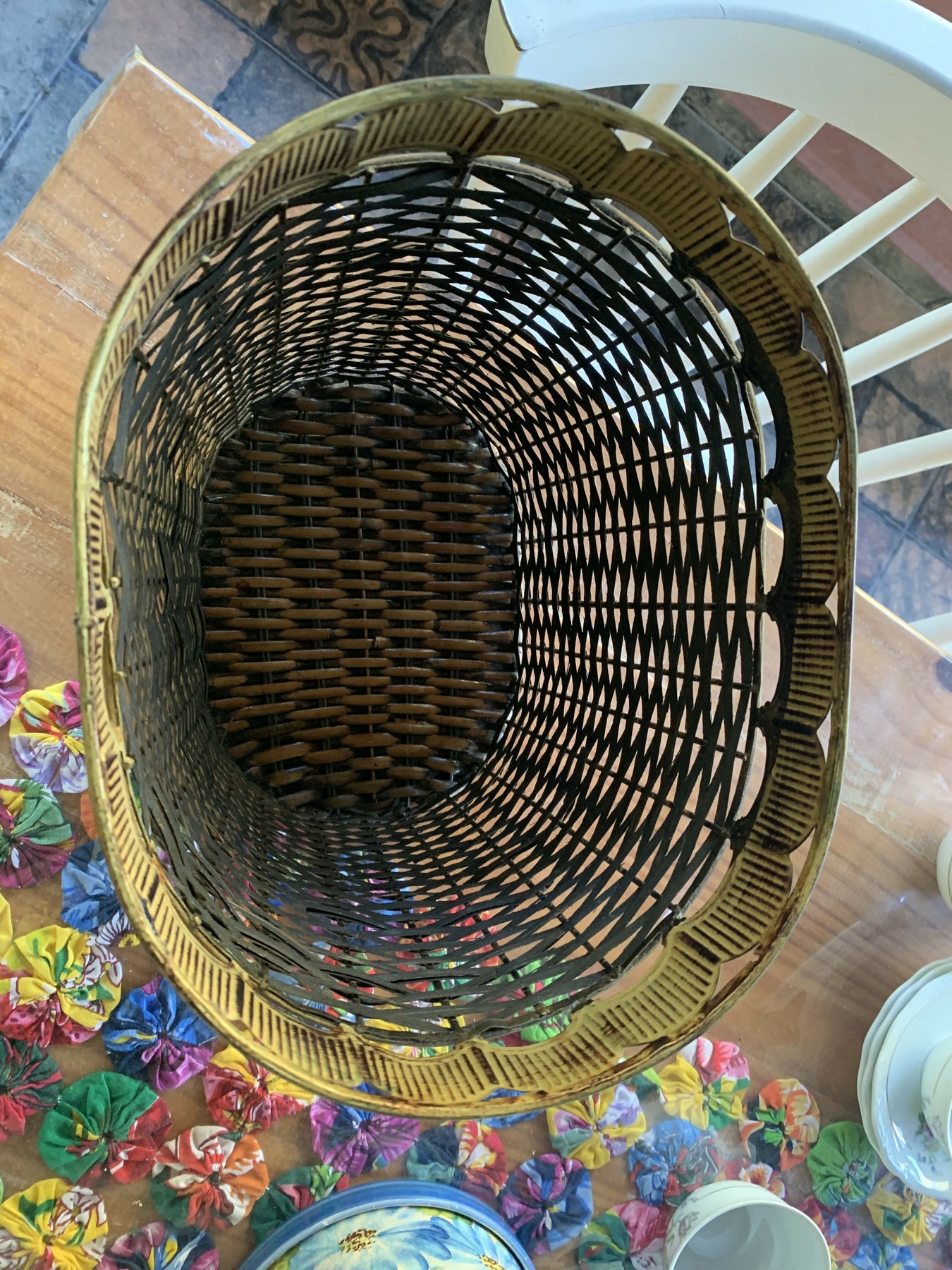 Impecável cesto em vime com detalhe em metal na borda. Pode servir como lixeira, porta guarda-chuva, cachepô, etc