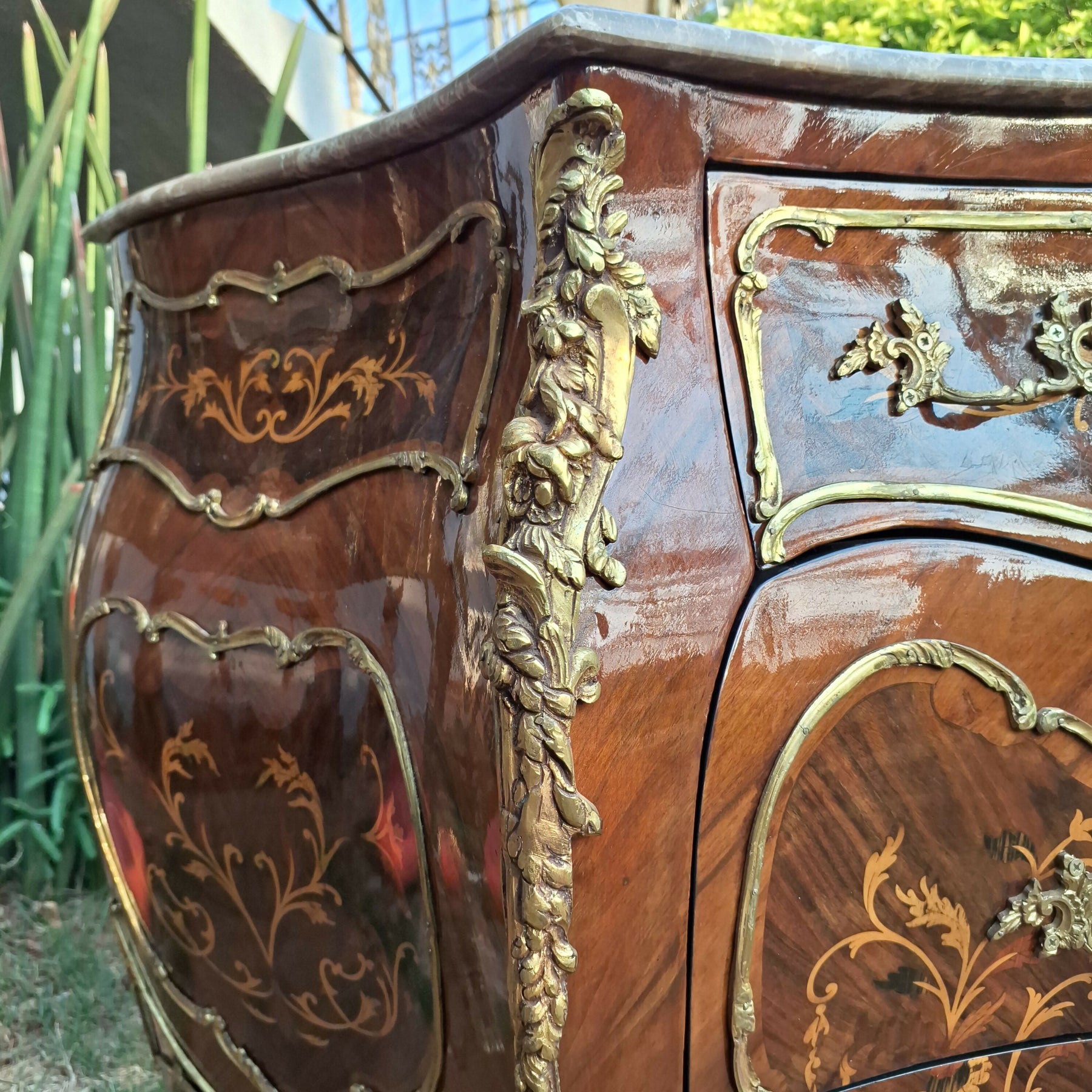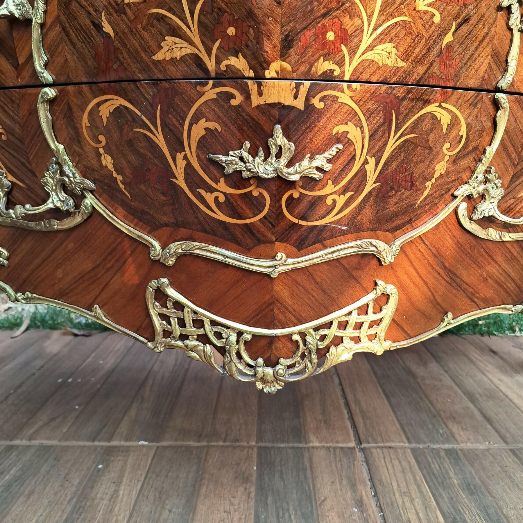 Belíssima Cômoda Bombê, rica em marchetaria, apliques de bronze , móvel em excelente estado de conservação, mede 1,23 x 0,58 e 0,92 altura