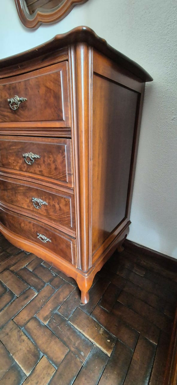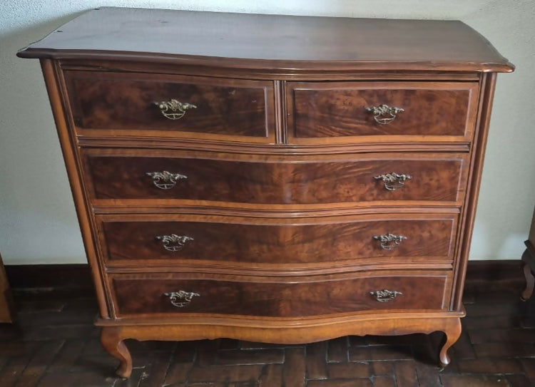 Cômoda estilo Luís XV, feita em madeira maciça, com entalhes artesanais nos pés. Puxadores originais.