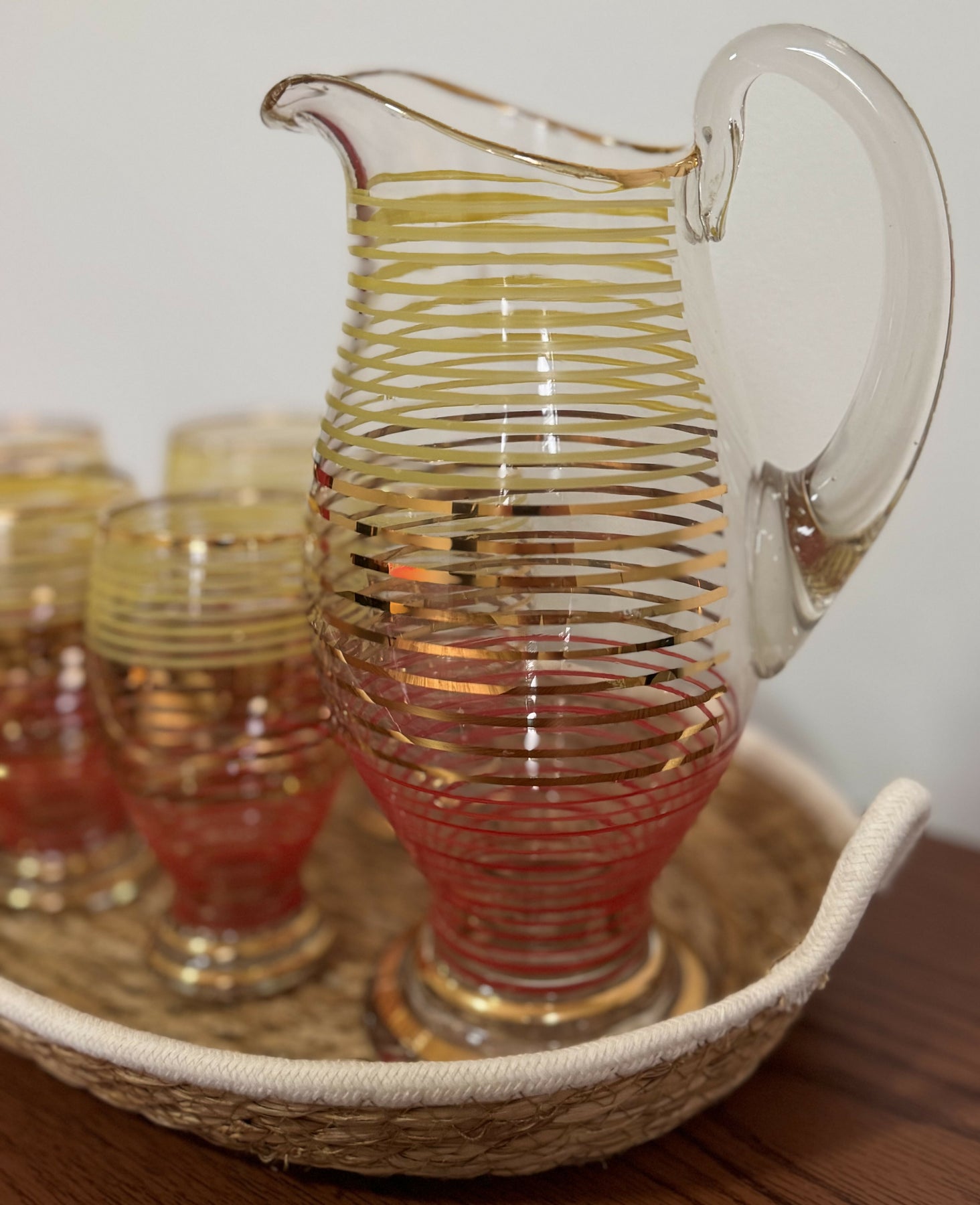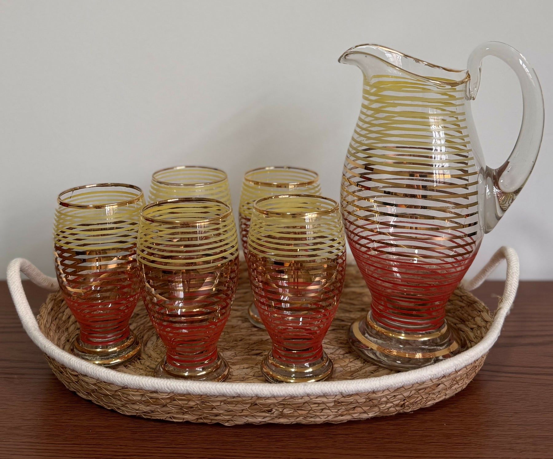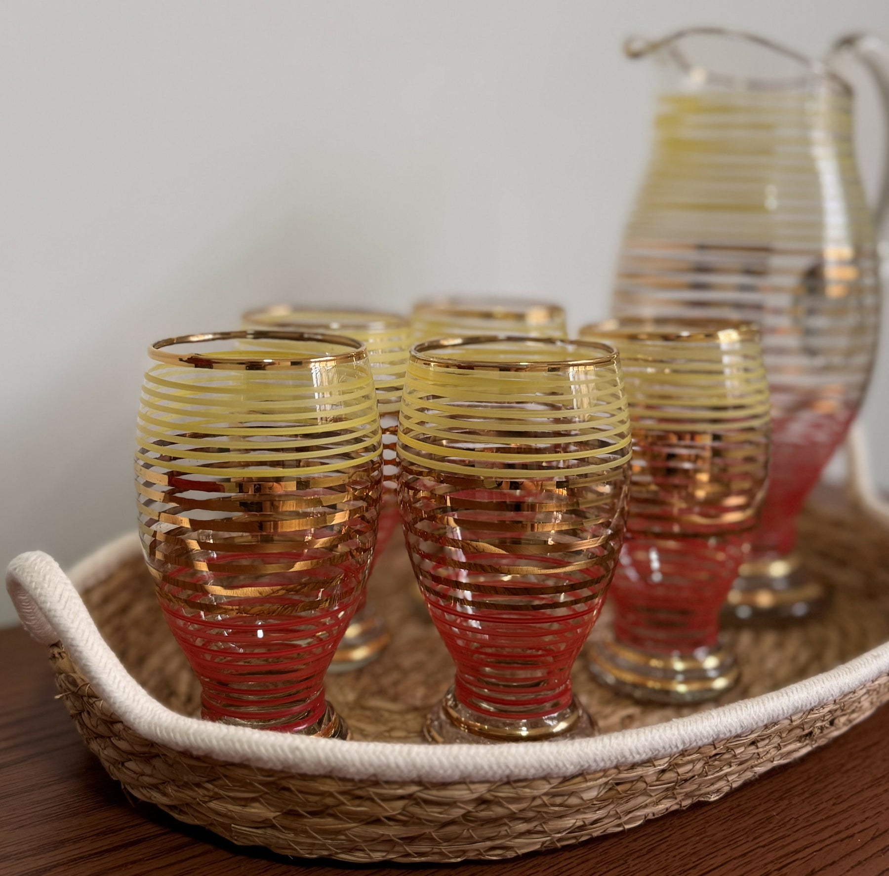 Conjunto de jarra e copos de vidro vintage de meados do século XX, comumente datado da década de 1950, com acabamento dourado e degradê quente que reflete a luz de maneira única.