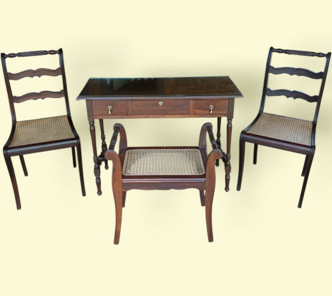 Mesa com tampo em vidro e gavetas funcionais, acompanhada de 1 banqueta e 2 cadeiras com assento em palhinha, confortáveis e resistentes.