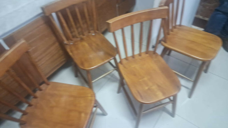Conjunto com 4 cadeiras em madeira maciça, com encosto de ripas verticais e assento levemente arredondado. Design simples e atemporal, com pegada colonial/rústica — ideais para sala de jantar, varanda gourmet ou casa de campo.