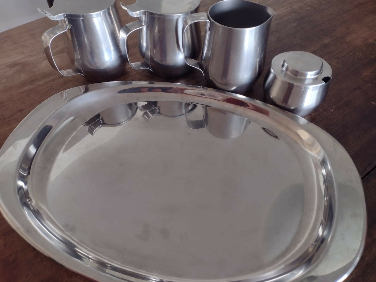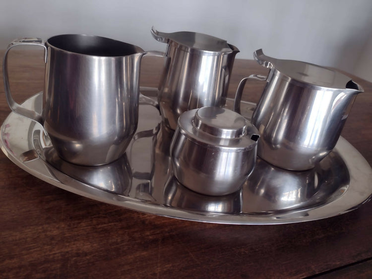 Baixela em inox de chá e café com 5 peças: Bandeja, bule com tampa para café, bule com tampa para chá, bule sem tampa para leite e açucareiro com tampa.