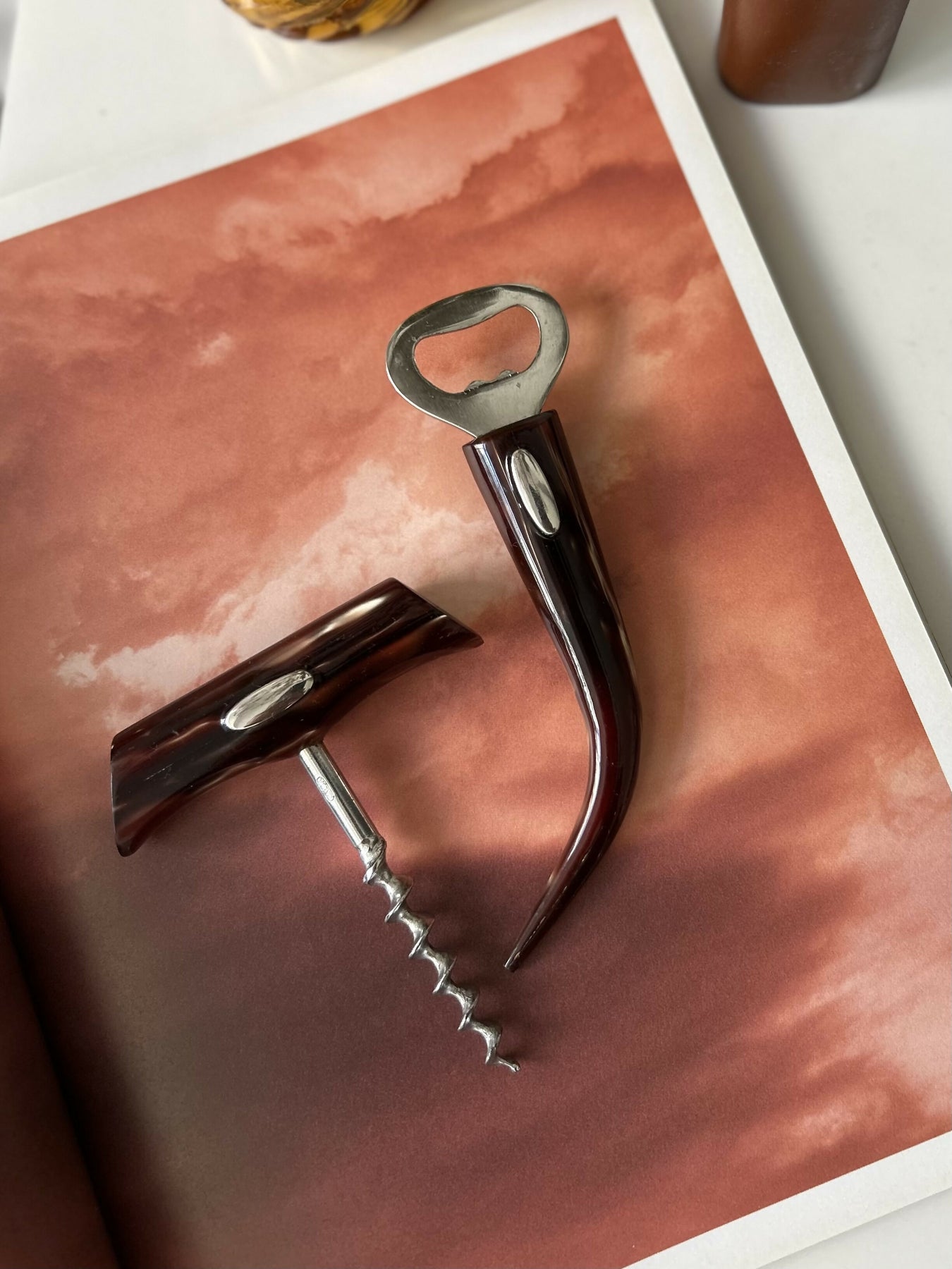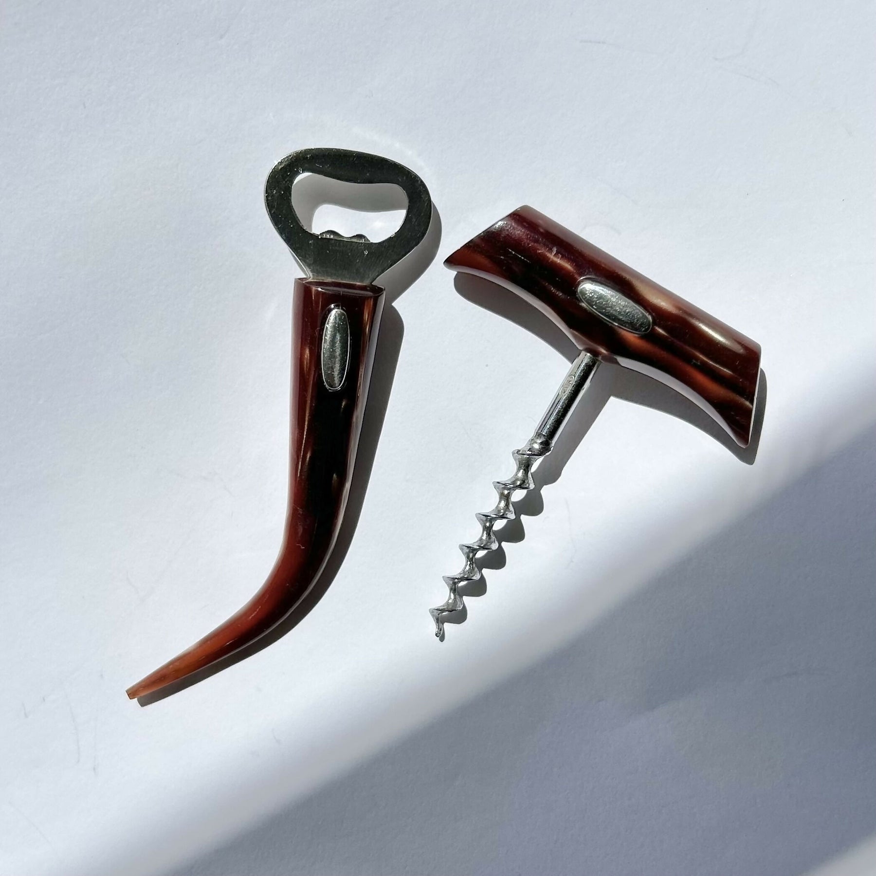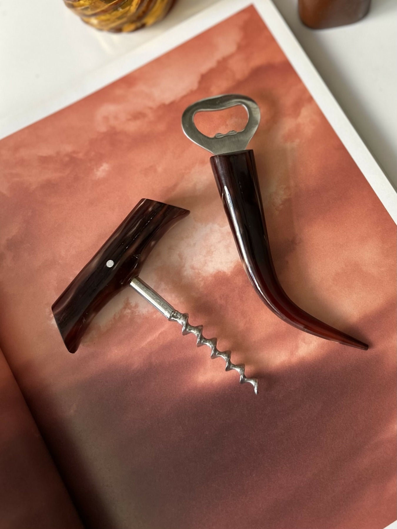 Duo de bar composto por abridor de garrafas e saca-rolhas, ambos com cabo em resina galalite imitanto chifre um clássico do design utilitário produzido entre as décadas de 1960 e 1970.