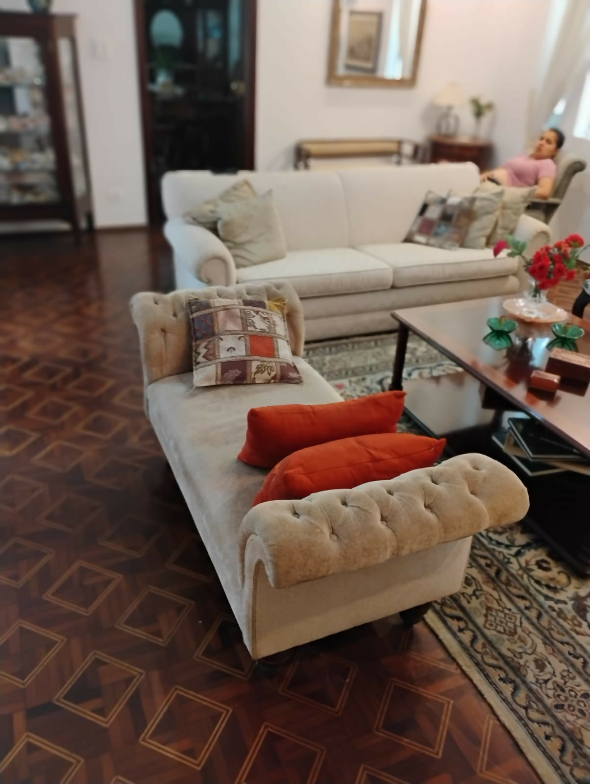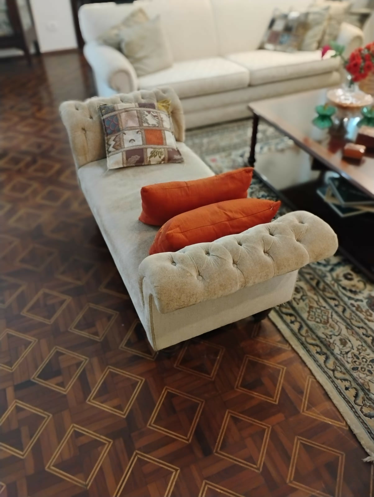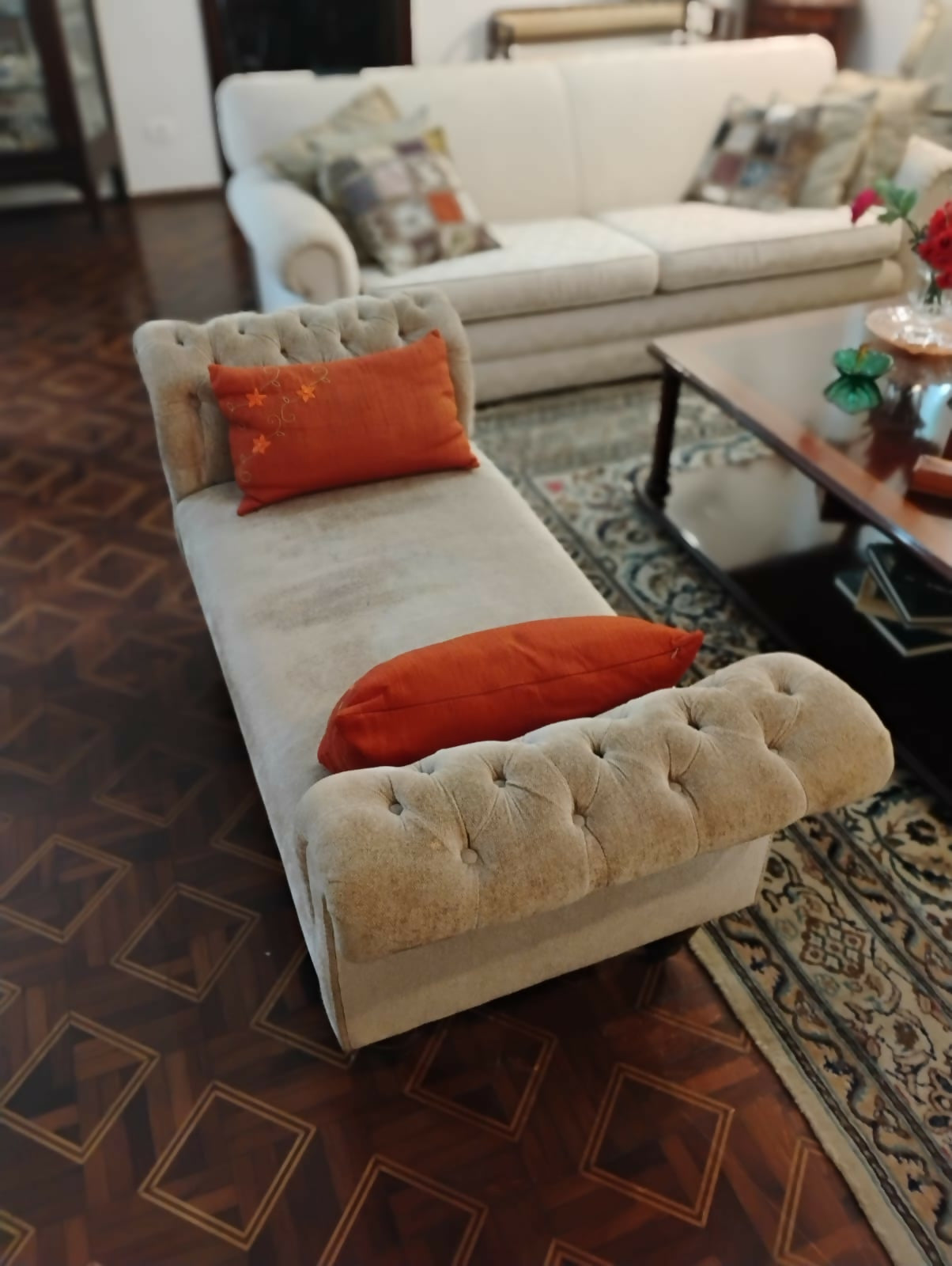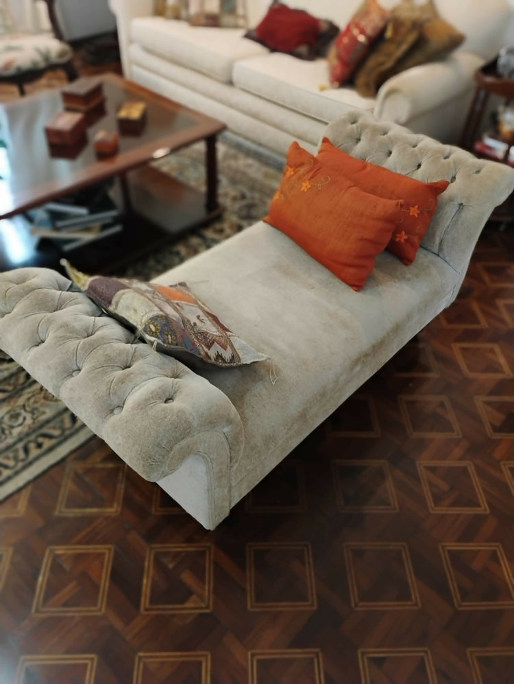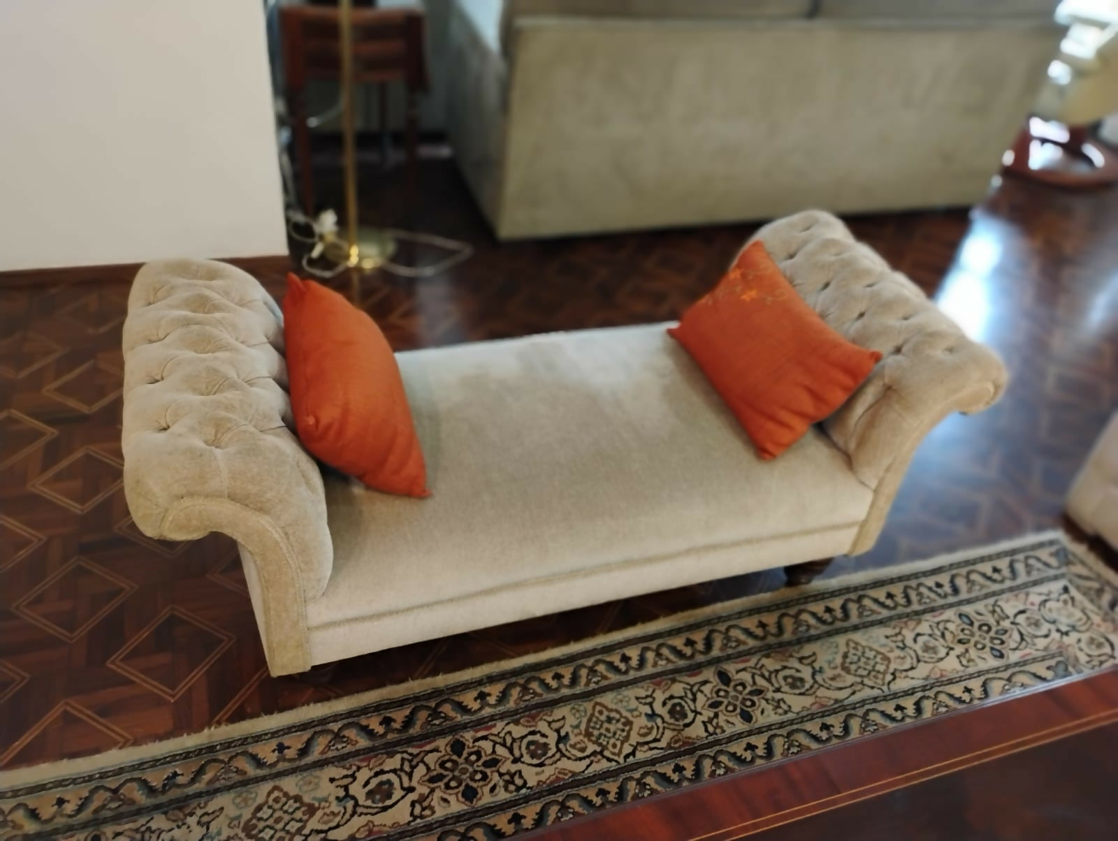 Divã em design clássico, de veludo, com detalhes de capitonê nos braços e encostos, e pernas de madeira esculpidas.