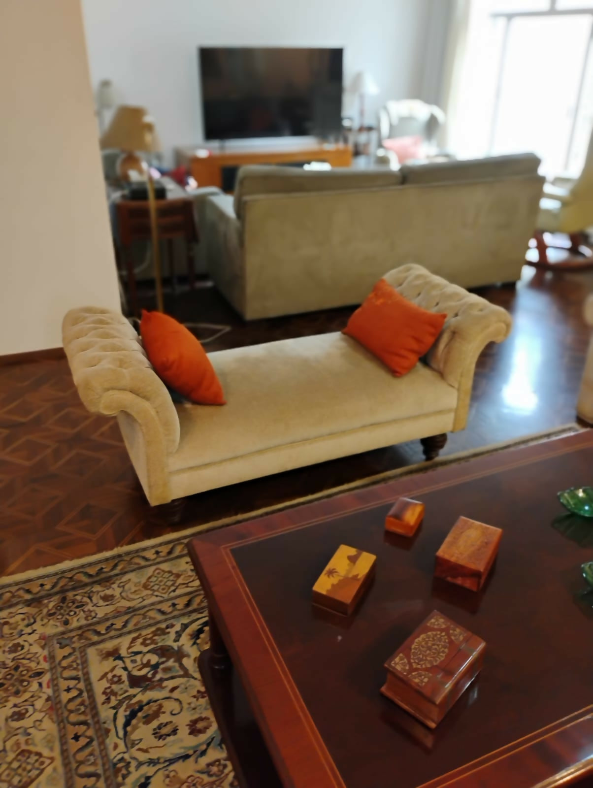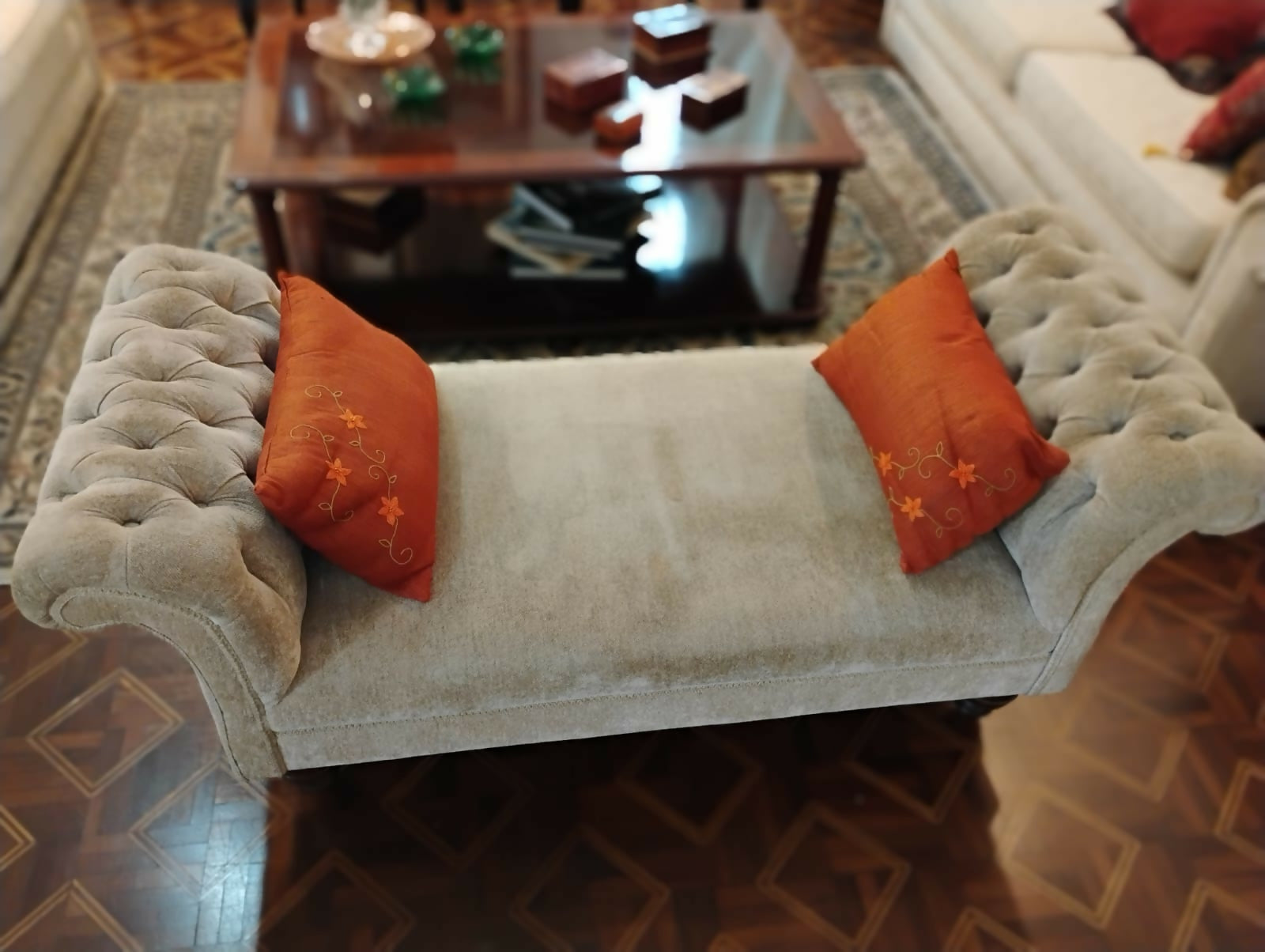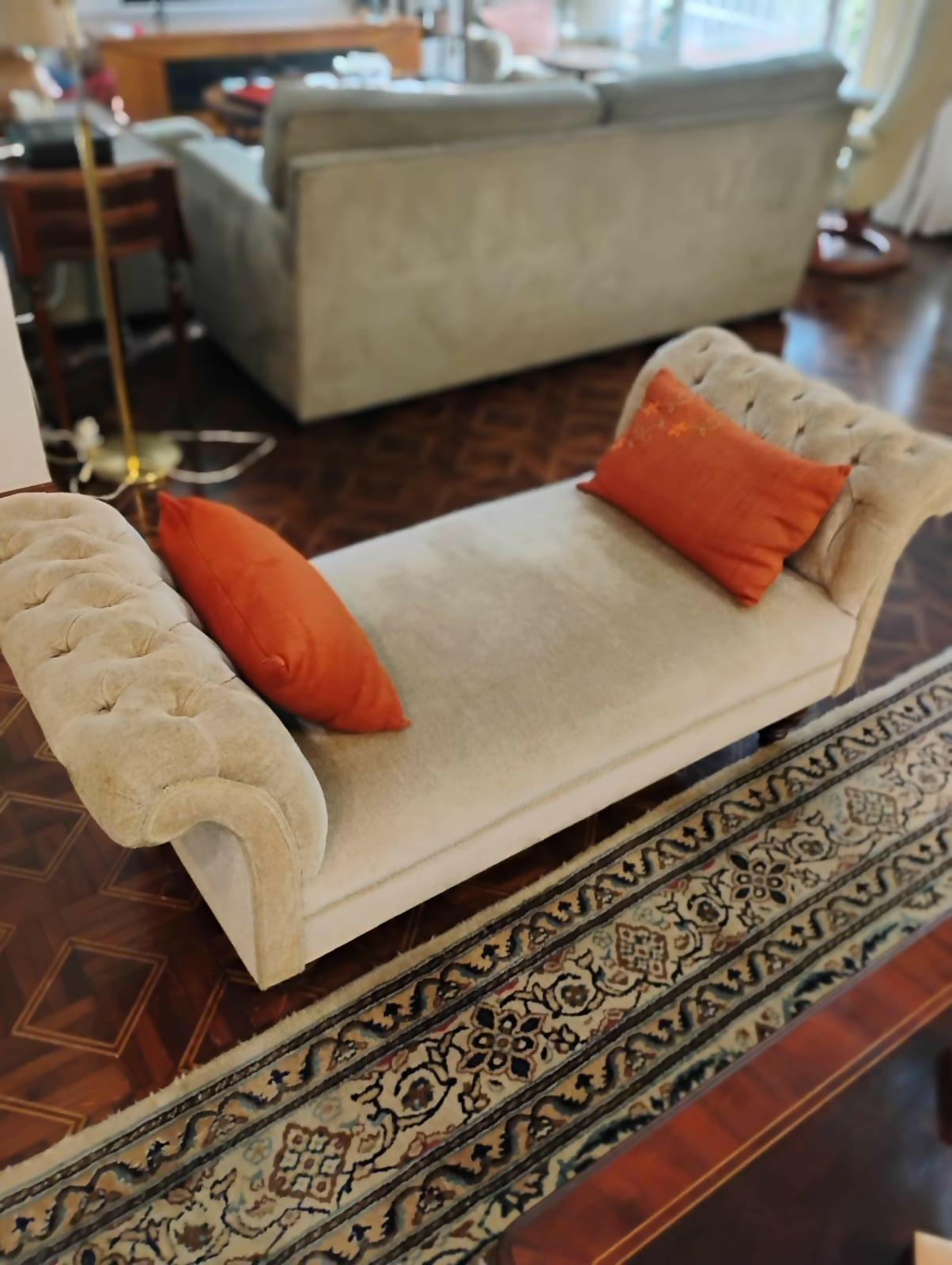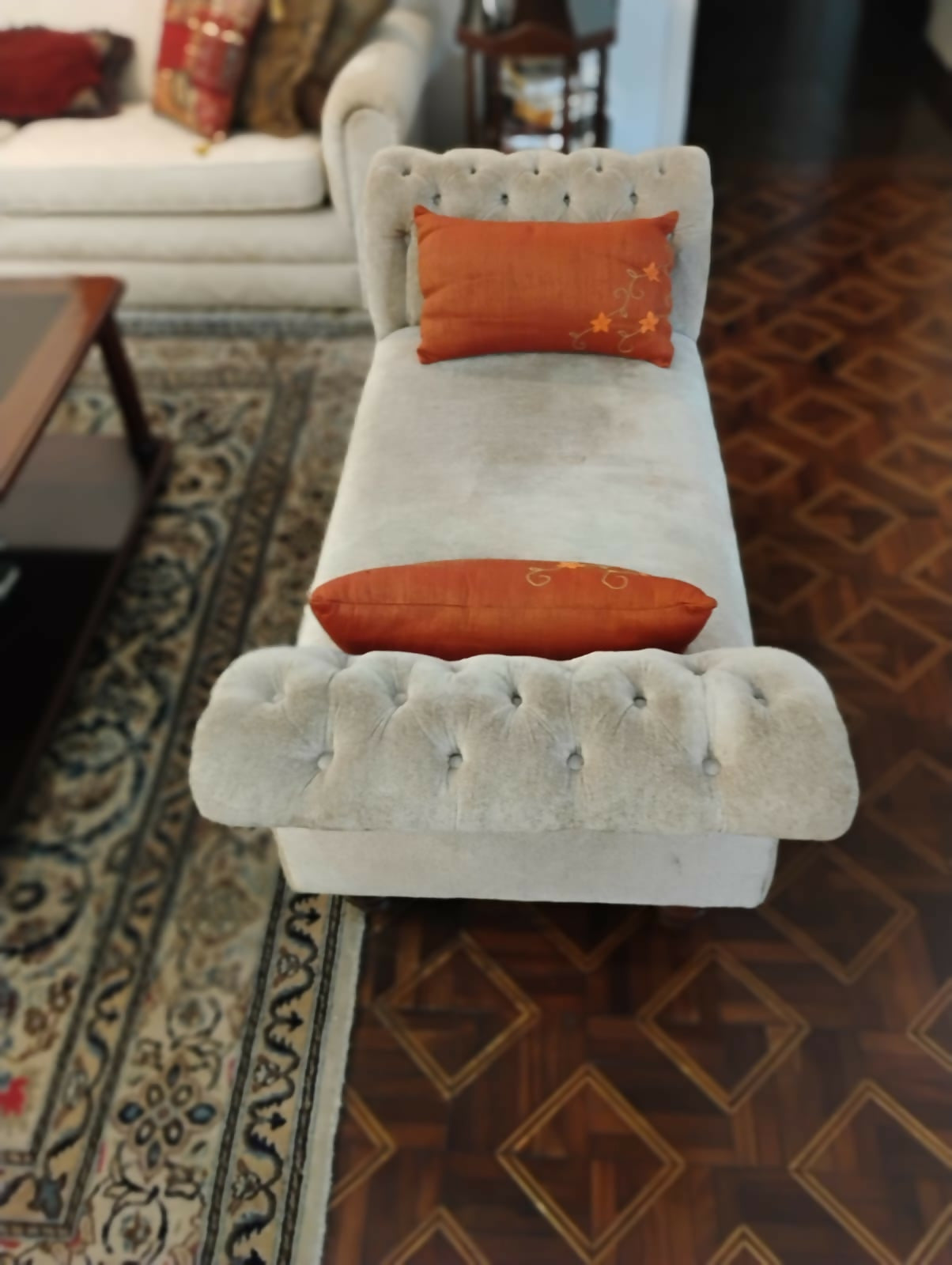 Divã em design clássico, de veludo, com detalhes de capitonê nos braços e encostos, e pernas de madeira esculpidas.