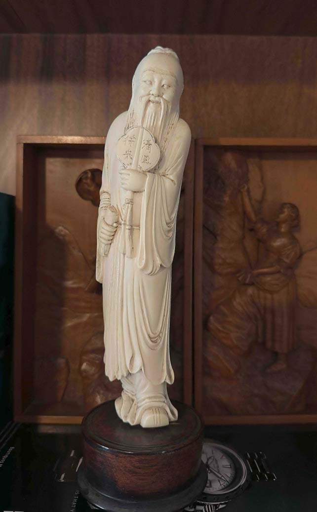 Escultura de marfim oriental, China séc. XX, representando um dos sábios da felicidade segurando placa com mensagem, e um papiro. Com a base mede 27,5 cm de altura.