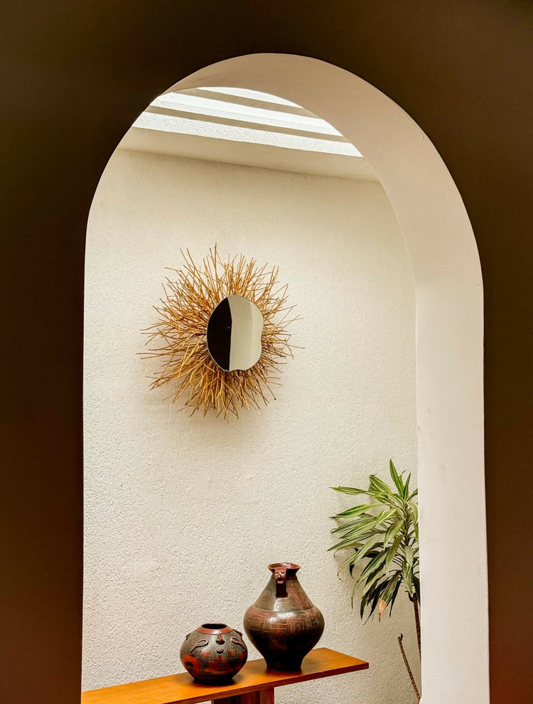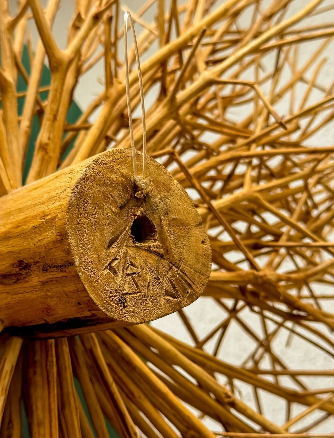 Neste espelho de parede, José Abias transforma a matéria em gesto escultórico. A composição radial em hastes naturais cria um volume orgânico que extrapola o plano da parede, fazendo do espelho um objeto de presença e não apenas de reflexo.