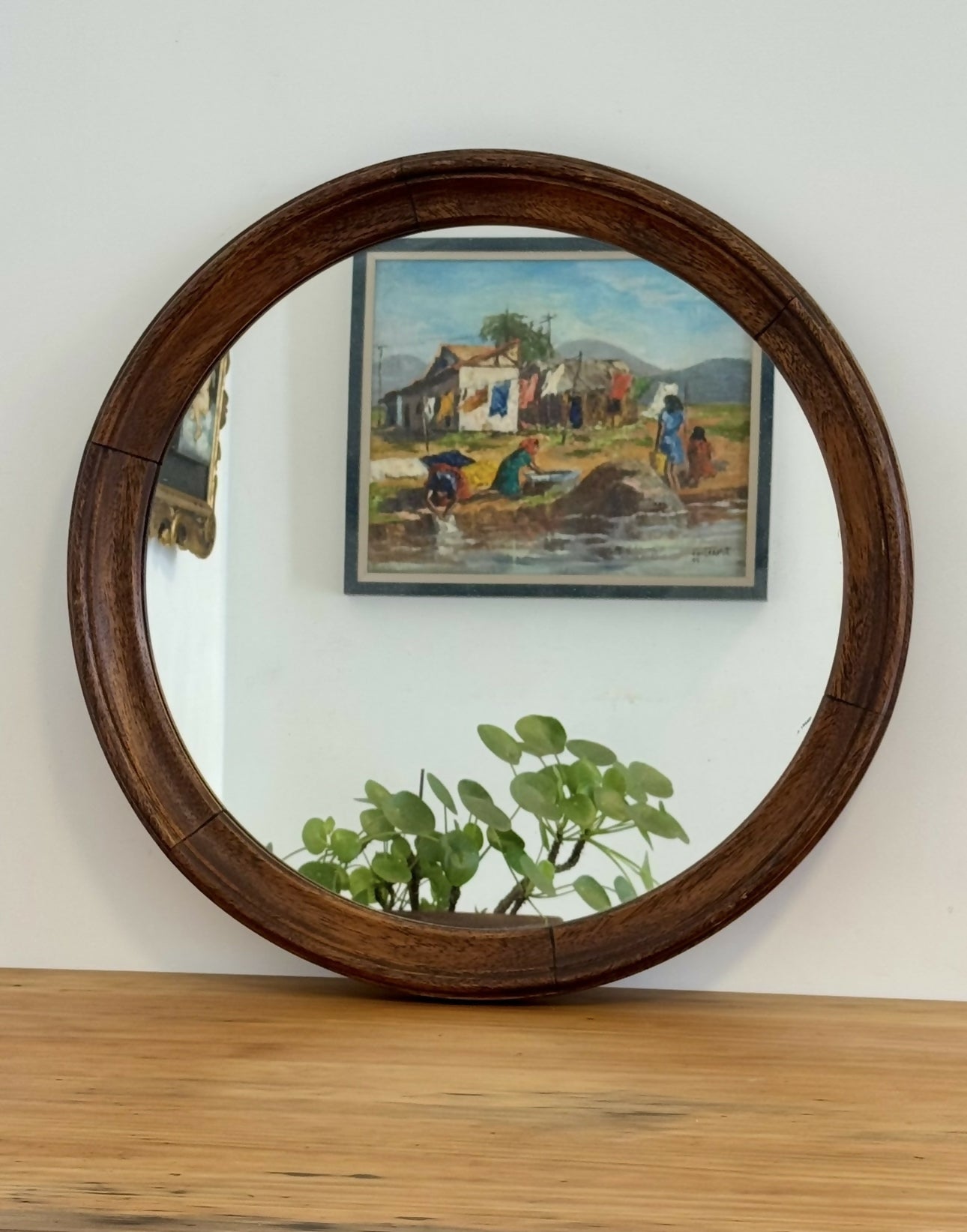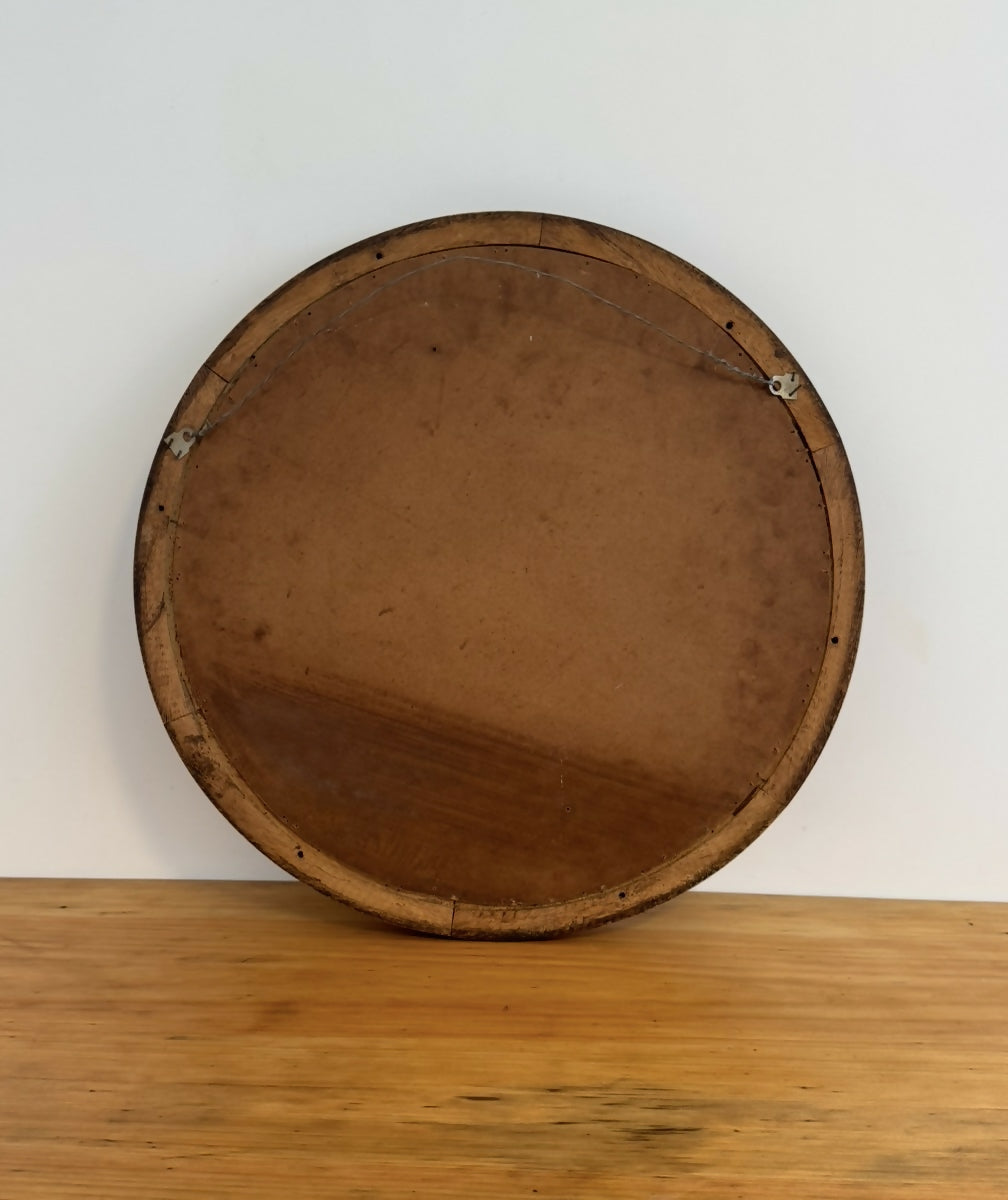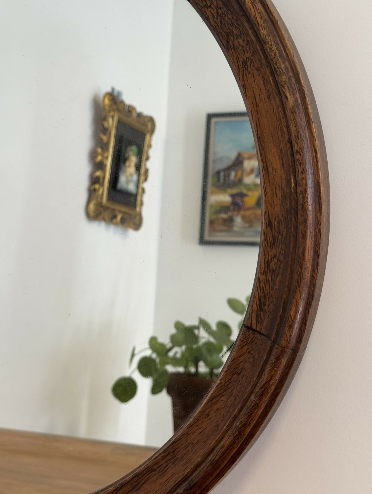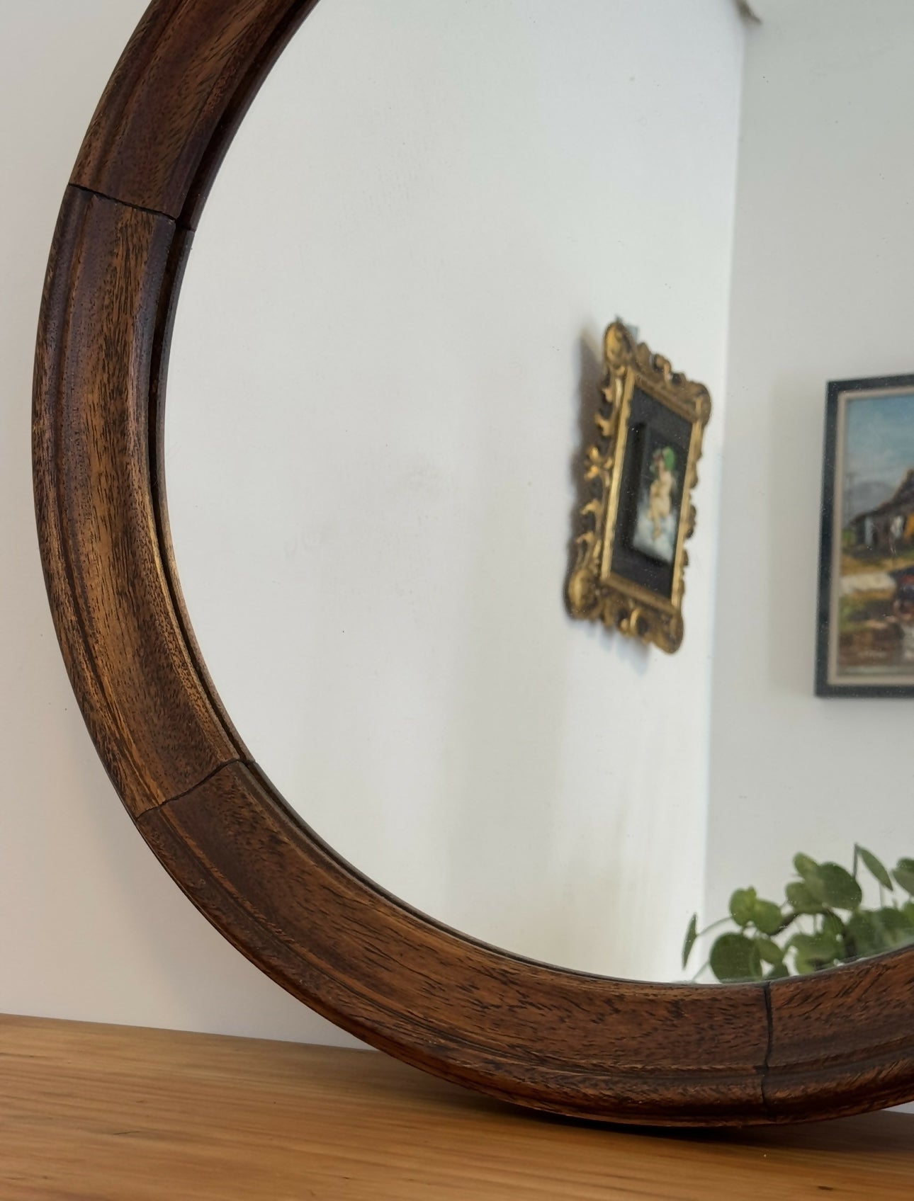Magnífico espelho redondo anos 60/70, peça perfeita para composição de ambientes como hall, lavabo e sala, peça toda original em madeira nobre, espelho e fechamento de fundo originais, peça em ótimo estado de conservação, possui 52cm de diâmetro e 4cm de espessura.