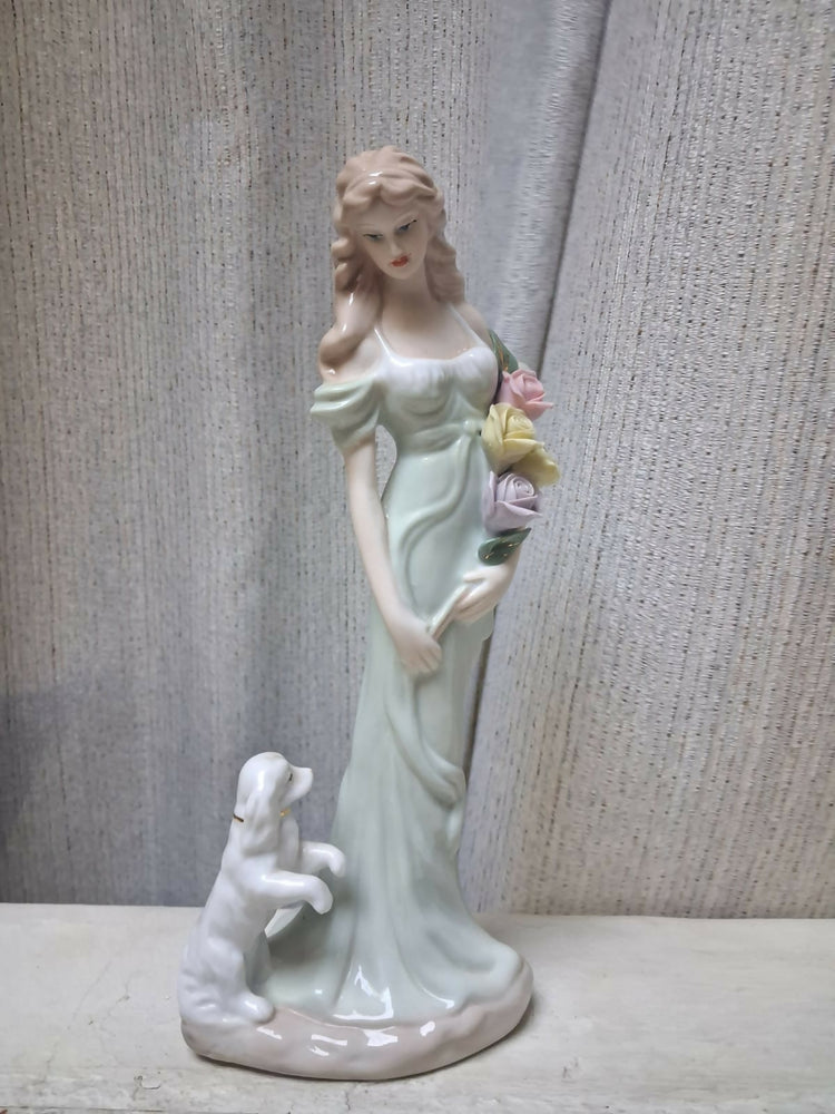 Estátua de porcelana - Mulher com vestido verde e cachorrinho